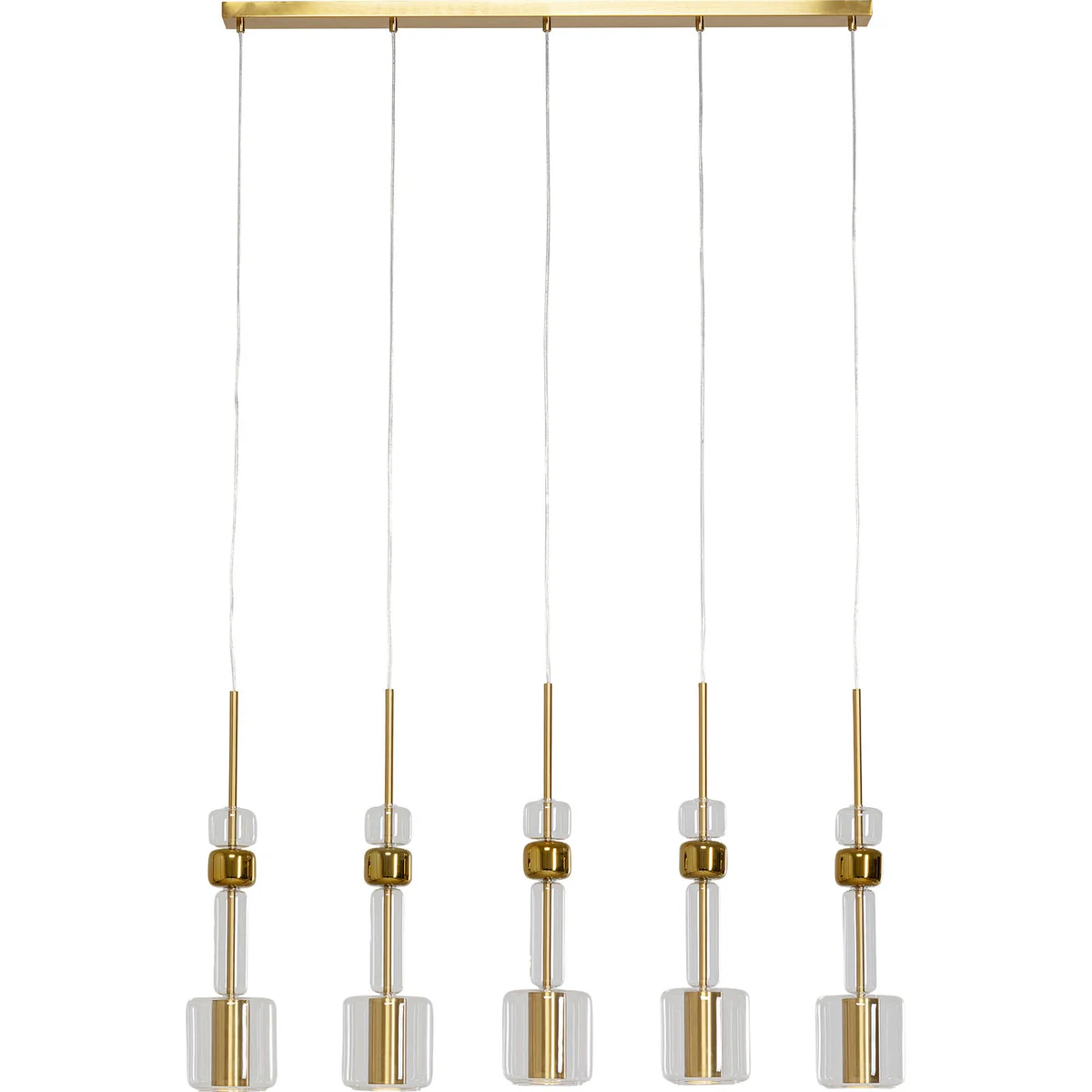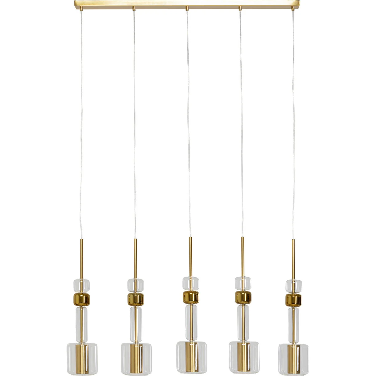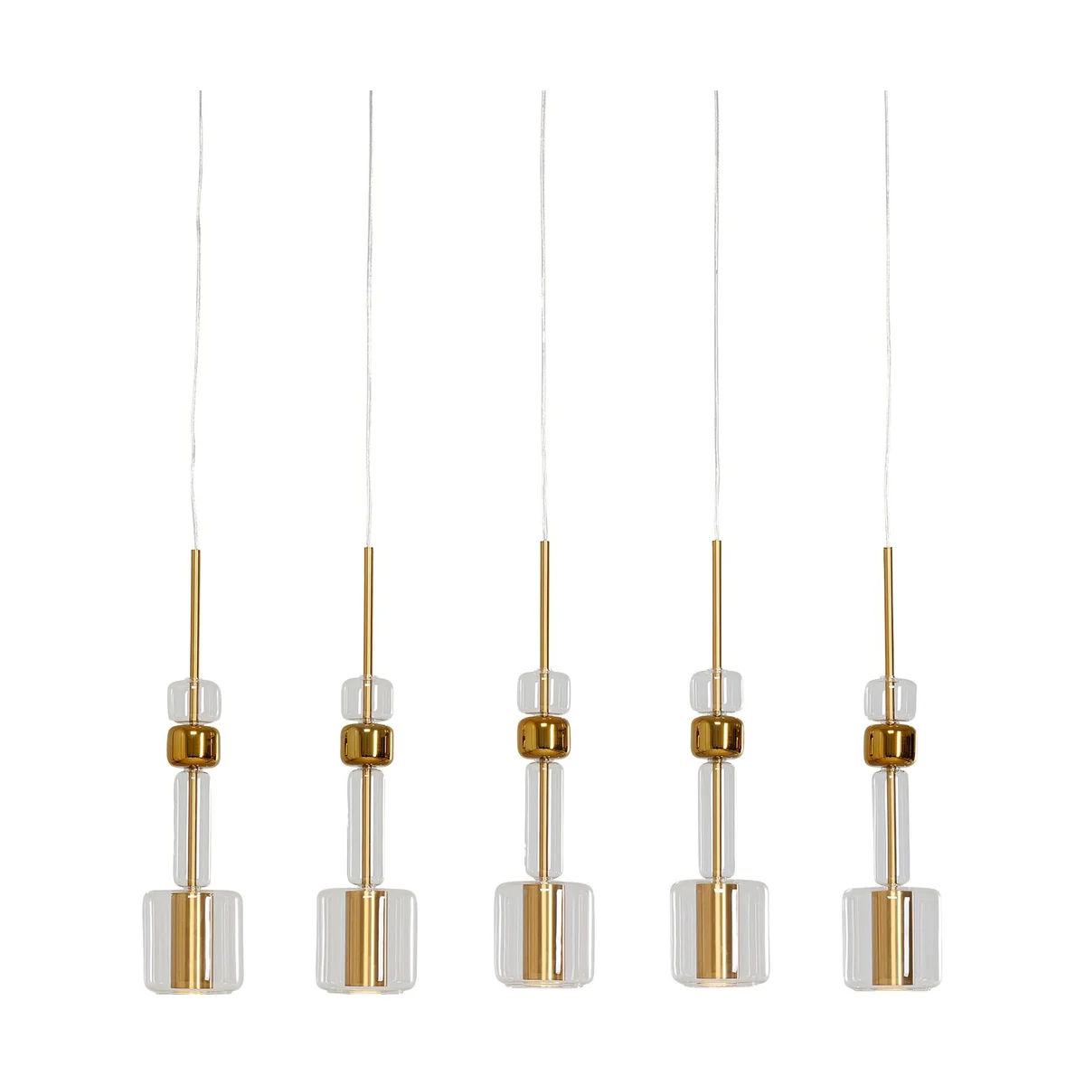 • Delicate glass hanging lamp with gold accents, 60 x 103 x 13 centimeters (H/W/D) • Height-adjustable from 60 - 212 cm and therefore easy to integrate into your living environment • A decorative solution for stylish lighting above the dining table • The five spotlights emit their light downwards in a targeted manner • 230 V, GU10 socket, number of bulbs 5, max. 5 watts, bulbs not included