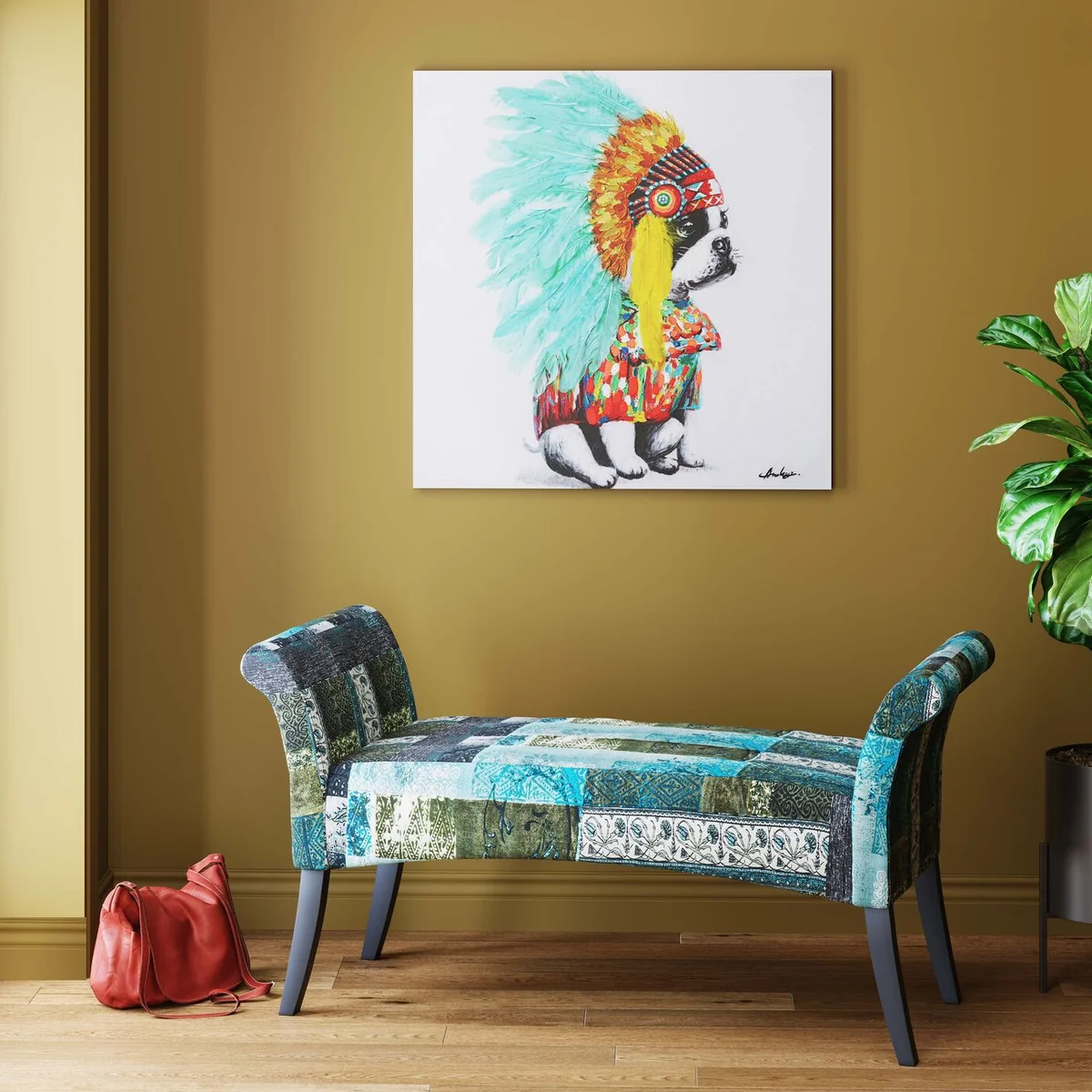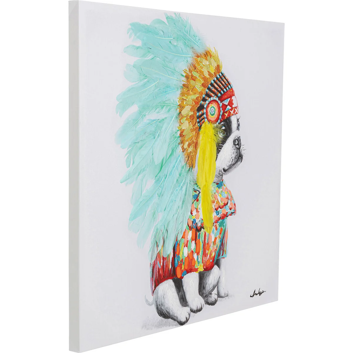 Standing at dimensions of 80x80 cm with a depth of 3.5 cm, this canvas picture features a vibrant image of a dog wearing a colorful headdress. Made from high-quality polyester canvas, it promises durability and longevity. The multicolored design adds a pop of color to any space, making it a striking focal point.