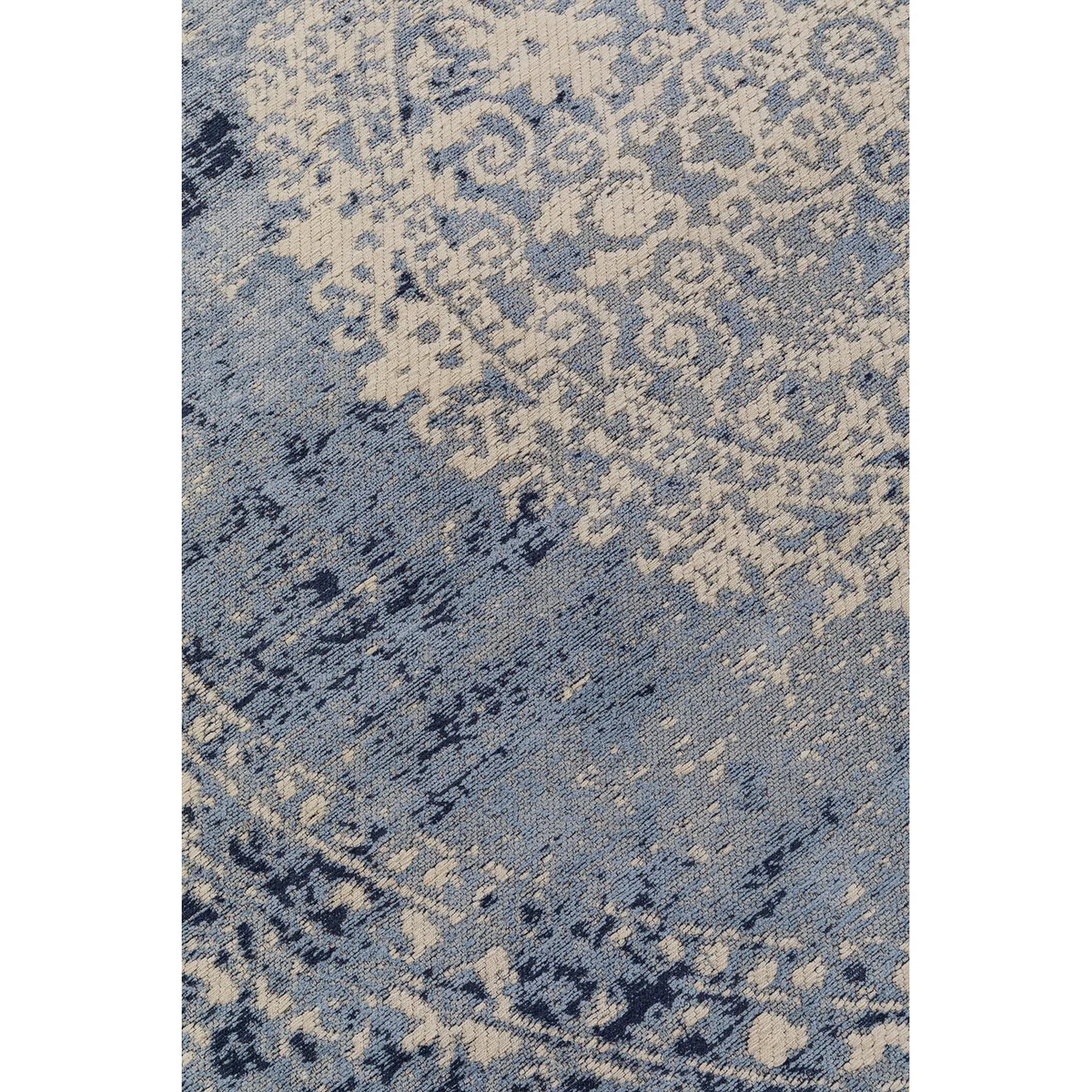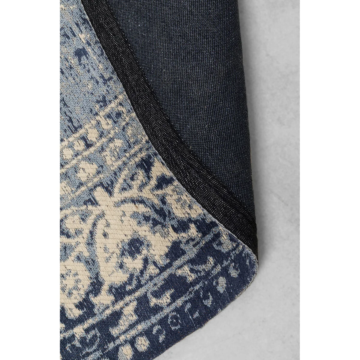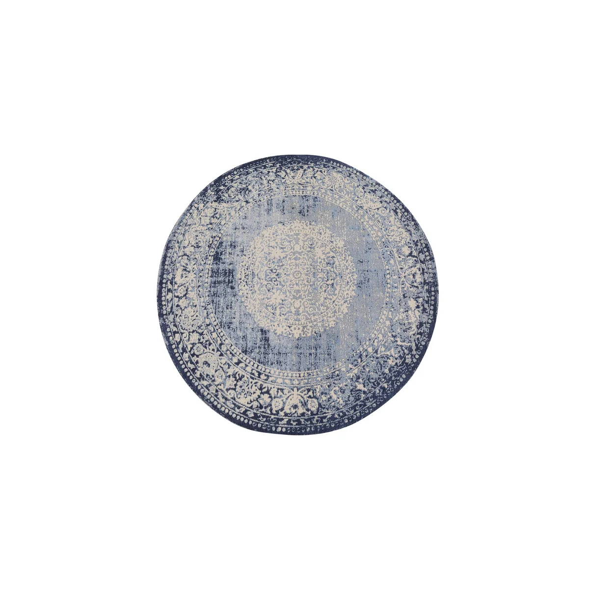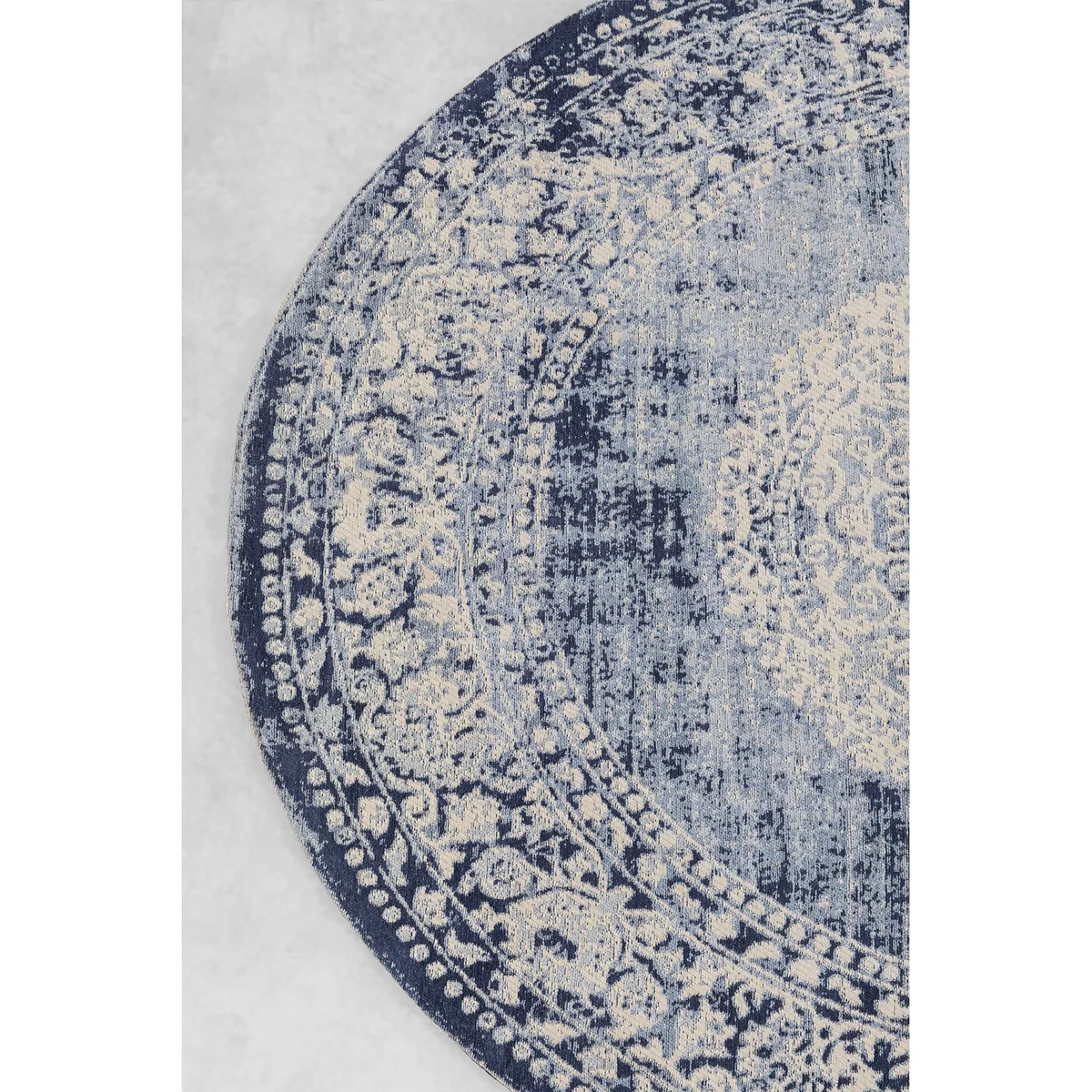• Large, round rug in blue, diameter 200 cm • A vintage-style rug with a pattern in cream and blue featuring deliberate stone-washed effects • The high cotton content makes this woven rug pleasant to the touch • Round carpets give the dining area a special radiance and harmoniously complement the corner sofa • Whether round or square, carpets always optimise the sense of space and dampen sound