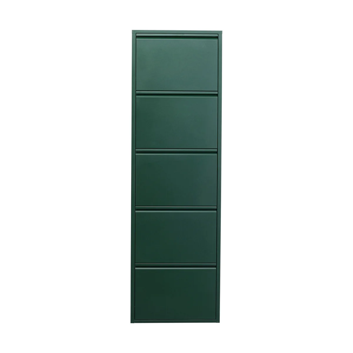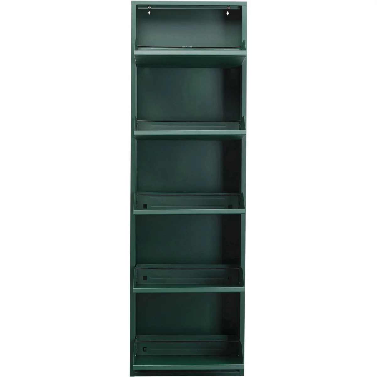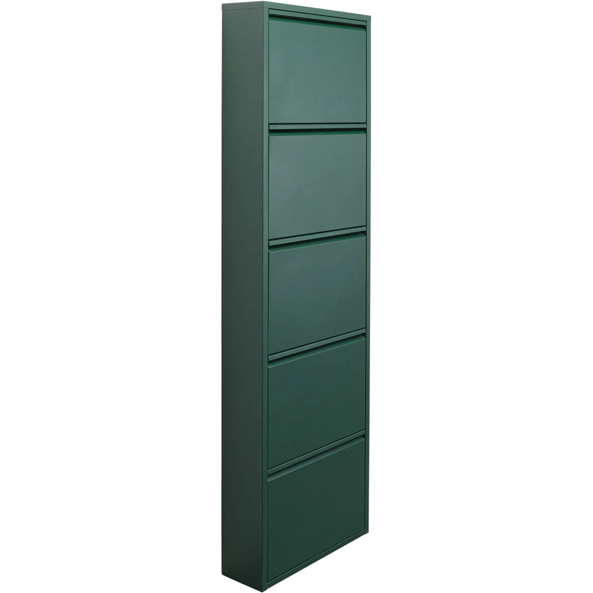 The Caruso Five Shoe Cabinet in green steel offers a stylish solution for shoe storage in your hallway or bedroom. Its slim design is perfect for homes with limited space.