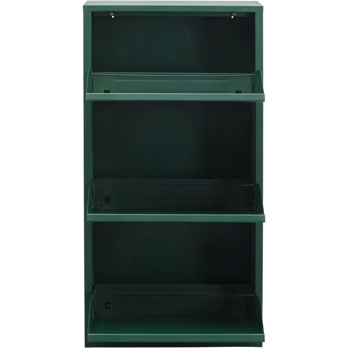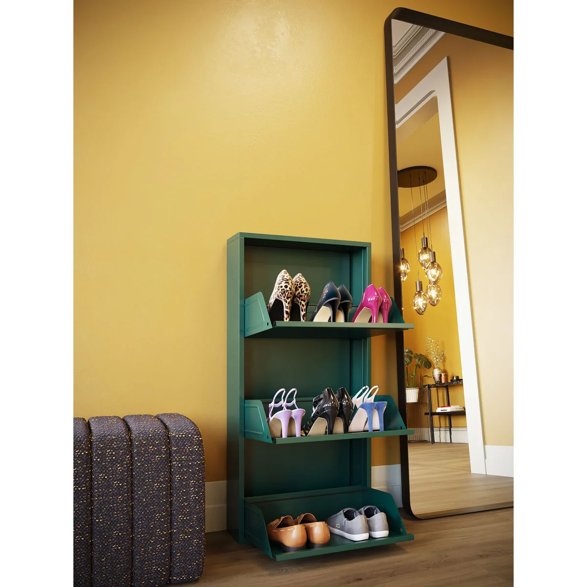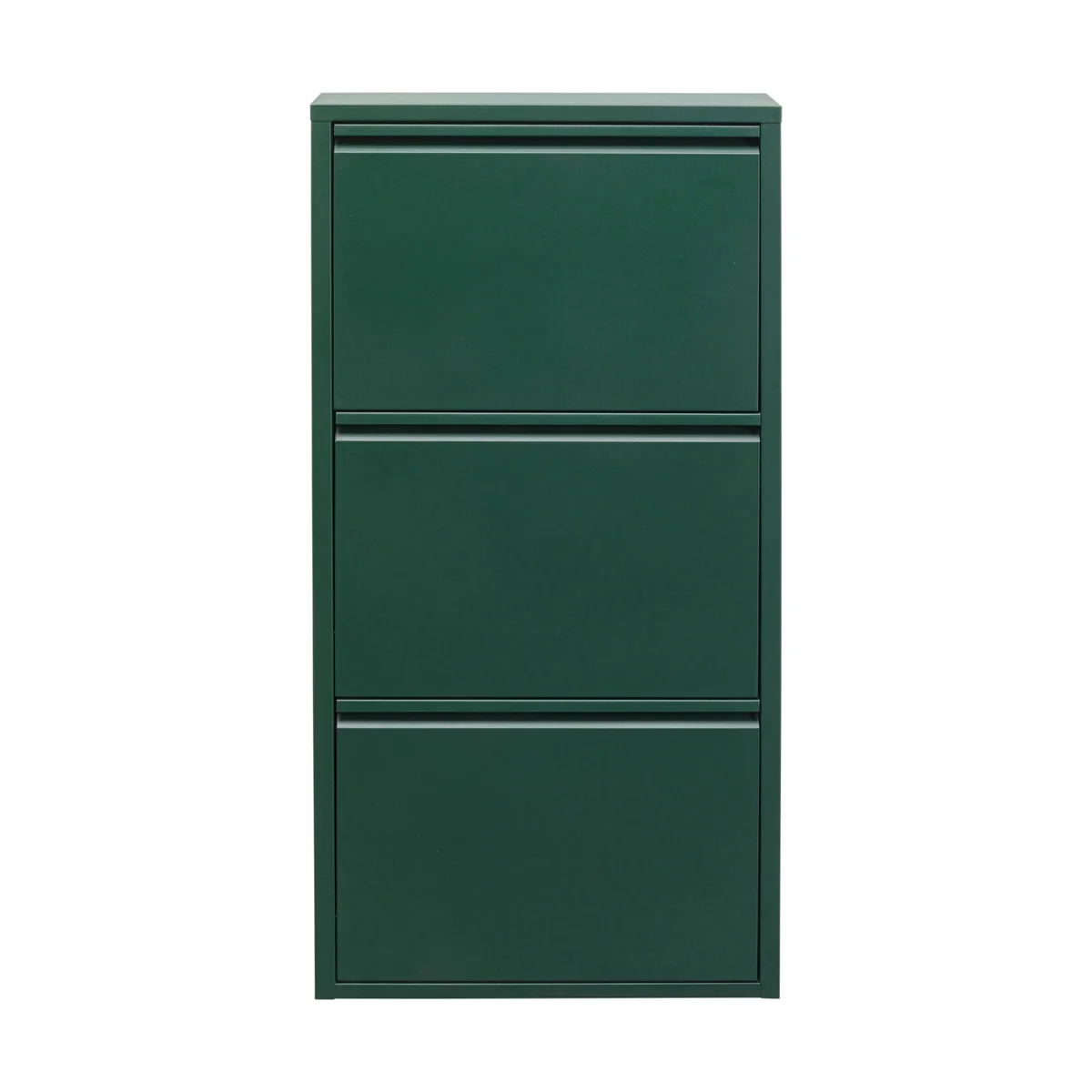• Metal shoe cabinet in green, 103 x 50 x 15 cm (H/W/D) • With three tilting compartments that protect shoes from dust and prying eyes • Offers space for at least six pairs of shoes, depending on size and model • This shoe cabinet helps to keep things tidy even when space is limited, as it is o