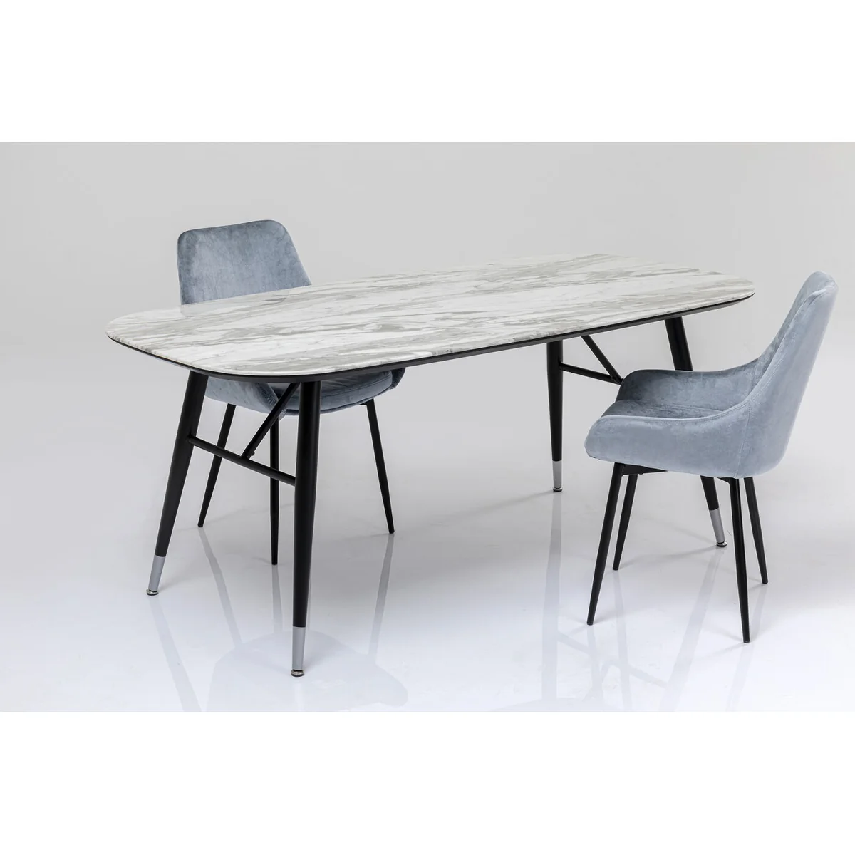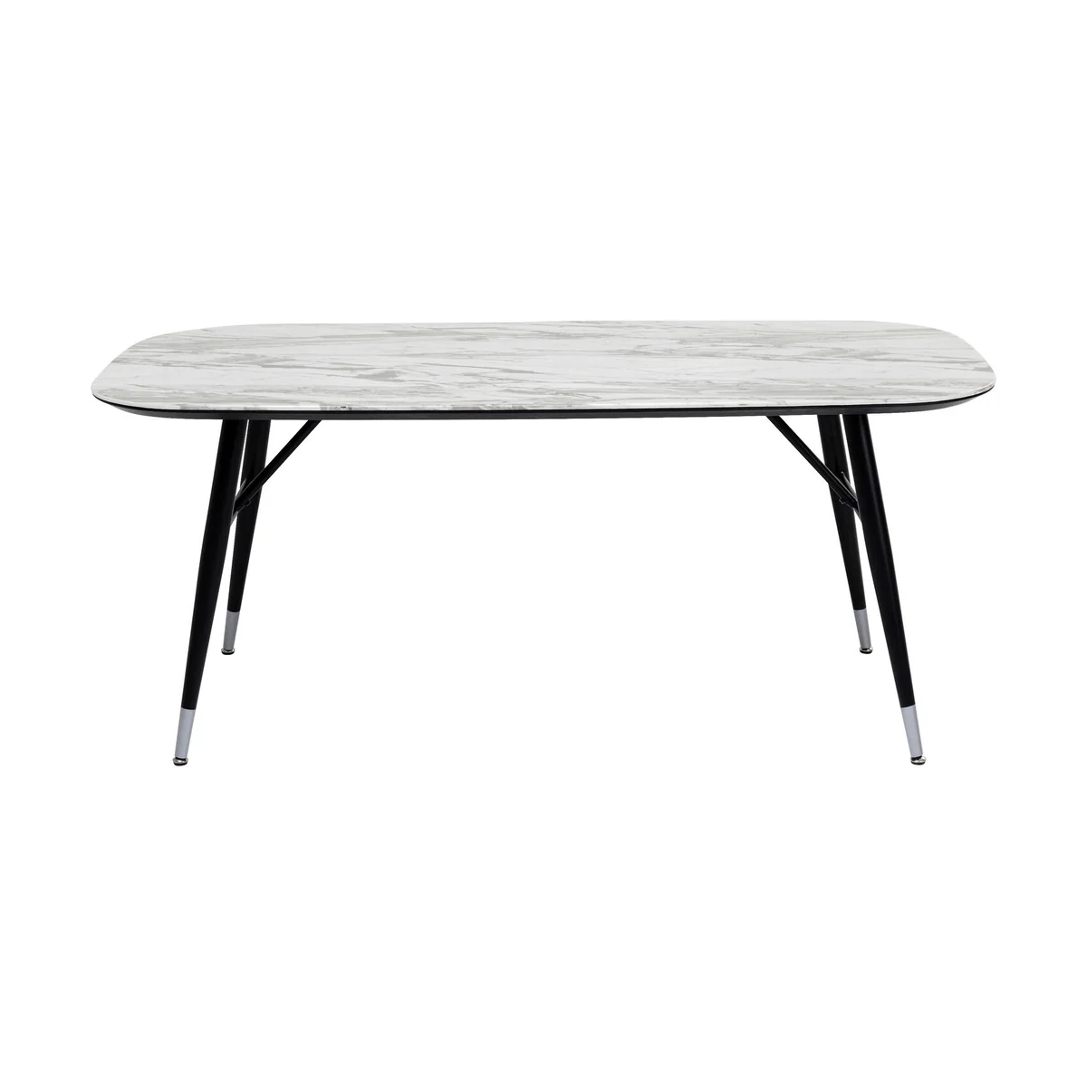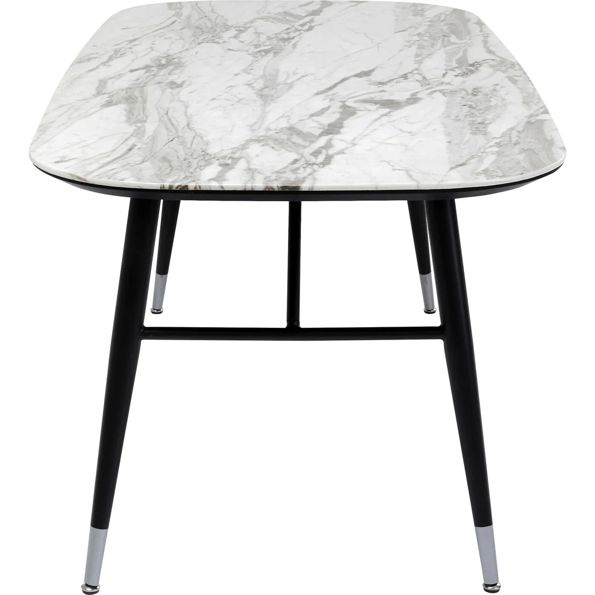 - Marble look: the rectangular dining table in black and white represents a modern furnishing style with retro vibes in the finest way - Practical in daily use: the glass table top (ESG safety glass) in a marble look is particularly easy to clean - Space for the whole family: four to six people can sit at this dining room table measuring 180 x 90 cm - Design flair: retro style flared legs made of black lacquered steel with chrome cuffs - Stable construction and solid workmanship