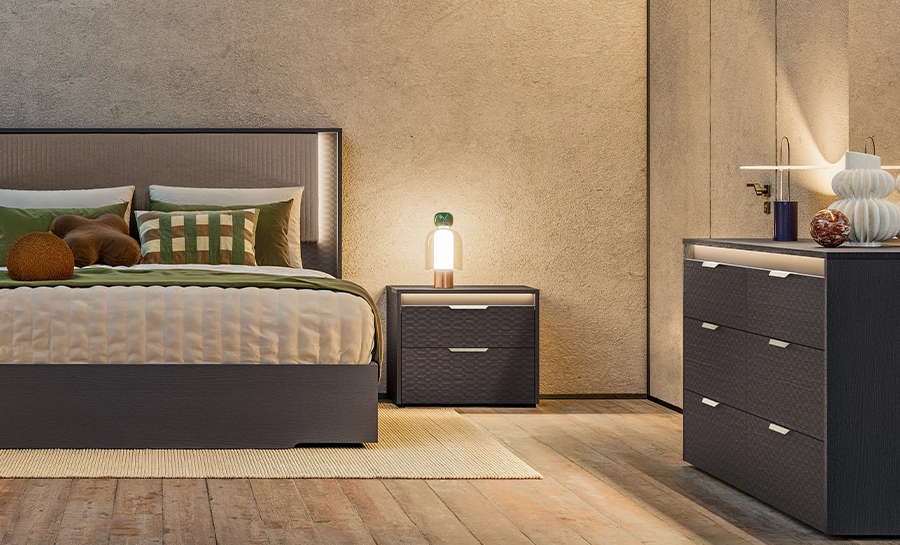 Explore upholstered beds, solid wood frames, and high-gloss finishes, complemented by mirrored dressers and bedside tables. Add luxury and comfort with organic bamboo bedding, duvets, and pillowcases, crafted for softness, breathability, and a premium sleeping experience.