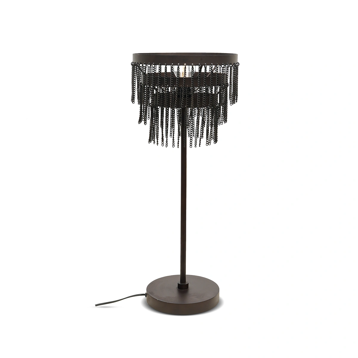 The Chain Table Lamp features a sculptural design crafted from grey phosphate-finished iron chain, providing a distinctive look. Measuring 25cm in length, 25cm in width, and 71cm in height, it's a perfect fit for desks, consoles, or nightstands. The robust iron body ensures durability, while the iron chain detail adds a touch of industrial chic.