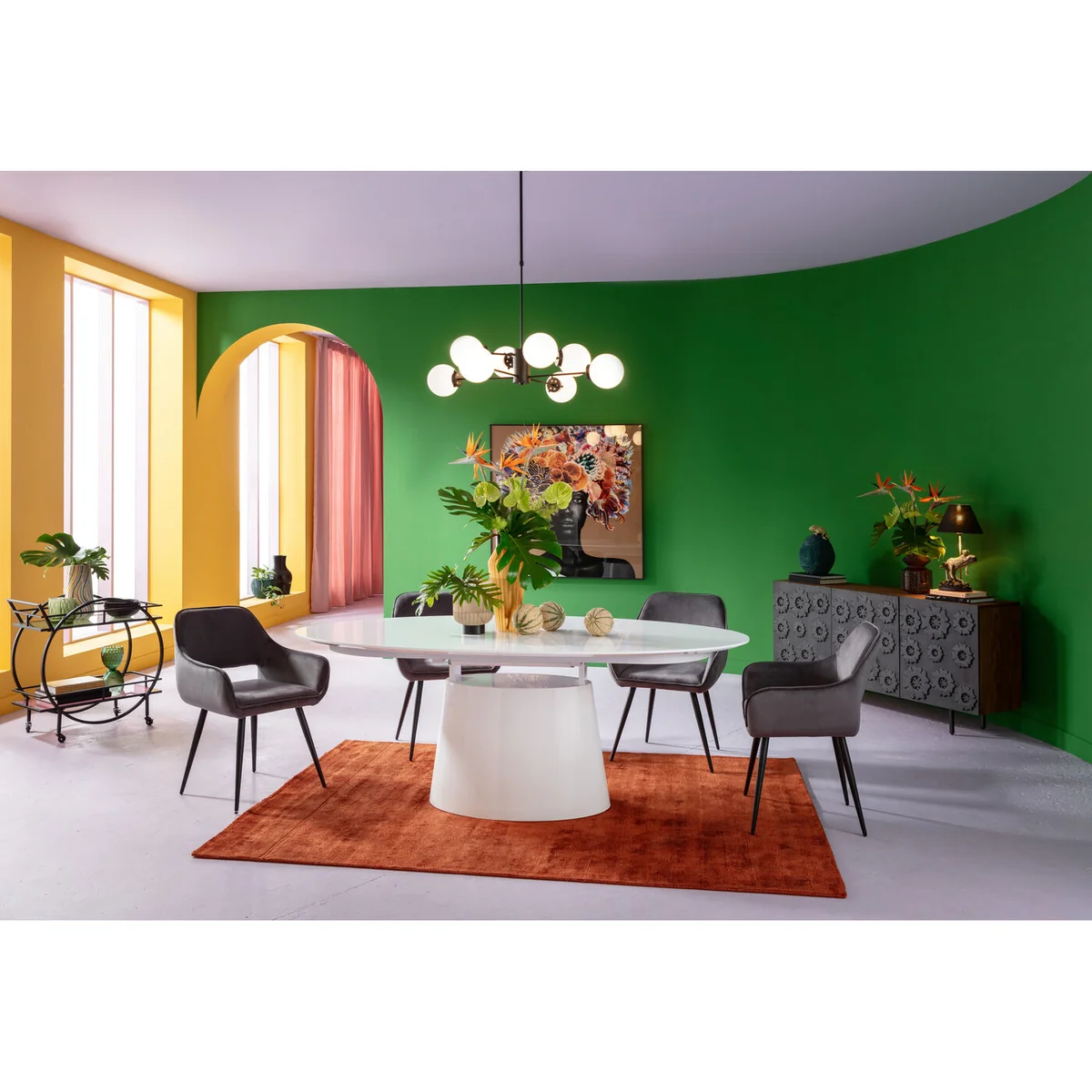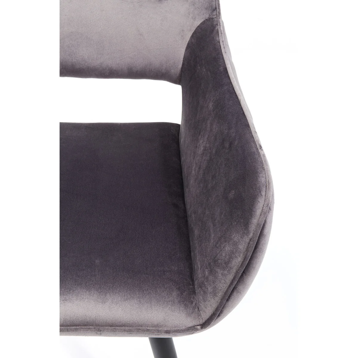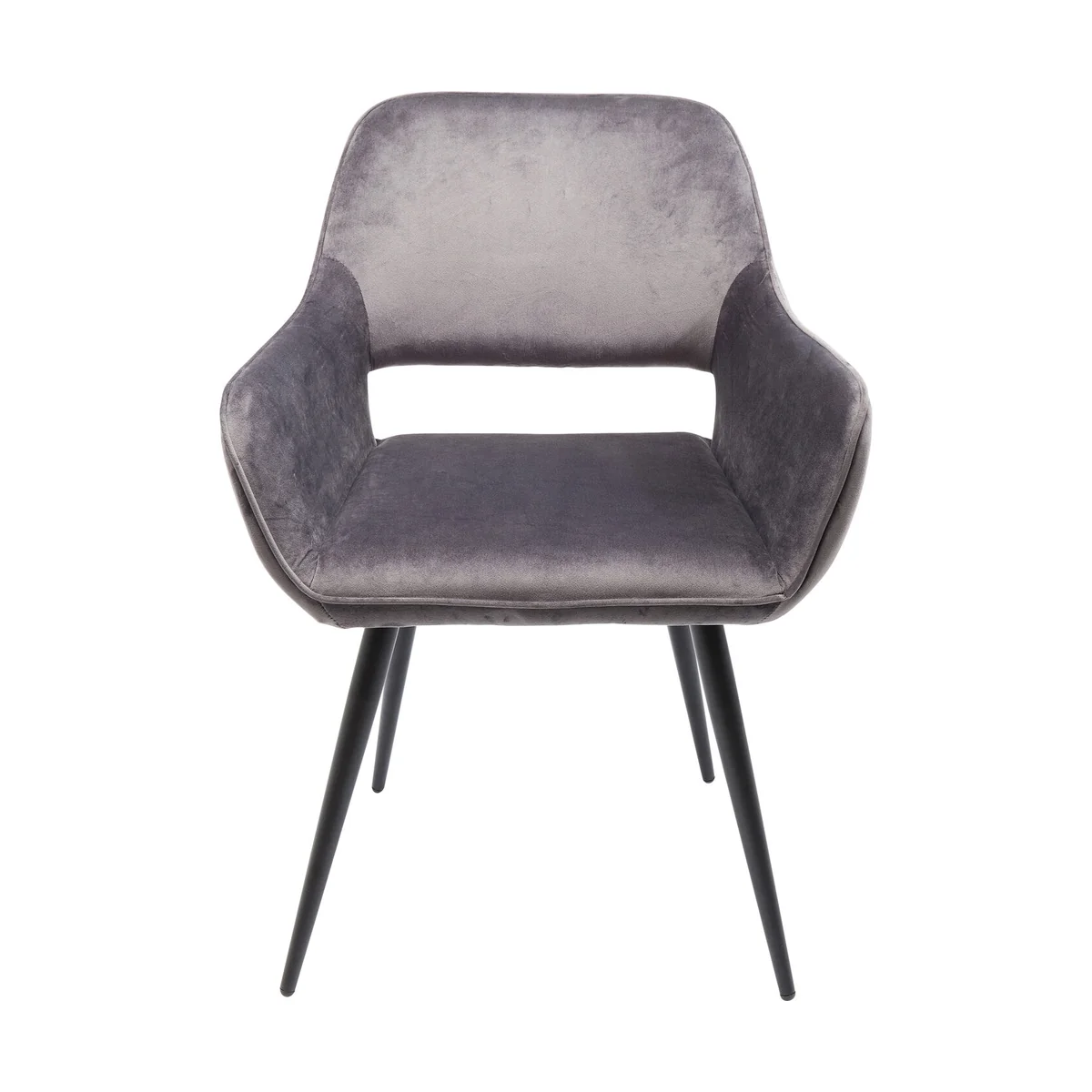 Stylish as a dining chair, cosy as an armchair! After all, with its armrests this chair is at least as comfortable, thanks to its seamless backrest and cuddly upholstery. But its seat height makes the difference, so that it adapts elegantly and light-footedly to dining tables and desks. The cut-out in the back and the slender curved legs also give it an unusually modern lightness.