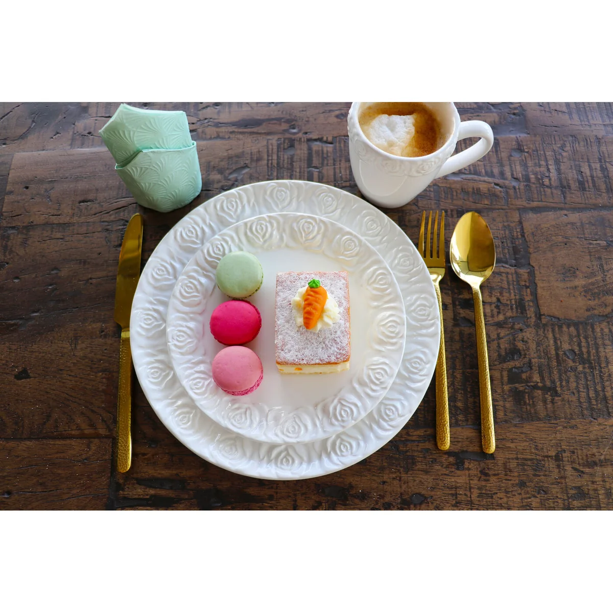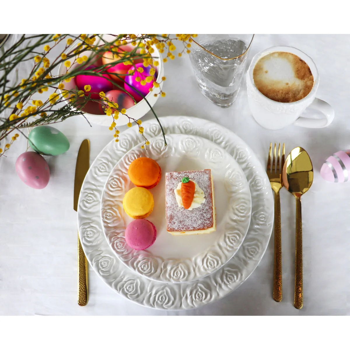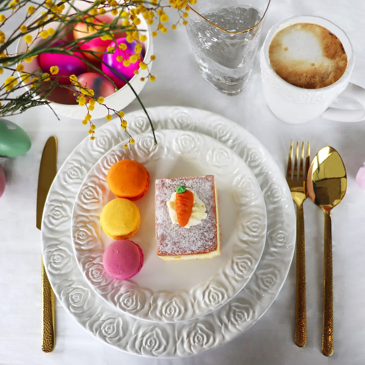 ● Large, round ceramic dinner plate in white, also an eye-catcher as an underplate or serving plate ● Understated for modern table settings, sensuous and charming for a romantic look or in the contemporary country style ● An all-rounder in every household: fresh in effect, can be combined in many ways and is perfect for every occasion ● The charming irregularities bear witness to the manual craftsmanship that goes into making the tableware series ● It's highly practical that the Rosa tableware series is suitable for dishwashers and microwave ovens