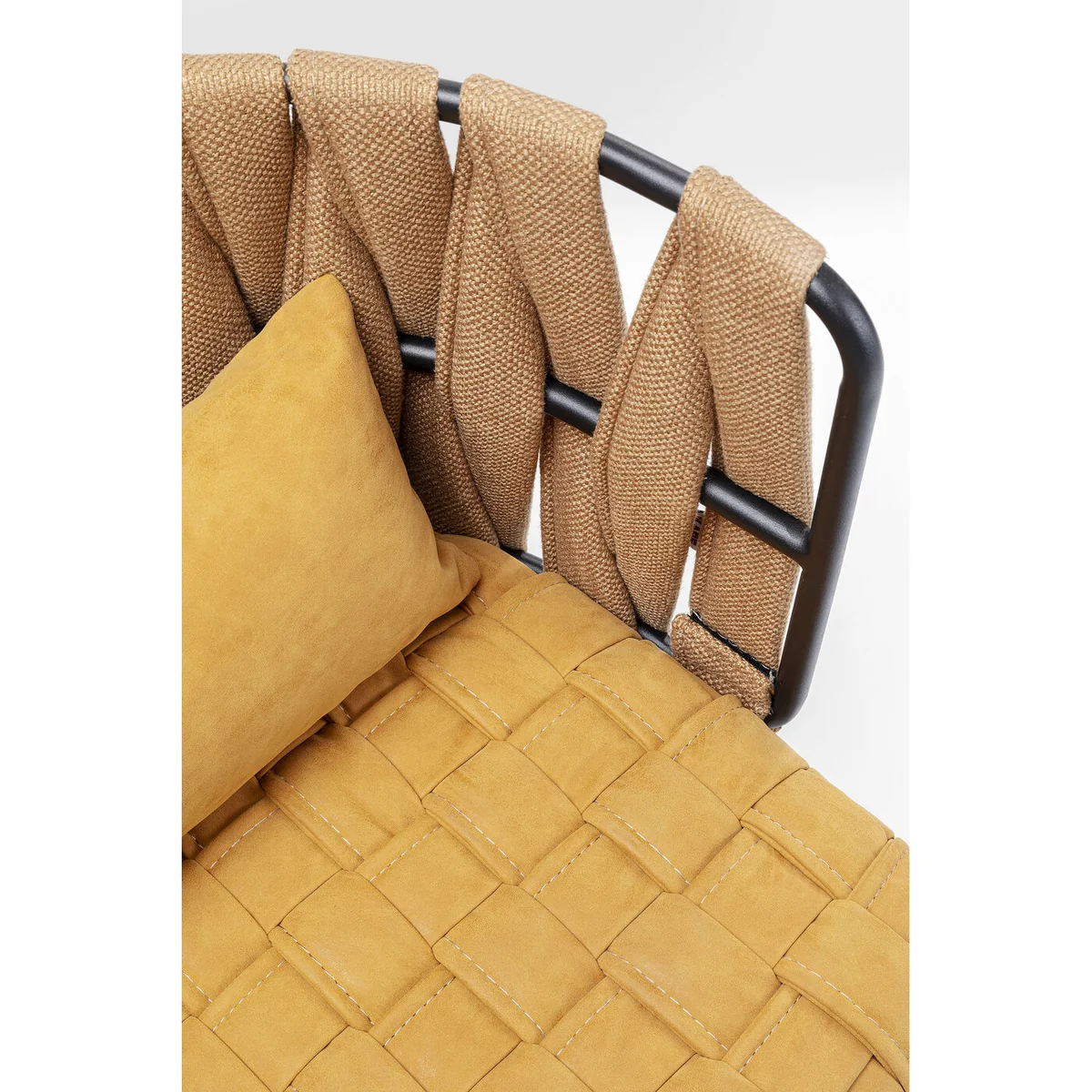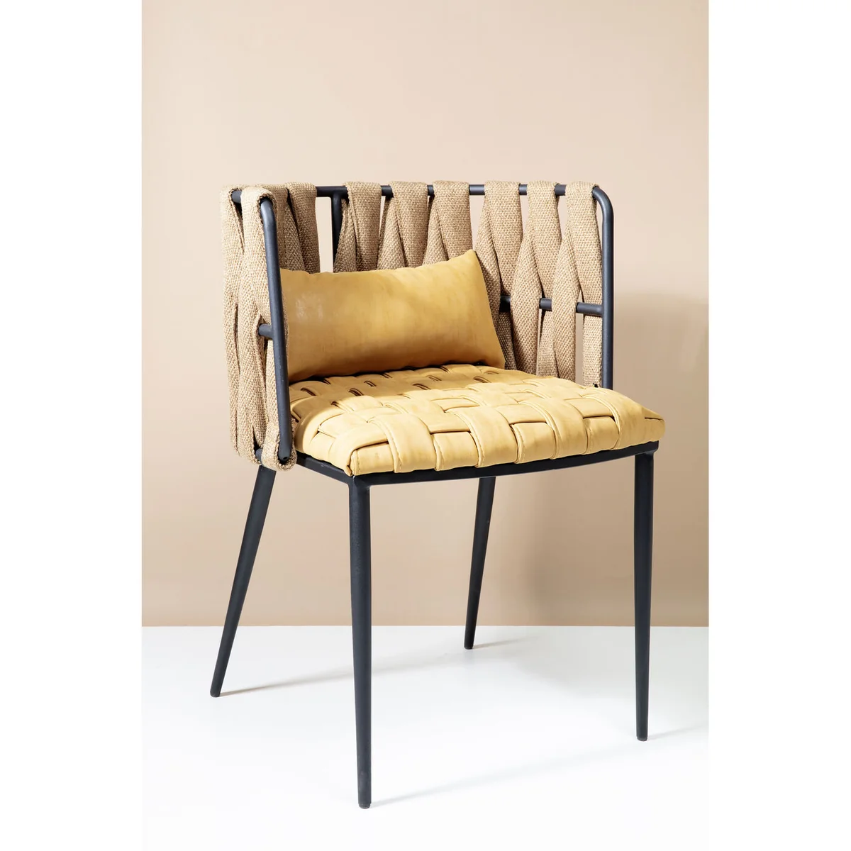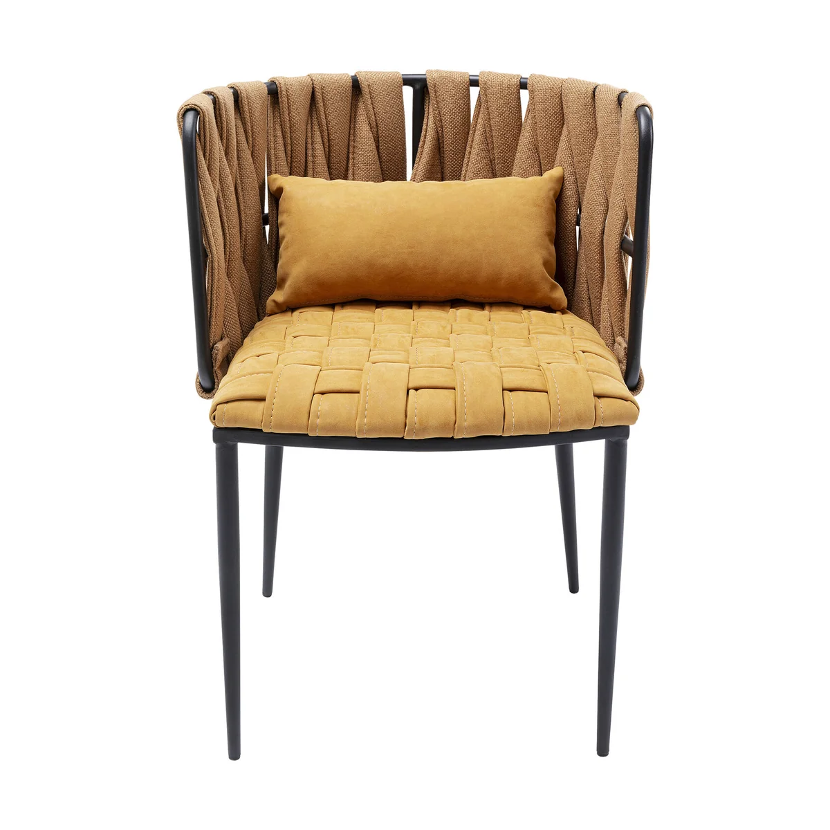 • A cosy armchair, extra stylish with the braided look in the trendy colour of curry • The warm yellow in combination with matt black is particularly elegant • Looks good at the dining table, as a stand-alone chair or as a visitor's chair in the study • Comfortable, hard-wearing covers made of synthetic fibre • A small cushion supports the lower back as required