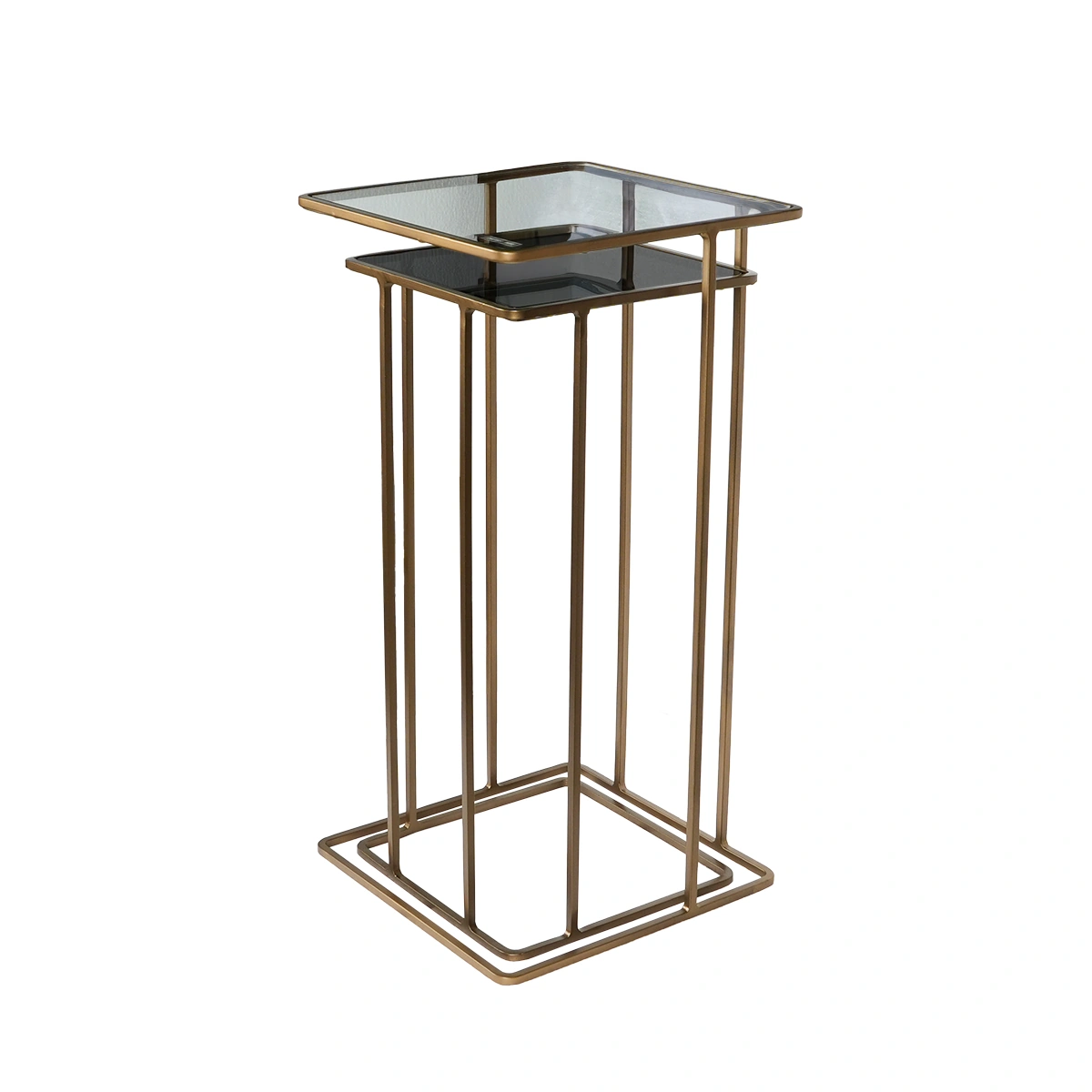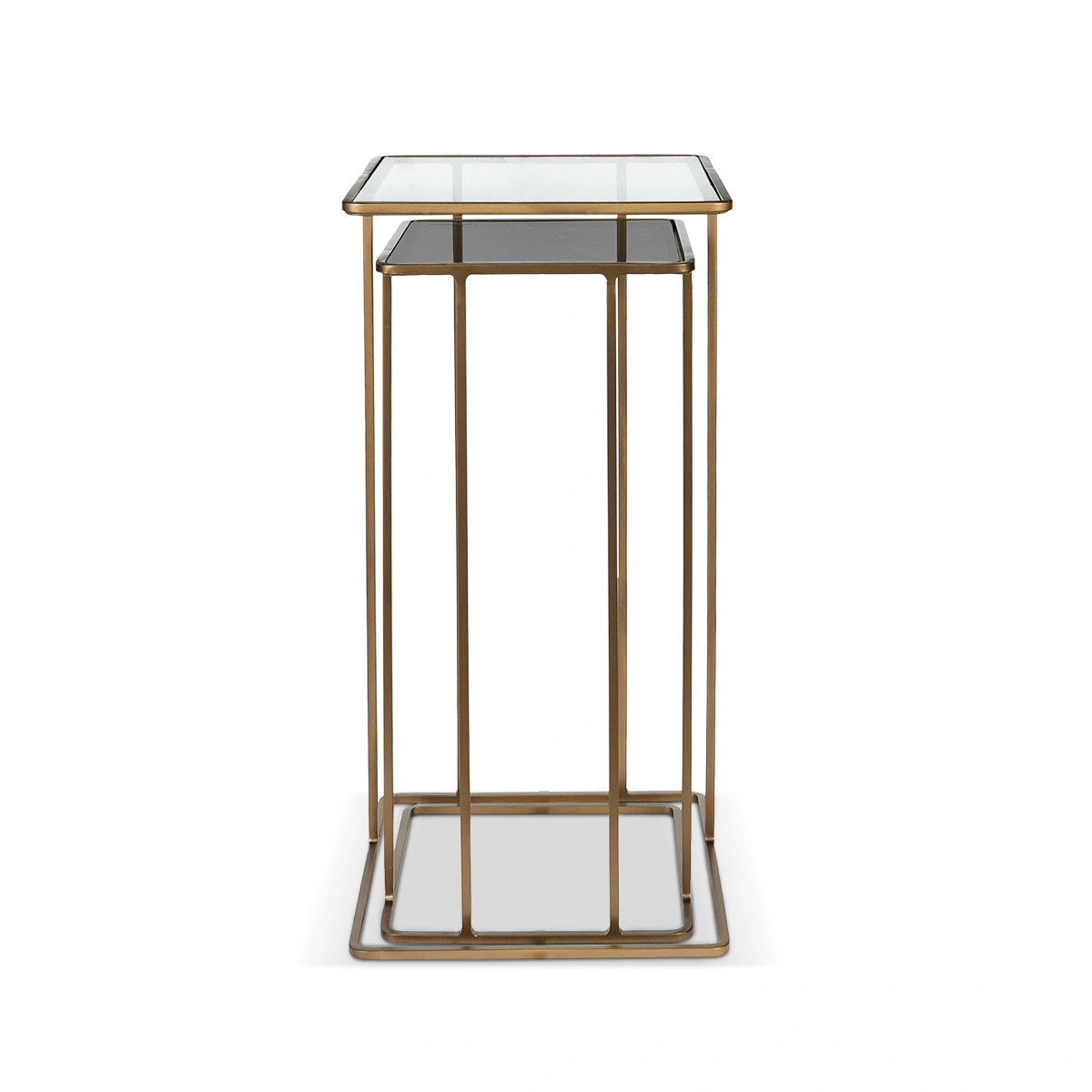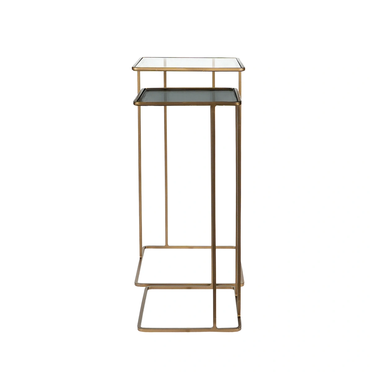 This Classic Side Table set blends timeless design with refined contrasts. The combination of clear float glass and black-tinted glass tops adds dimension and clarity, while the antique gold frame introduces warmth and elegance. Perfect for flanking a sofa or used individually throughout your home.