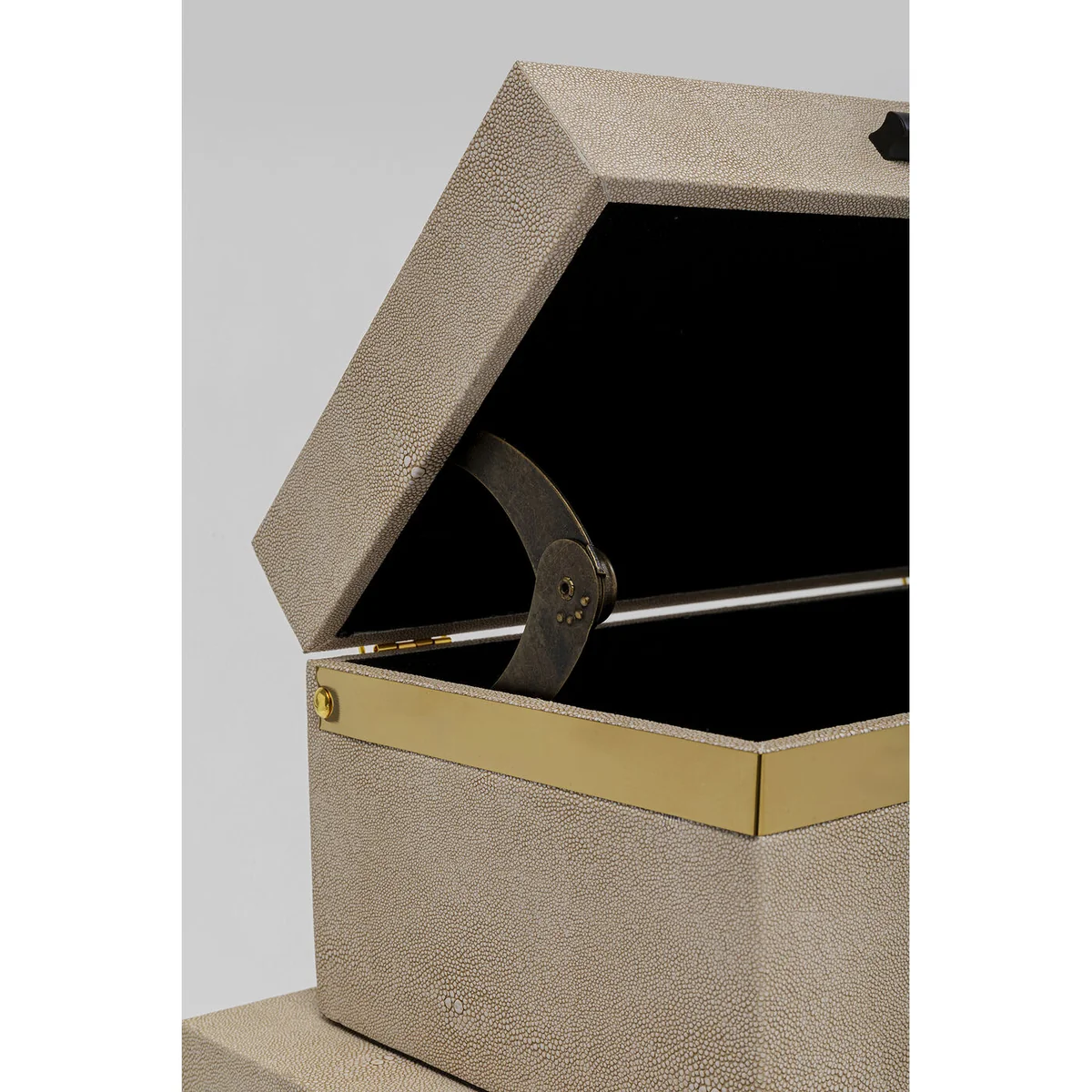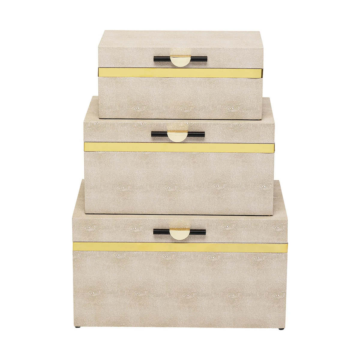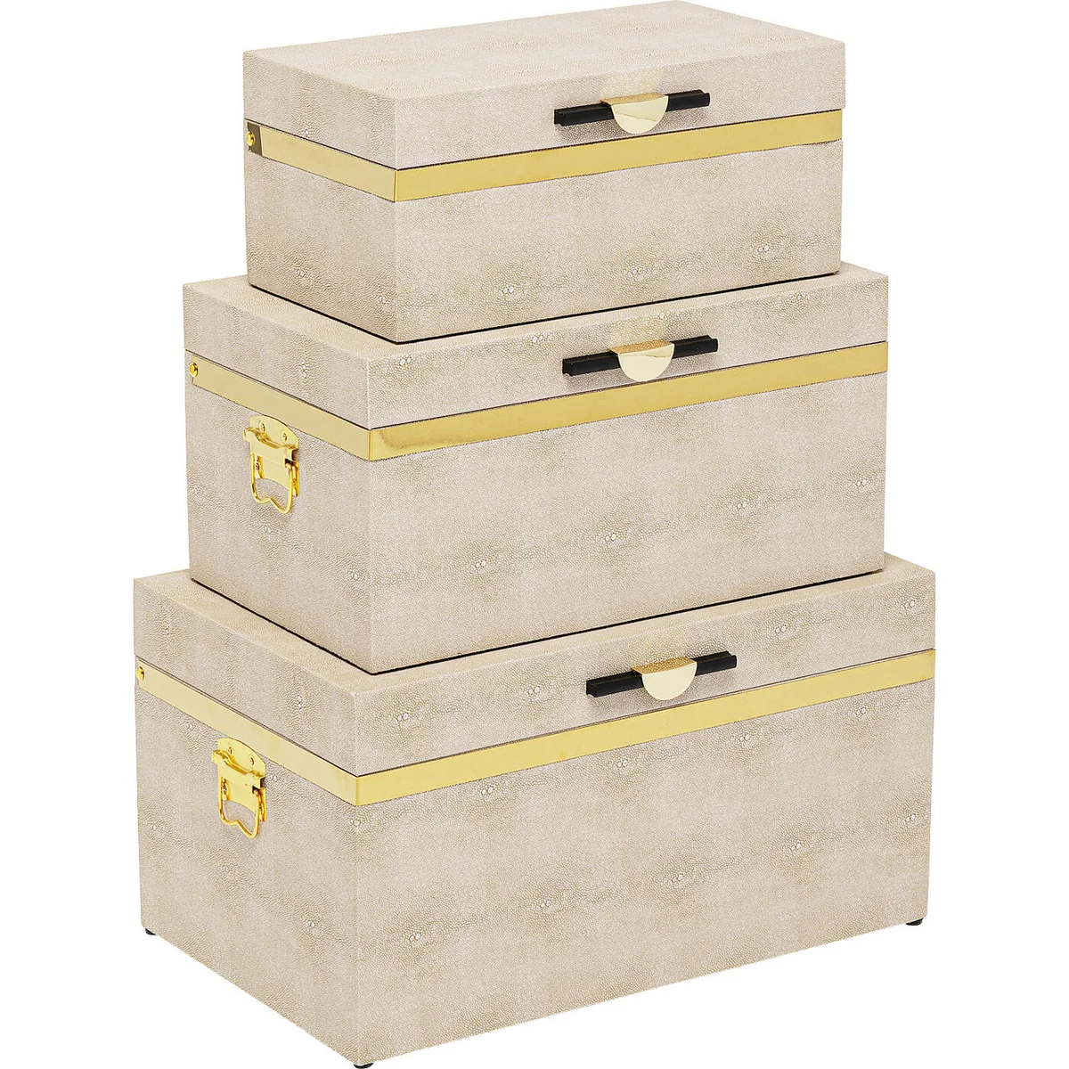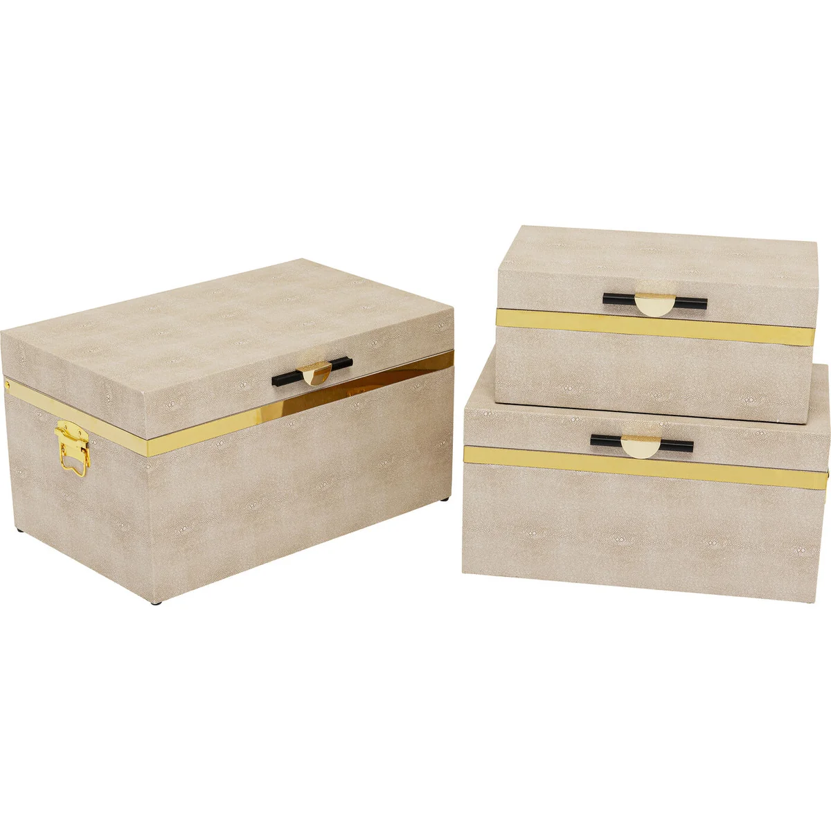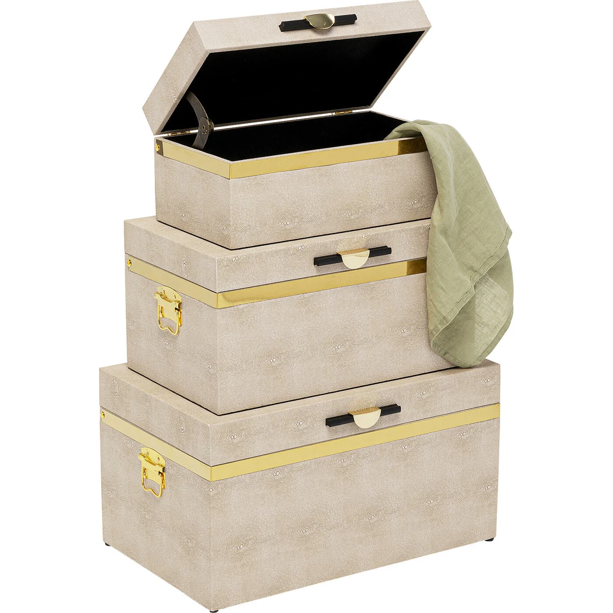 • Set of 3 large boxes with hinged covers • Their elegant design makes these storage boxes a stylish home accessory • The beige-coloured containers are covered with coated fabric in a rayskin look • The handles and gold-coloured decorative strips are made of titanium-coated steel • The dimensions of the individual boxes: 26x48x30cm, 21x42x25cm, 16x36x20cm