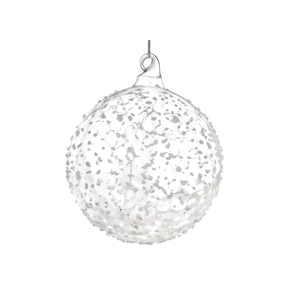 Enrich your home decor with the Large Clear Glass Ball with White Dots, a mesmerizing piece of art that adds a wintry sparkle to any room.