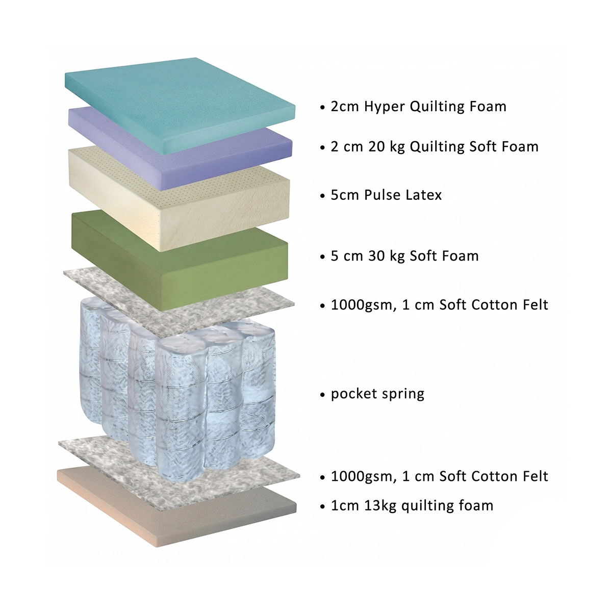 Core: 1.8 mm Pocket Spring System; Layer: Soft Cotton Felt Padding; Support: Pulse Latex and Soft Foam Layer