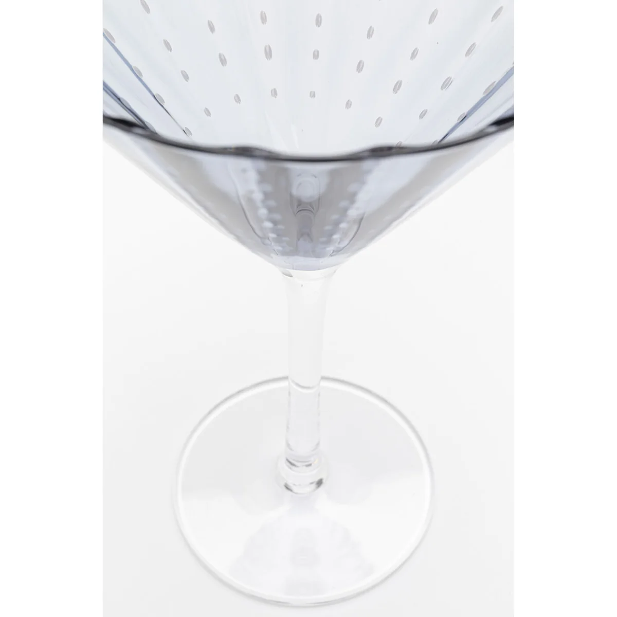 Key features of this 18x12x12 cm glass include its shapely silhouette and riffled structure, making it an eye-catcher on any dining table. It has a slightly transparent coloring in cool blue and is decorated with fine, white speckled details. Its size is ideally proportioned for a range of beverages.