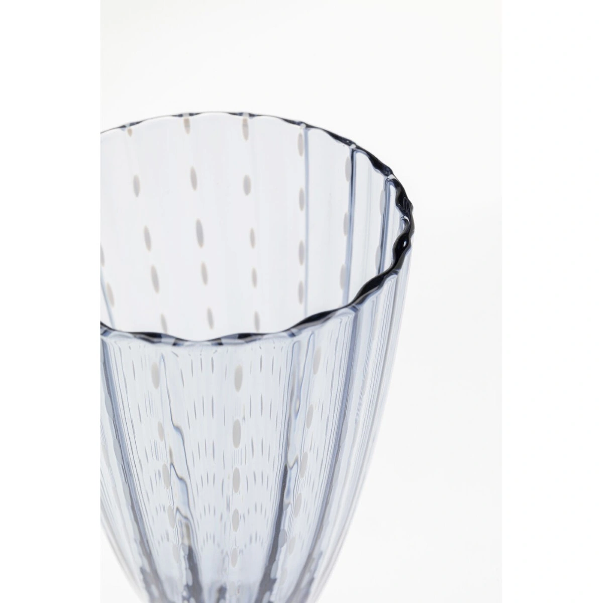 This 23 x 7.5 x 7.5 centimeters glass is adorned with fine white speckles, adding to its delicate blue hue. Its transparent coloring and riffled structure make it an eye-catcher on any dining table, while the subtle speckled details lend a touch of sophistication. The glass harmonizes wonderfully with plain or colored tableware sets, making it a versatile piece.