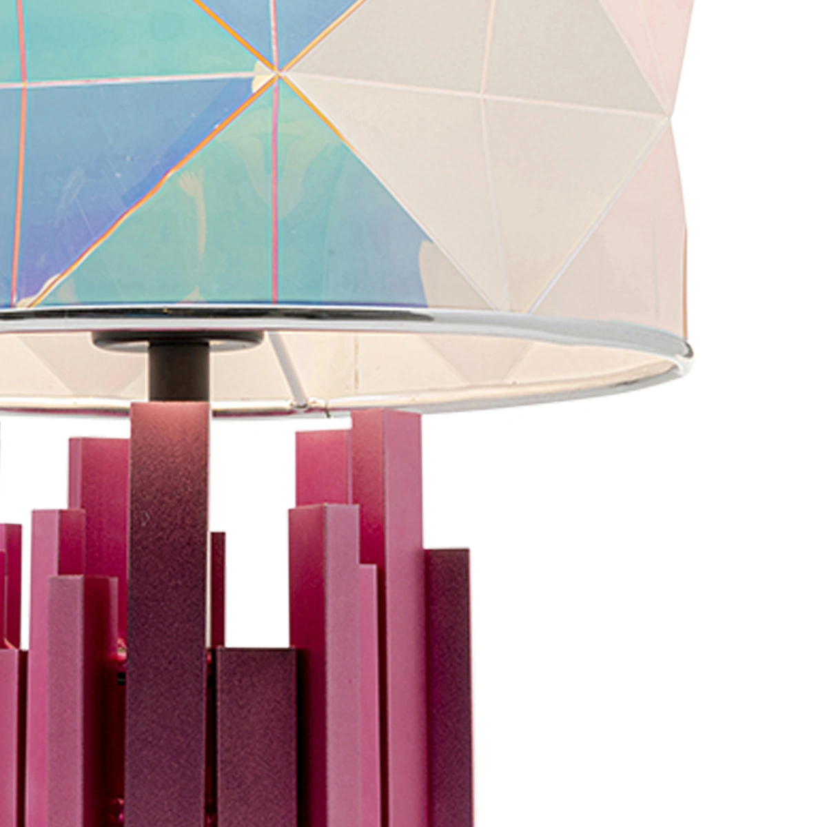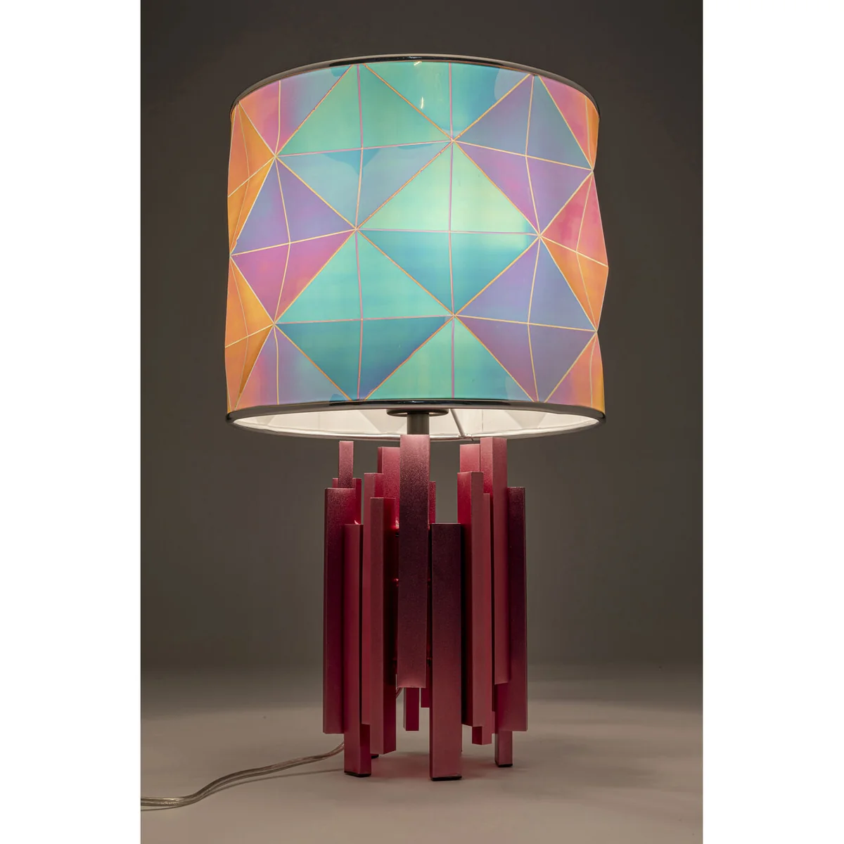 This unique table lamp measures 45 x 27 x 27 centimeters (H/W/D) and features a playful lampshade blending shades of pink, blue, and white in harmonious triangles. The lamp is further accentuated by a sculptural steel base, lacquered in shiny pink to bolster its creative design.