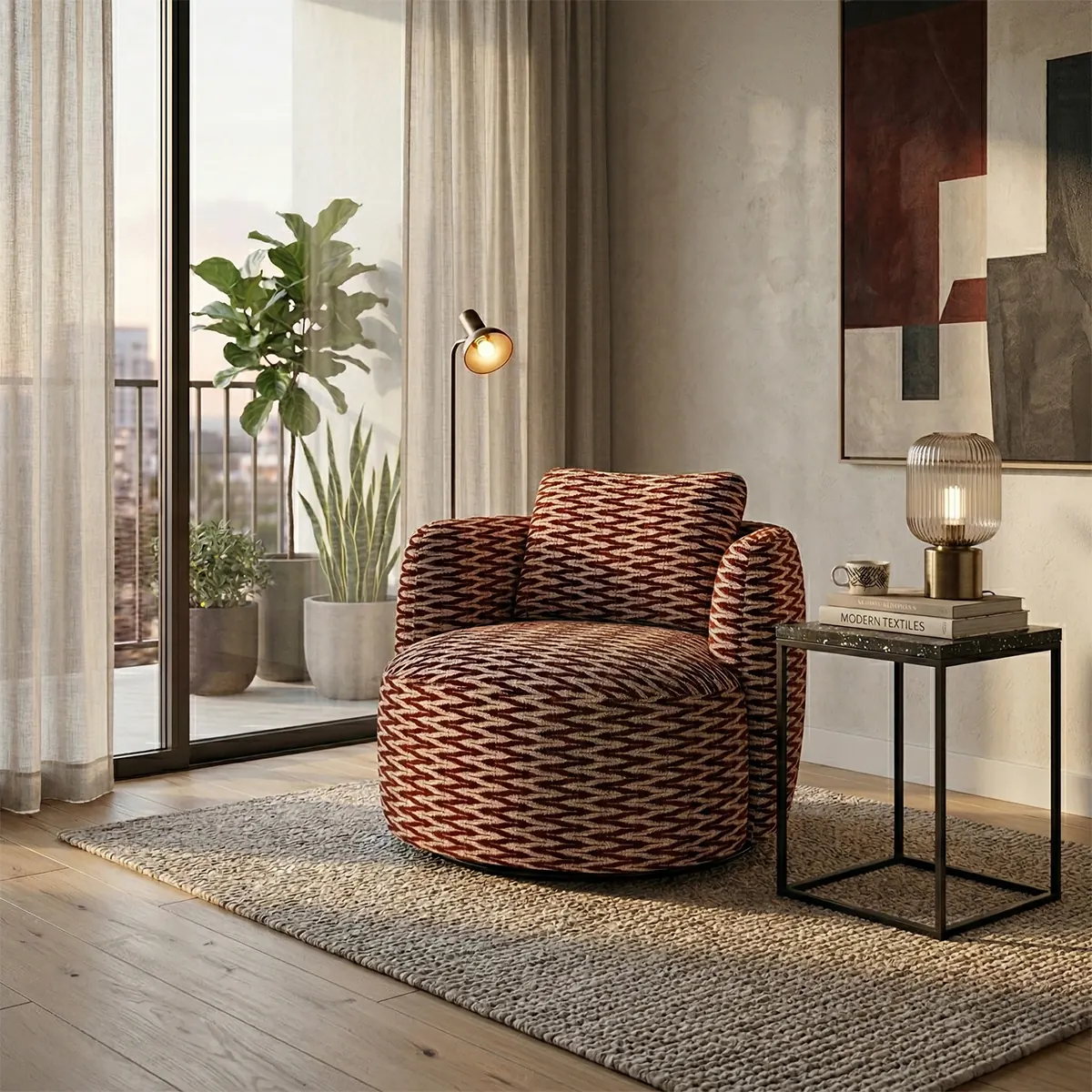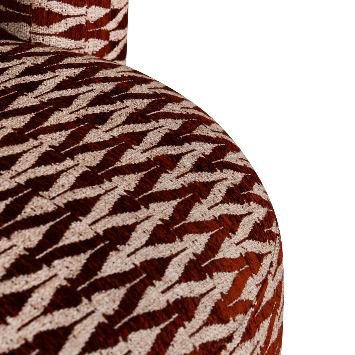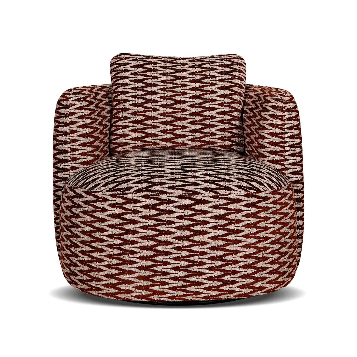 The Coco Arm Chair in beige brown is a statement accent piece designed to add comfort and character to living rooms or lounge areas. Its sculptural form and soft upholstery create a welcoming seating option for modern interiors. Upholstered in a Nuage fabric blend, the chair features back cushions filled with goose feathers and silicone blend for plush comfort. A pine wood and plywood frame provides structural strength, while the swivel base adds functional versatility. This armchair delivers luxurious comfort and visual impact. Its supportive cushions, swivel functionality, and refined design make it an ideal choice for stylish and comfortable living spaces.