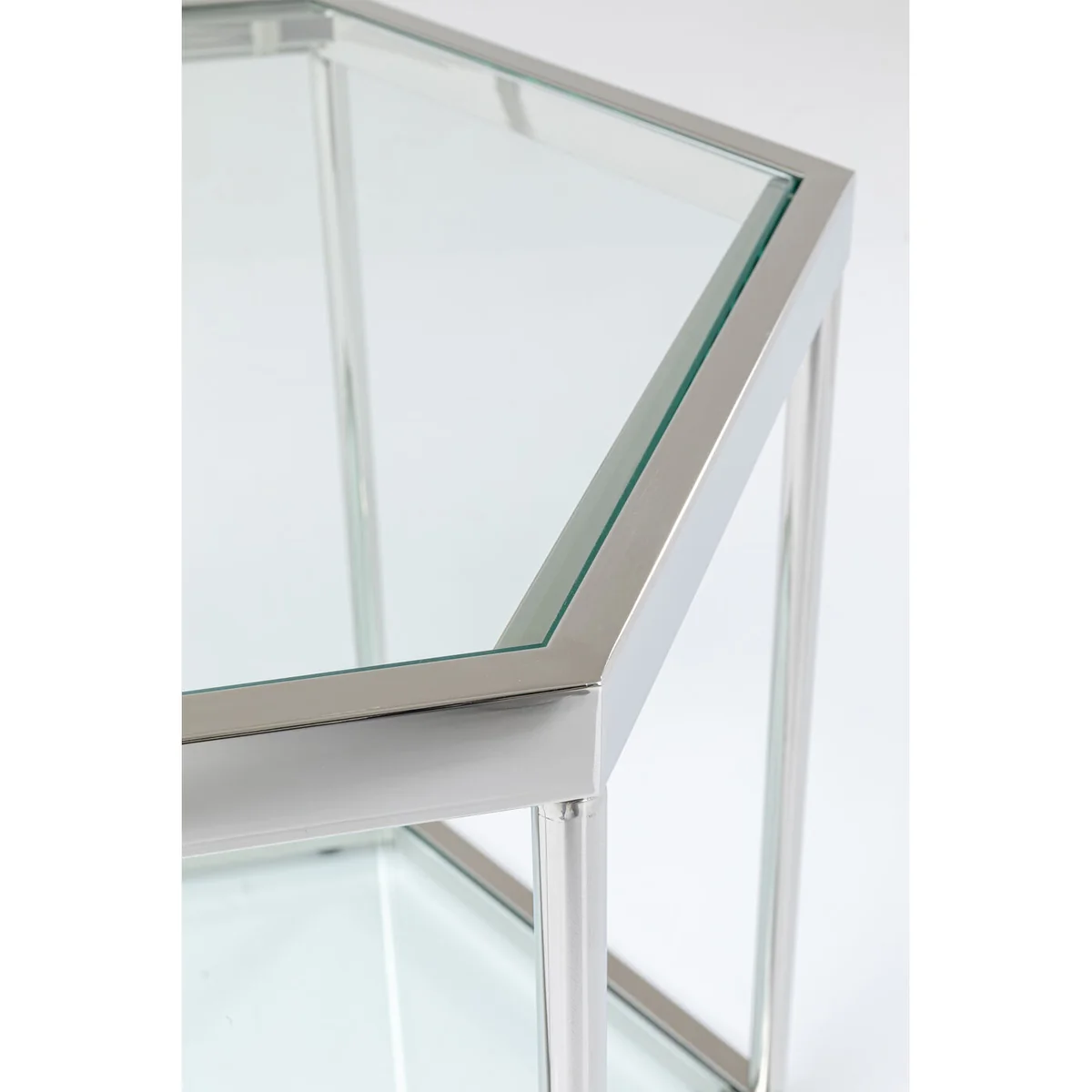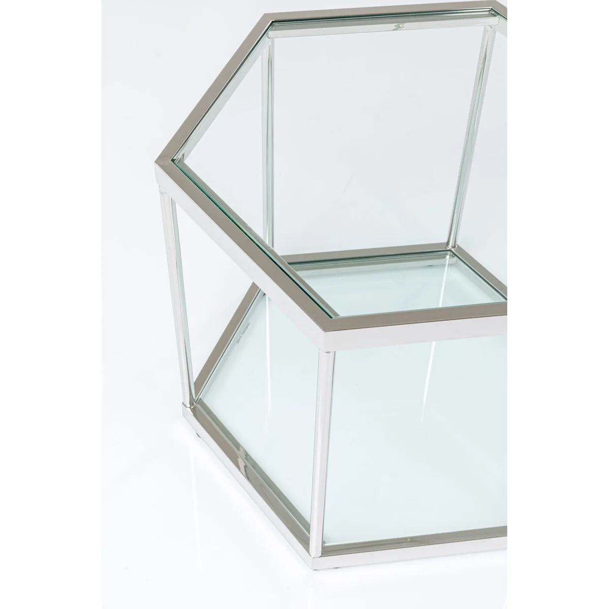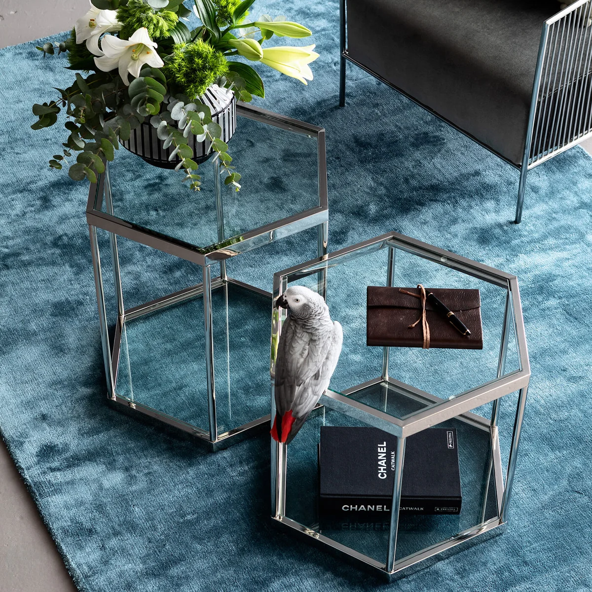 - Modern glam - a hexagonal glass coffee table with a silver-coloured steel frame - Graphic in form, transparent in the room - the side table airily complements your seating group in the living room - Side tables are even more attractive as a pair - because symmetry gives structure to rooms - As bedside tables next to the bed, two Comb Silvers give the bedroom Fifth Avenue flair - As a side table with a lamp the glass table goes beautifully with velvet sofas