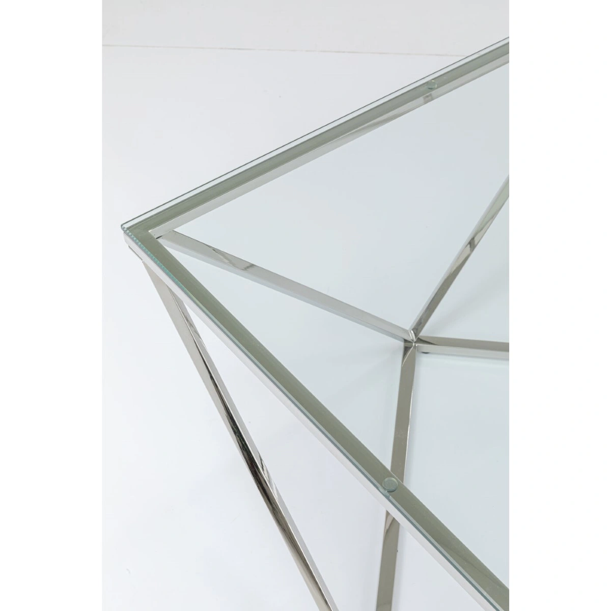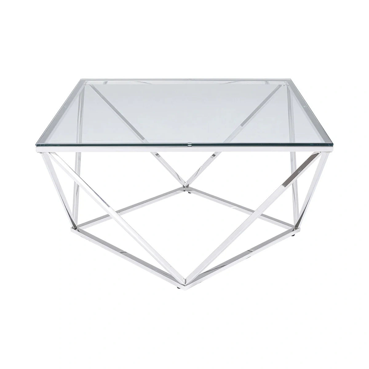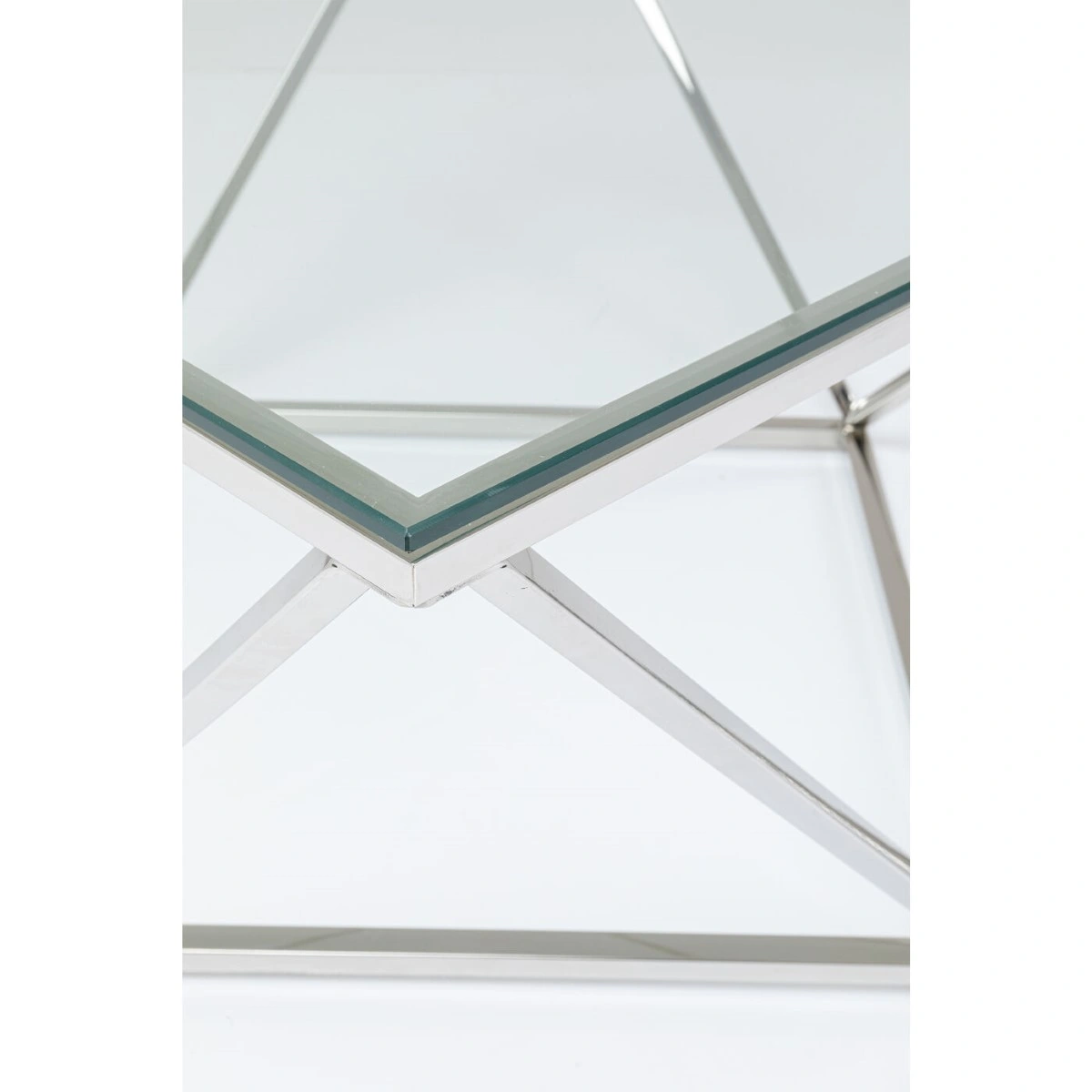 • Square glass table with a geometric frame made of polished stainless steel for fans of the pure look