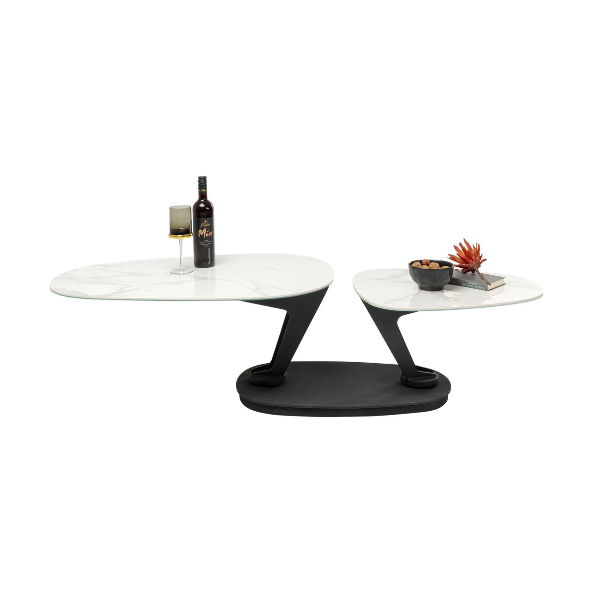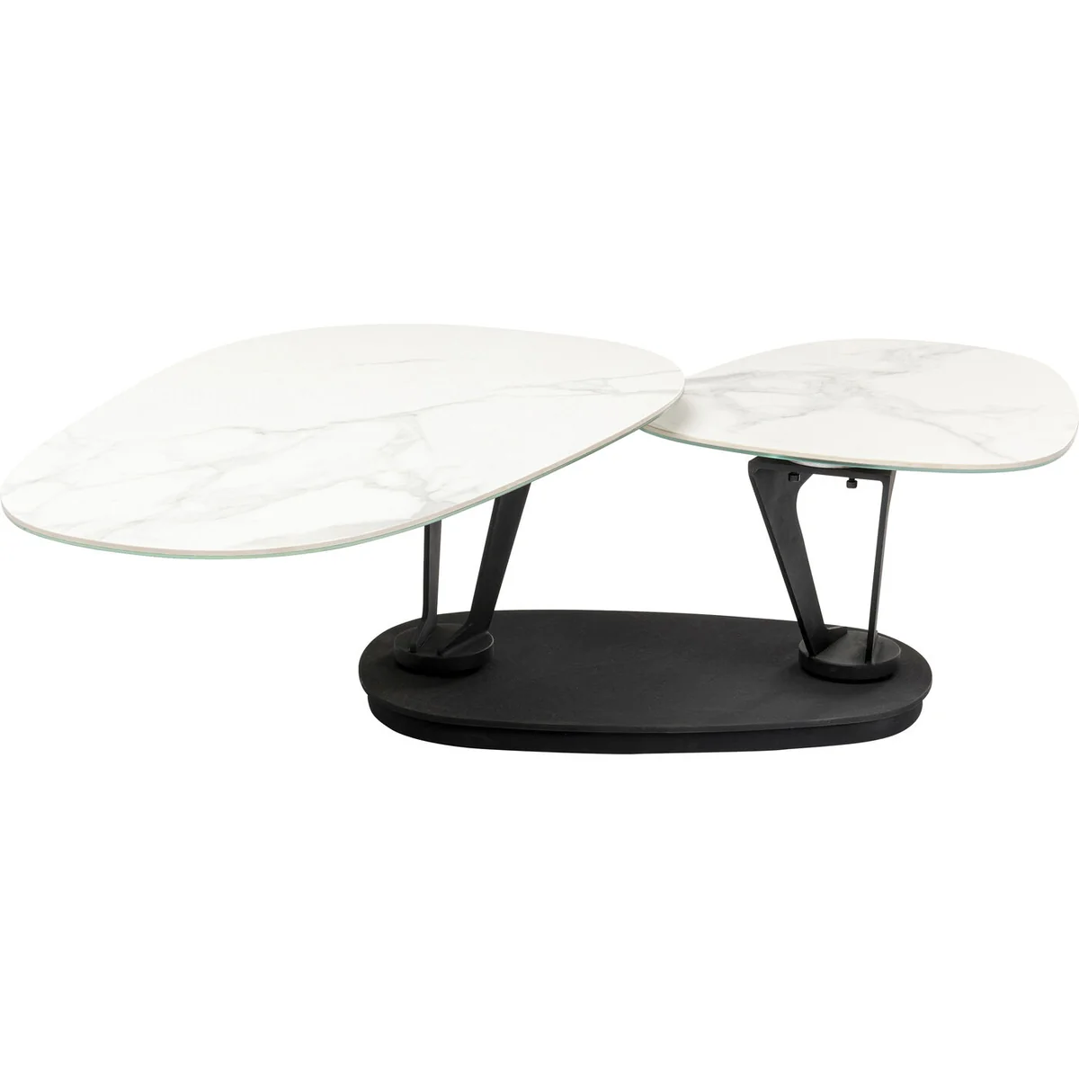 • Black and white coffee table with two table tops 42x150x58 cm (H/W/D) • Finely marbled, elegant table tops made of hard-wearing and easy-care ceramics • The two tops can smoothly be swivelled synchronously • The solid base and swivel frame are made of powder-coated s