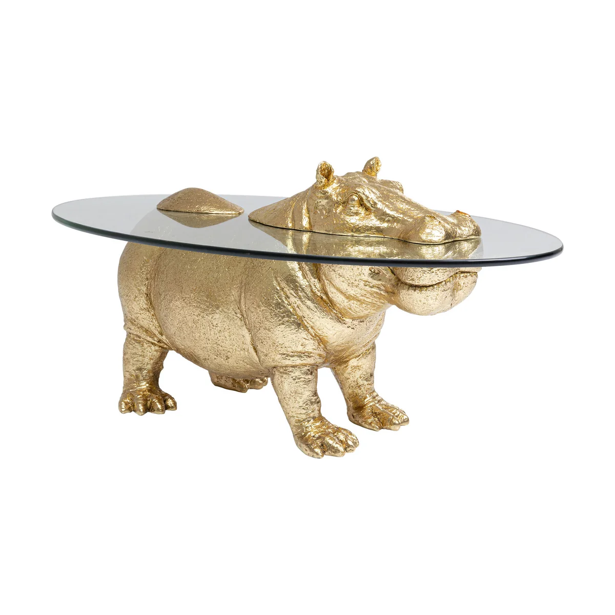 The Hippo side table with an animal figure as its base is not only an eccentric home accessory for animal lovers - fans of flamboyant furniture will also be delighted with it. The hippo figure continues through the tabletop made of safety glass, which makes it look as if the hippo is just emerging from the water. Around the hippo the glass table offers space to place drinks and snacks. An additional eye-catcher in the living room is unnecessary next to this extraordinary coffee table.