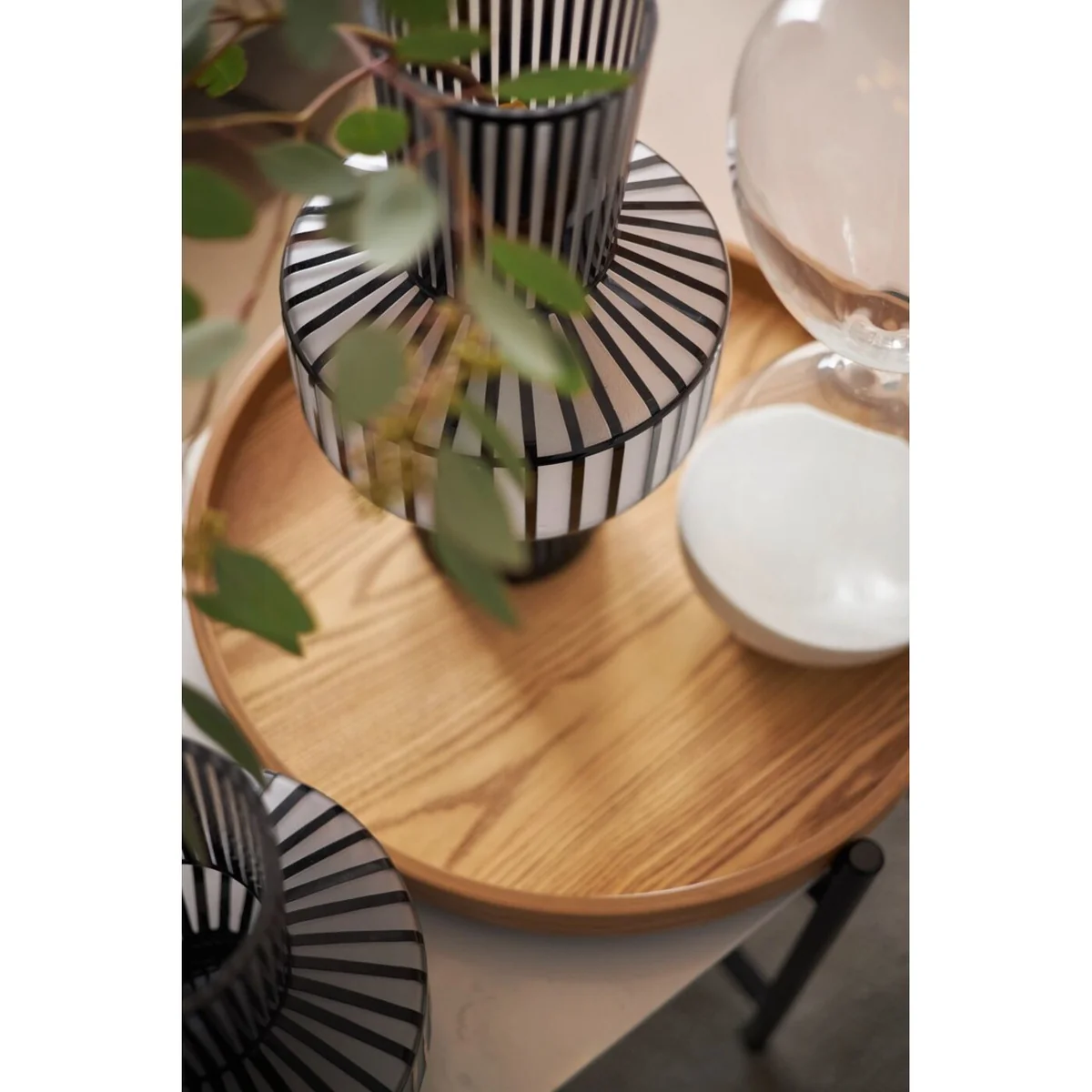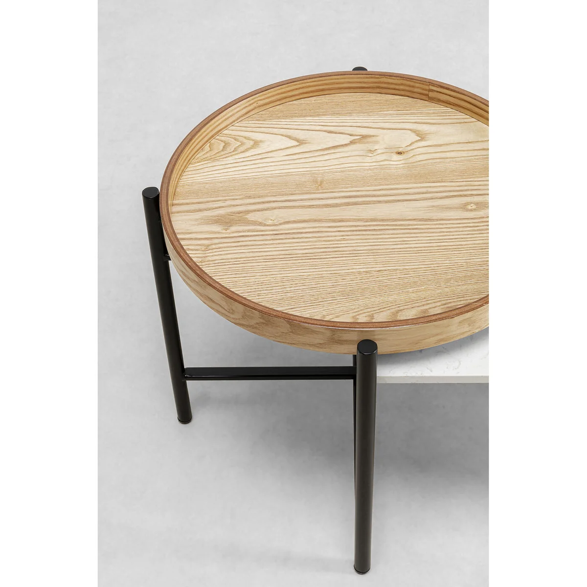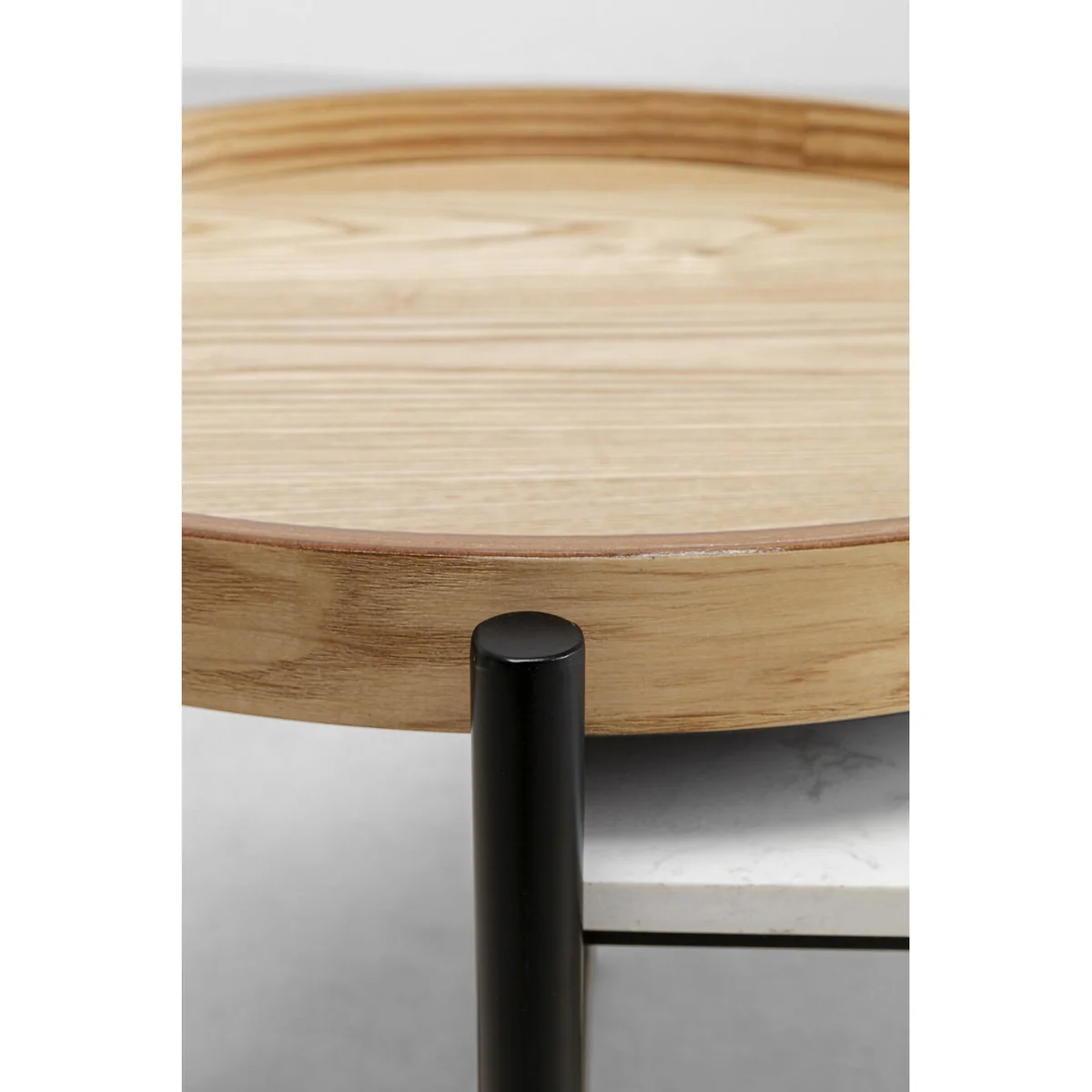 The colour combination of black, white and light wood is elegant and eternally young. This generously spaced side table can be combined with minimalist furniture or provide a chic contrast to soft upholstered furniture in velvet. The two geometric tops invite you to use the coffee table not only as a functional storage unit, but also to decorate it with bouquets of flowers and accessories.