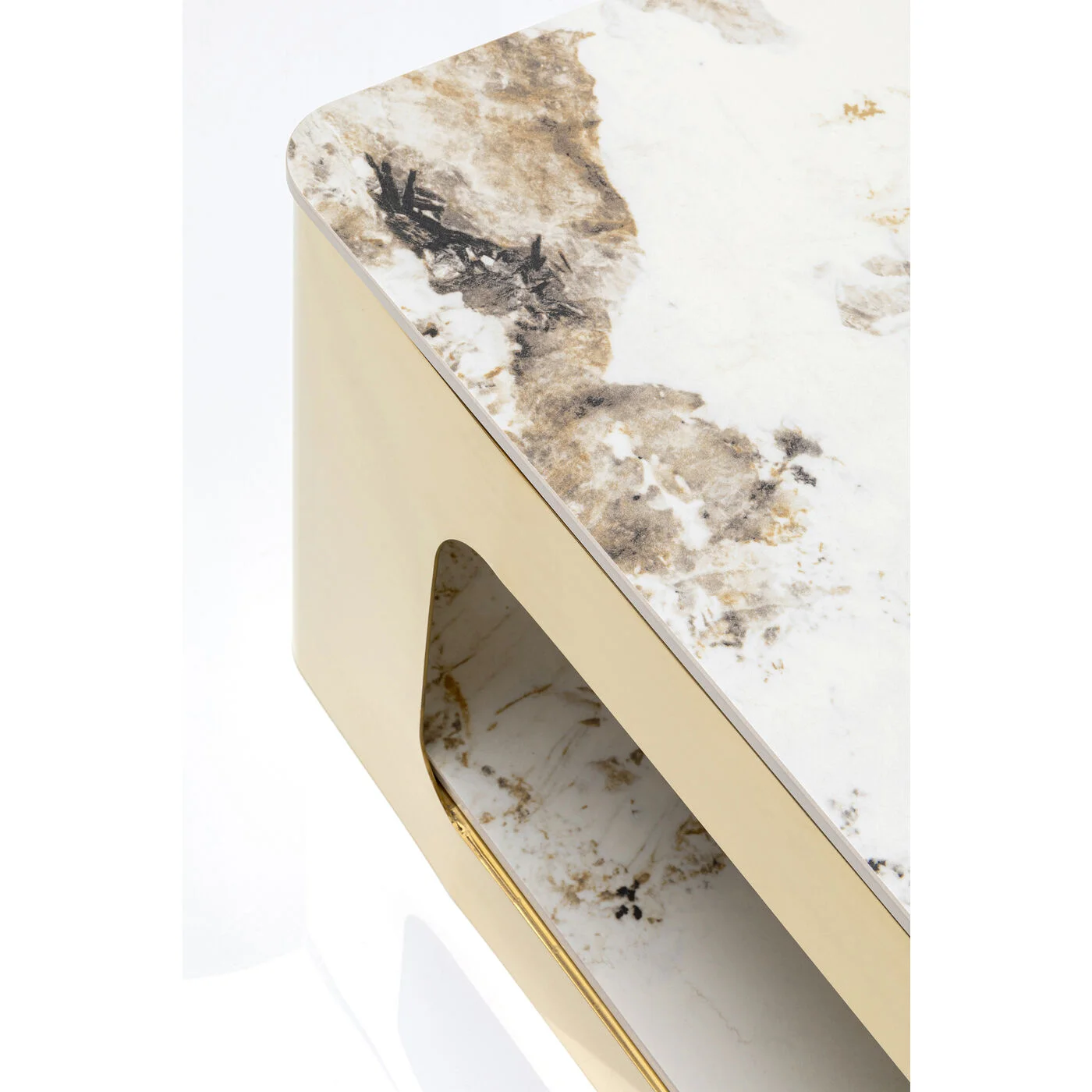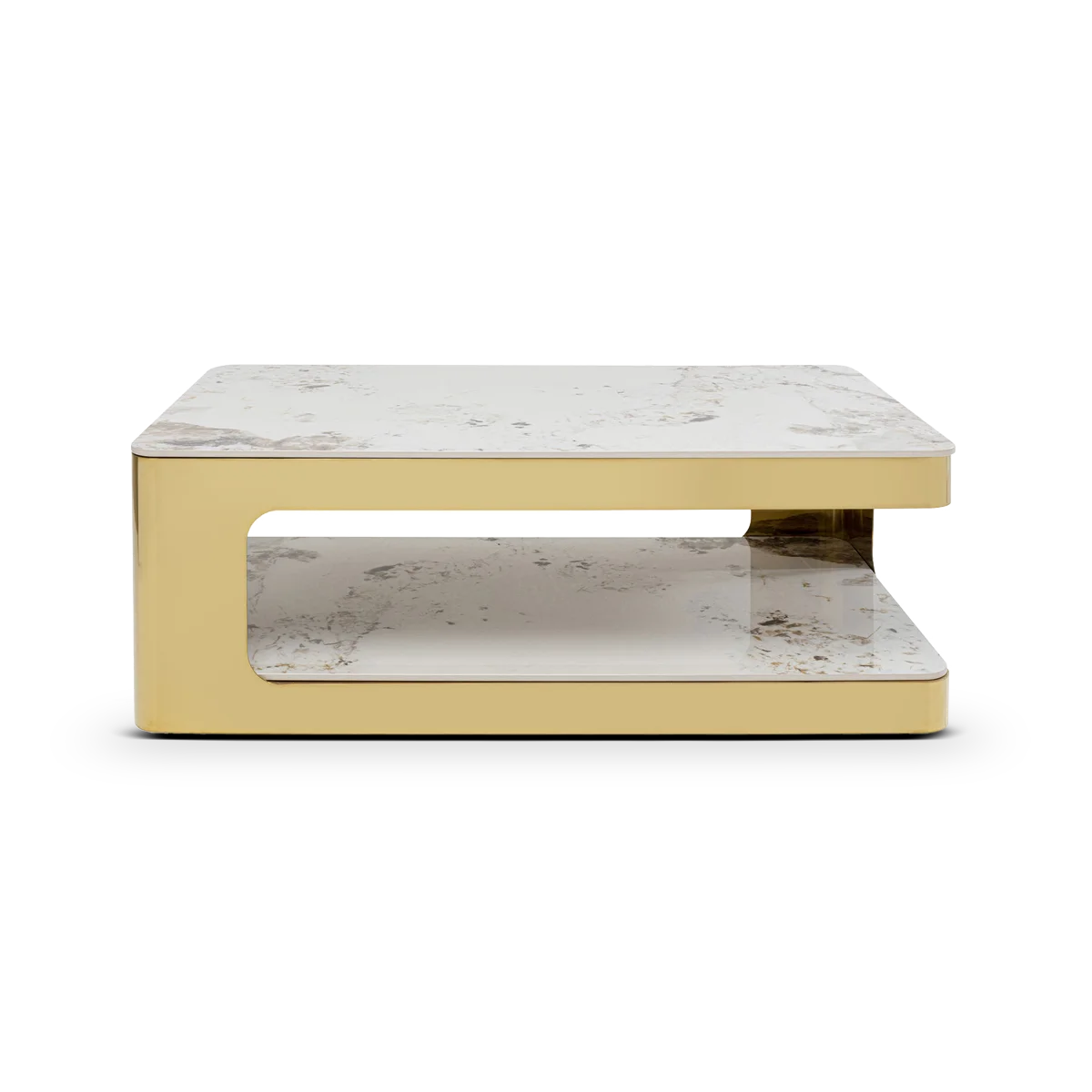 Lift your living room to the next design level with our elegant, modern and glamorous coffee table in gold with light ceramic table tops. This gorgeous piece of furniture will add luxury and sophistication to your rooms. With a spacious rectangular shape, it not only offers stunning aesthetics but also practical surface areas on two levels. Perfect for displaying drinks, books or decorations in style. Add glamour and style to your home with this remarkable coffee table.
