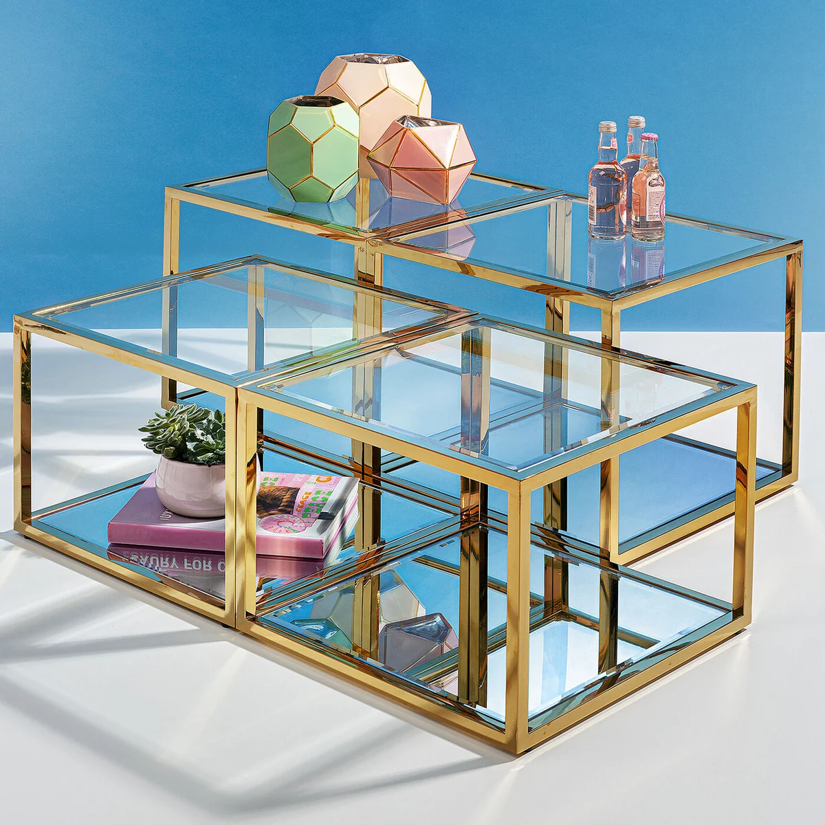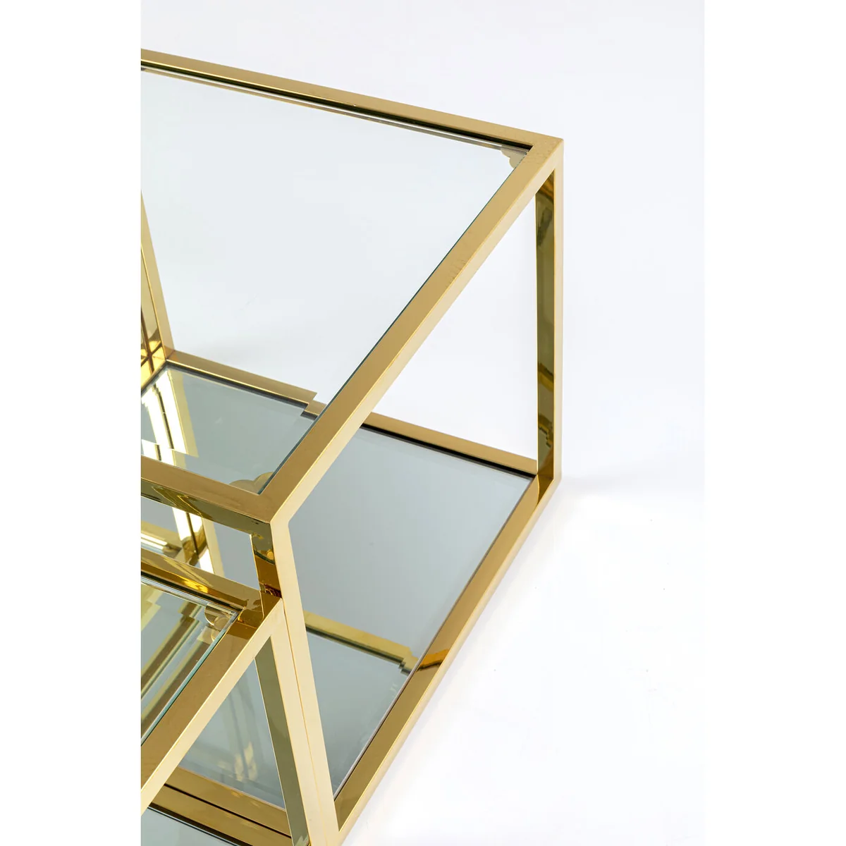 • A high-quality set of four golden square coffee tables in two different heights • Luxurious extras: table tops made of glass and mirror glass with facet cut edges and a gold-coloured, lacquered stainless steel frame • This set of glass tables fulfils all your furnishing dreams, either as a duo next to the sofa or as a bedside table next to the boxspring bed • A showpiece with glamour for the salon - and with practical uses, because this set of tables is so versatile • Rounds off the luxury look: the faceted edges of the clear glass tops above and the mirror glass tops below