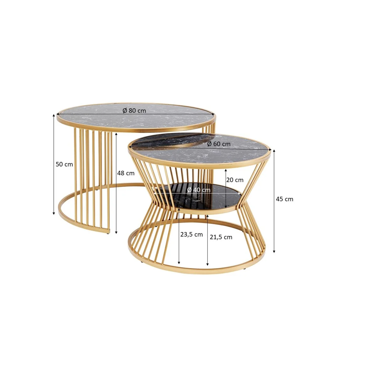 The tables come in a set of two, each with a diameter of 80 cm and a height of 50 cm. Their frames are crafted from lacquered steel, providing a sturdy and reliable base. The golden finish adds a touch of elegance and sophistication.