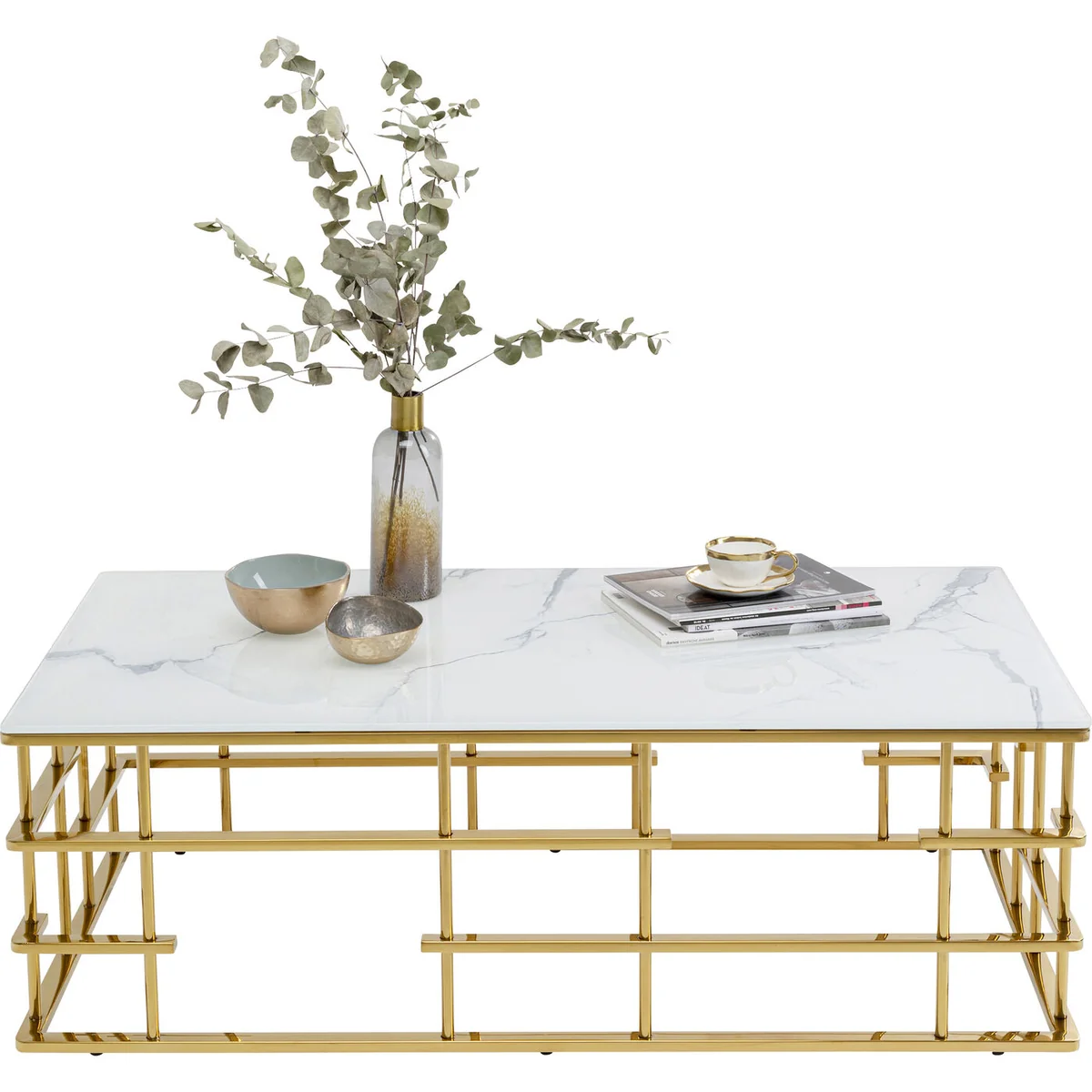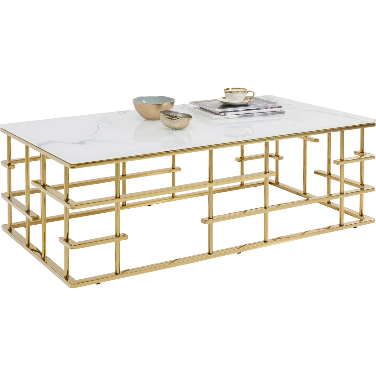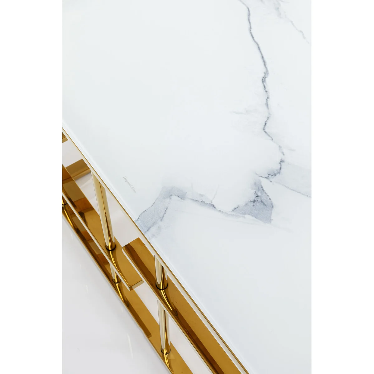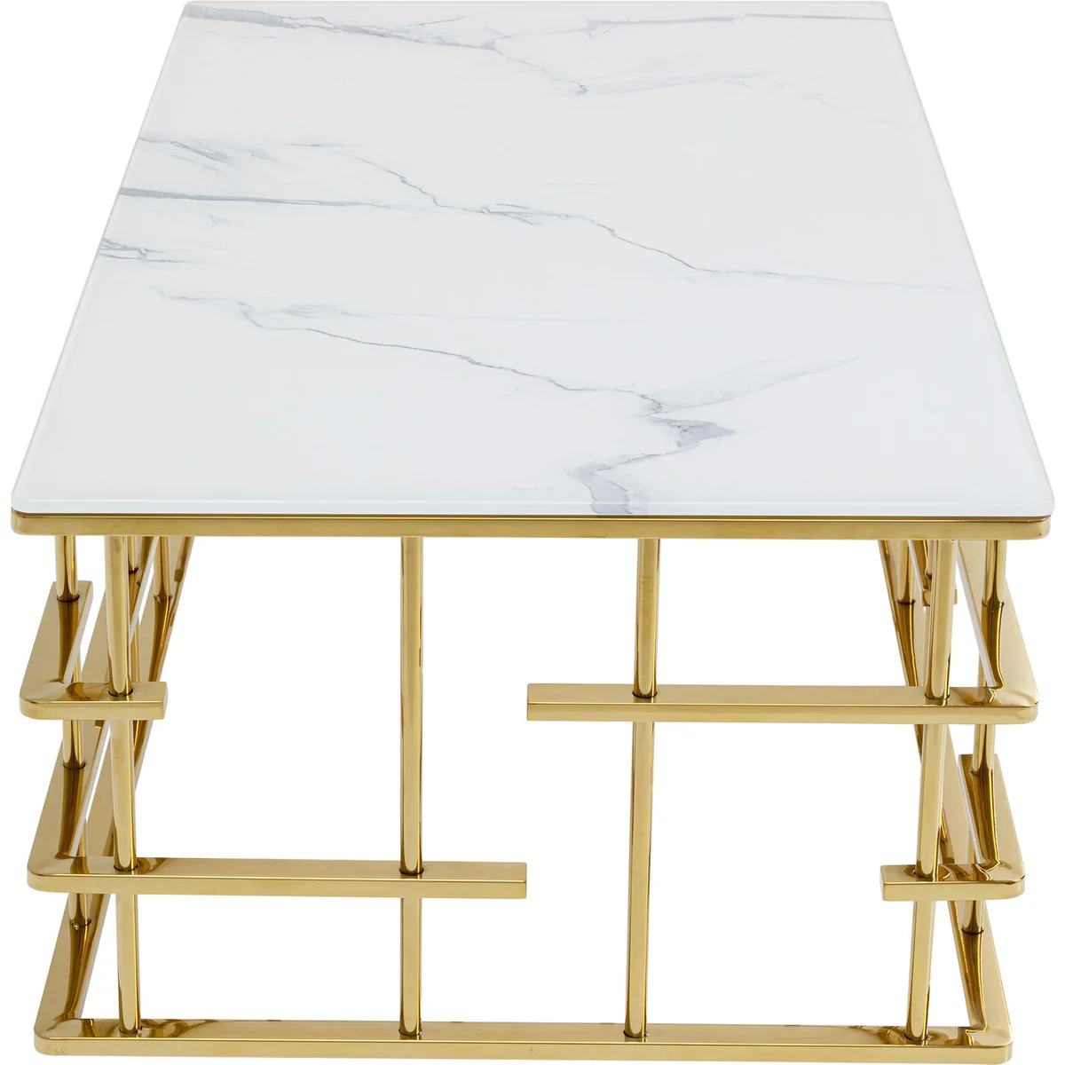 - An upgrade with luxury flair: a large coffee table with an exciting golden base - Table top in an elegant, fashionable marble look - With its dimensions of 130 x 70 centimetres it’s ideal for large interior landscapes and sofas - Side table with glamour which is also practical in that the glass top can simply be wiped clean with a damp cloth - High-quality materials that speak for themselves: ESG safety glass and polished stainless steel