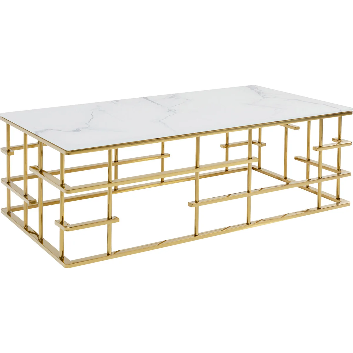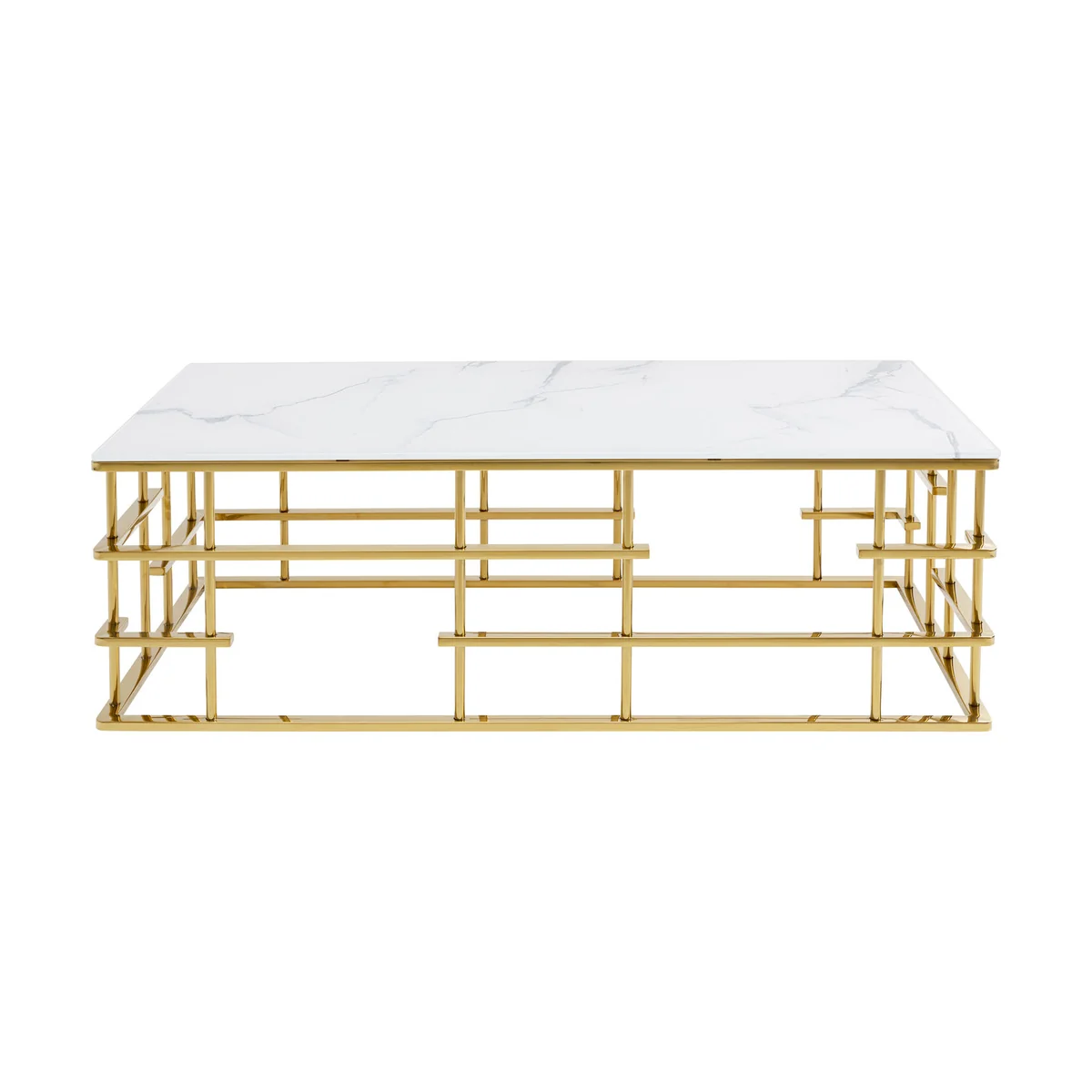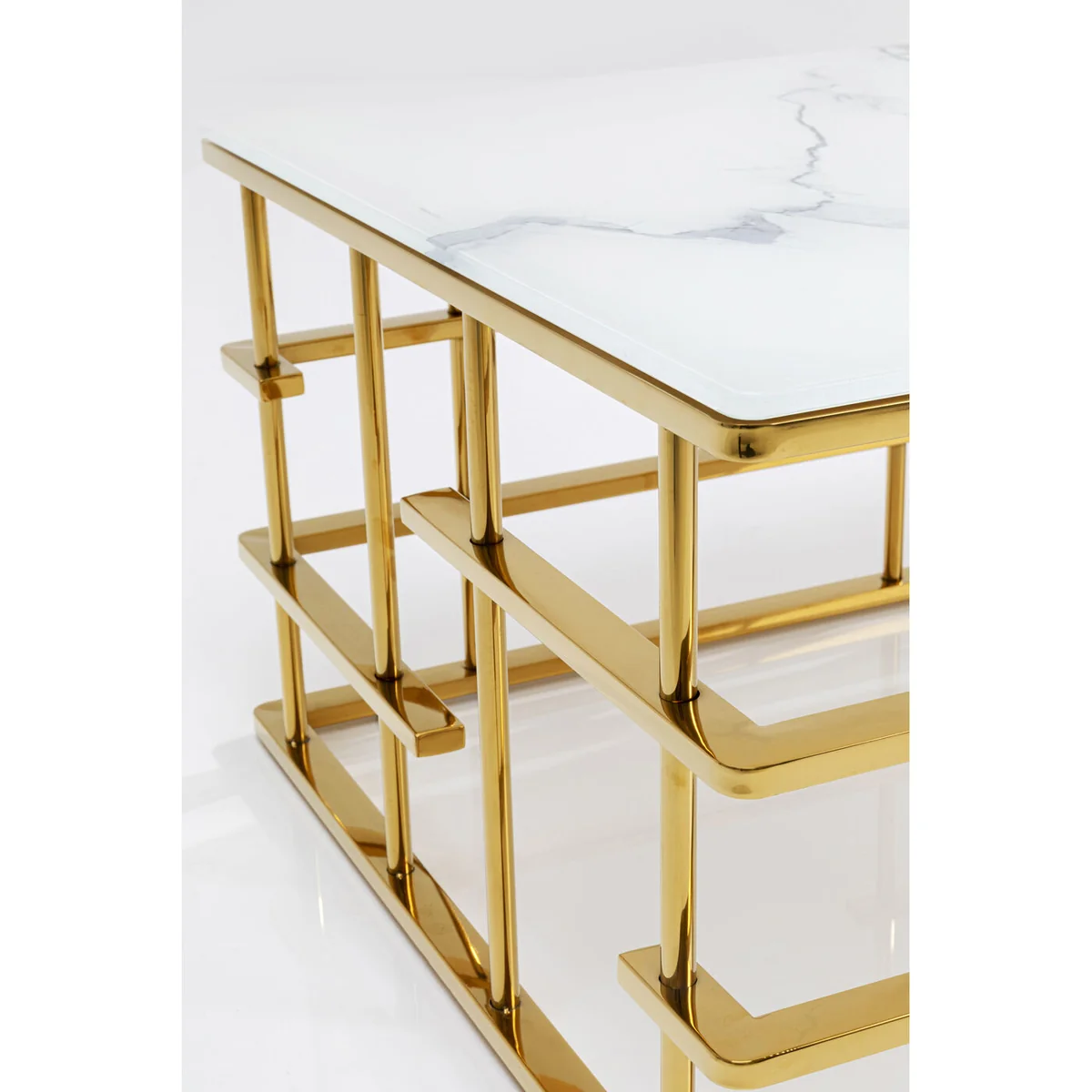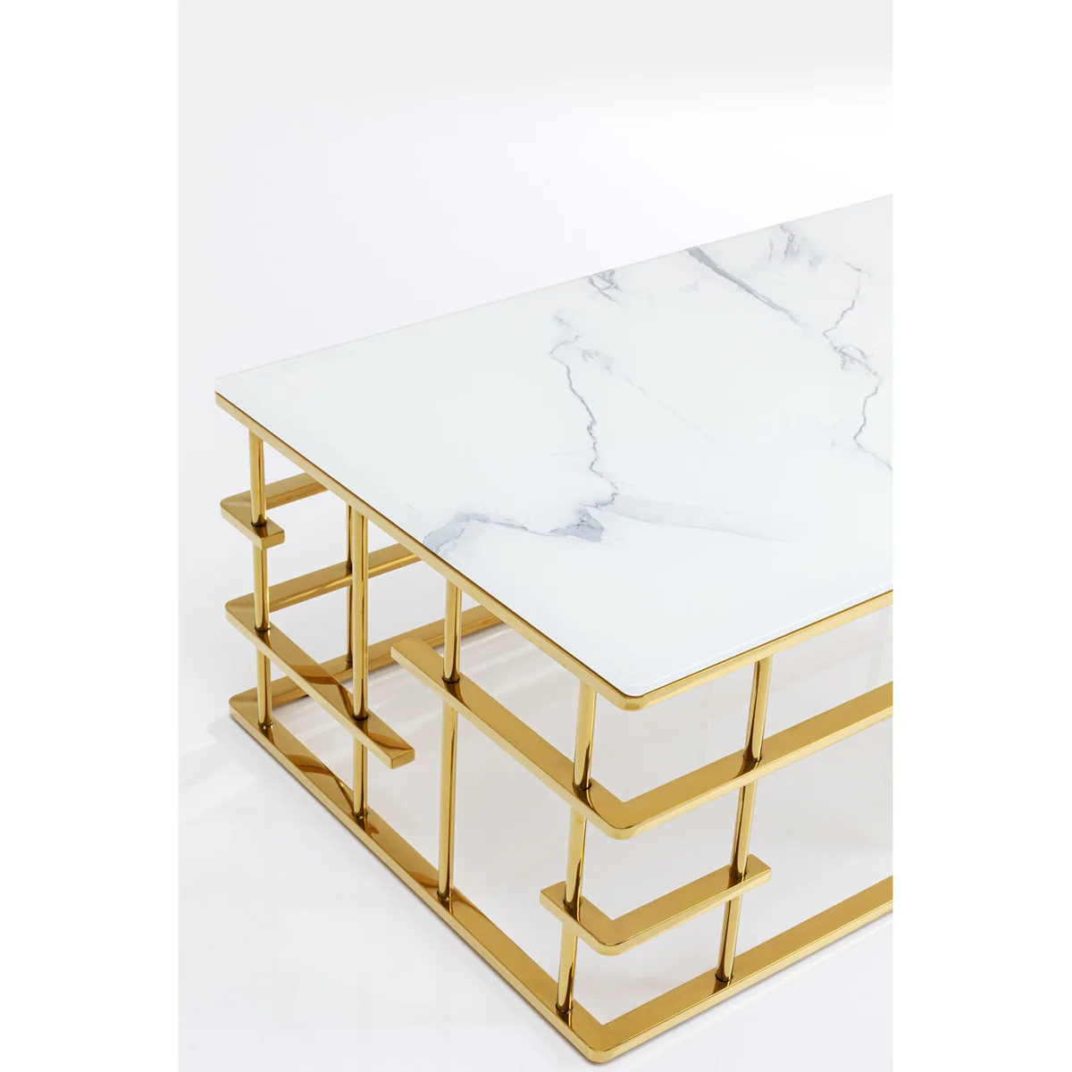 - An upgrade with luxury flair: a large coffee table with an exciting golden base - Table top in an elegant, fashionable marble look - With its dimensions of 130 x 70 centimetres it’s ideal for large interior landscapes and sofas - Side table with glamour which is also practical in that the glass top can simply be wiped clean with a damp cloth - High-quality materials that speak for themselves: ESG safety glass and polished stainless steel