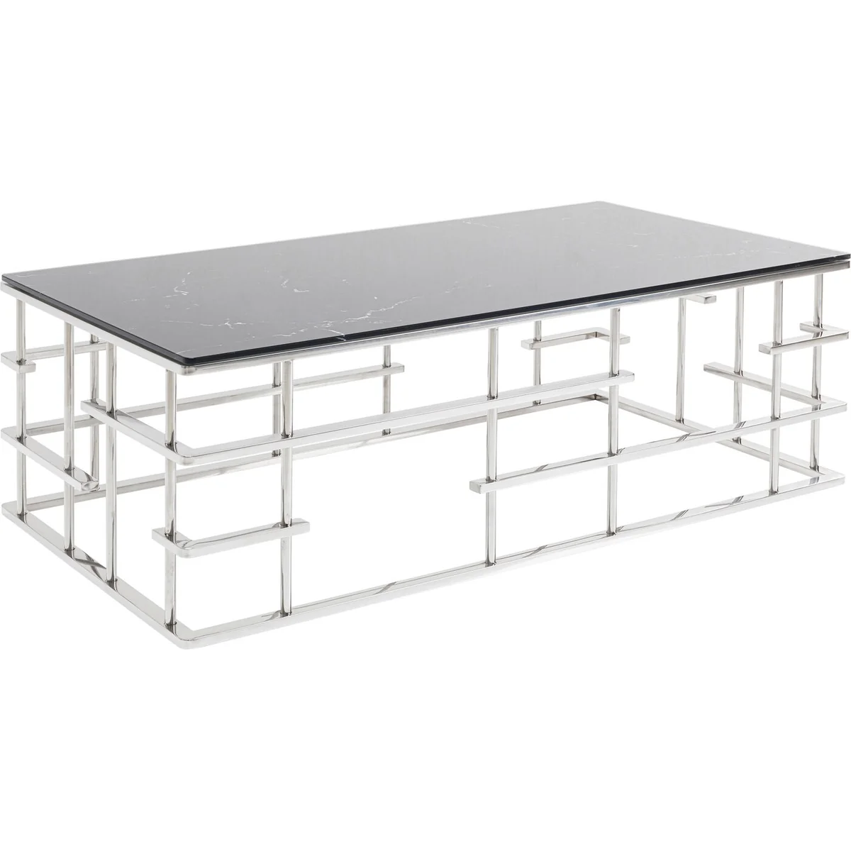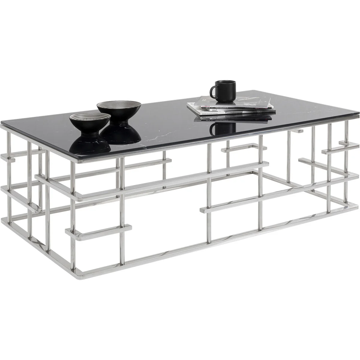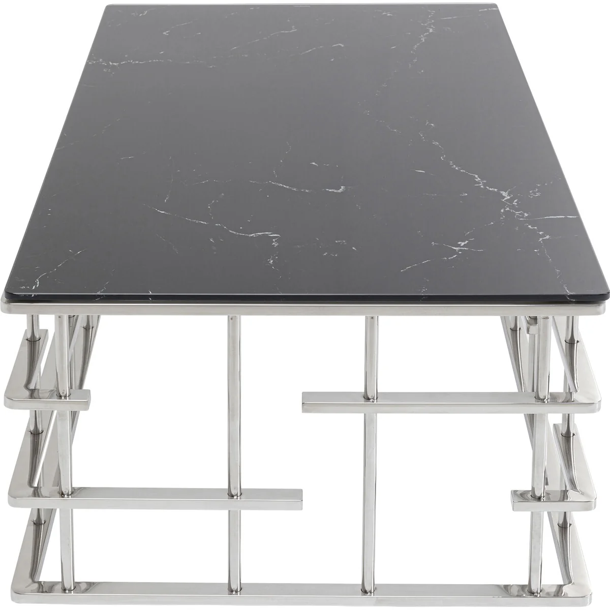 - An upgrade with luxury flair: a large coffee table with an exciting silver base - Table top in an elegant, fashionable marble look - With its dimensions of 130 x 70 centimetres it’s ideal for large interior landscapes and sofas - A side table with glamour which is also practical in that the glass top can simply be wiped clean with a damp cloth - High-quality materials that speak for themselves: ESG safety glass and polished stainless steel