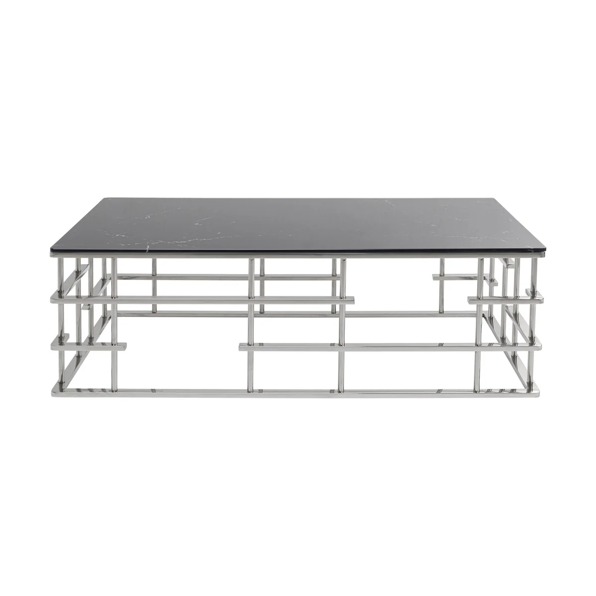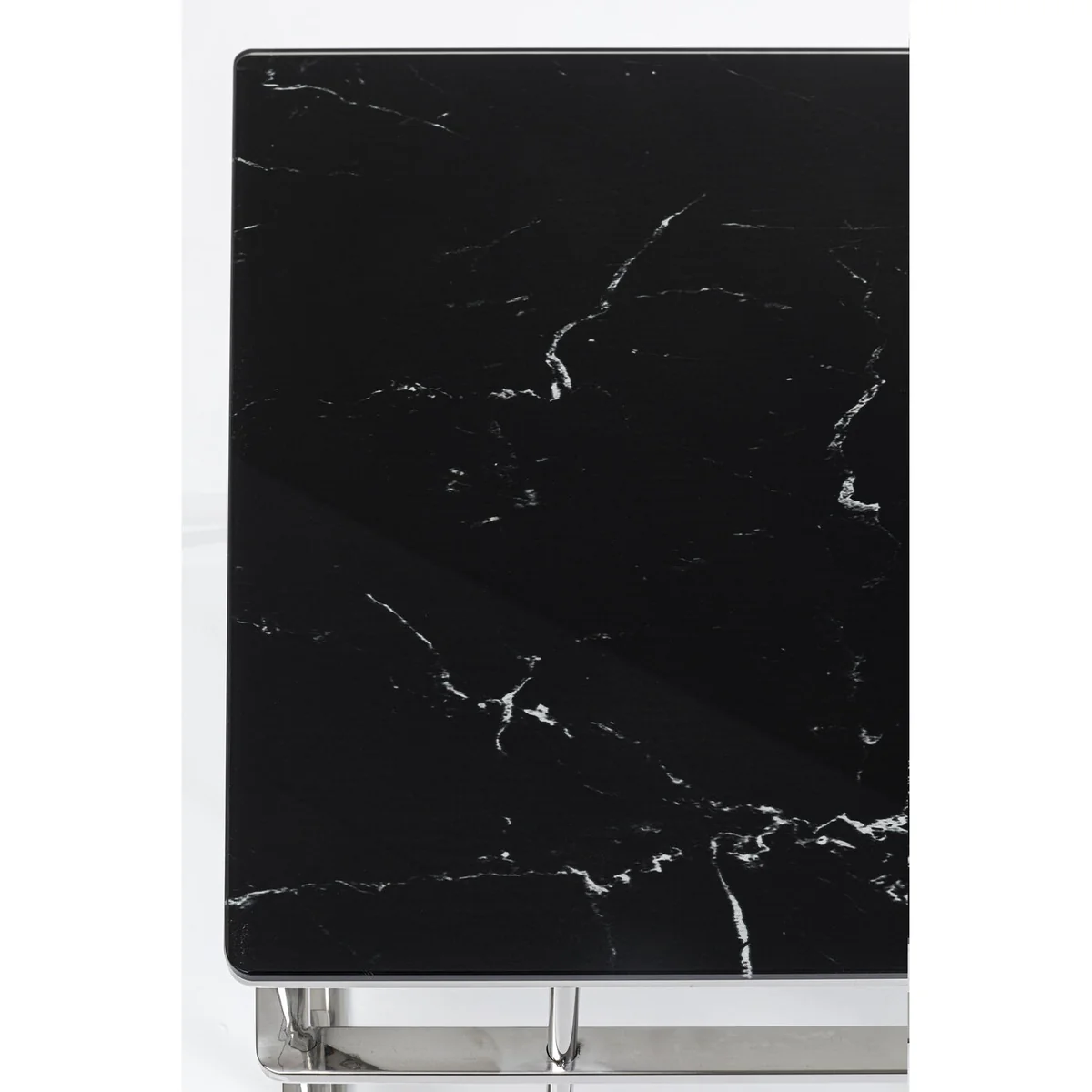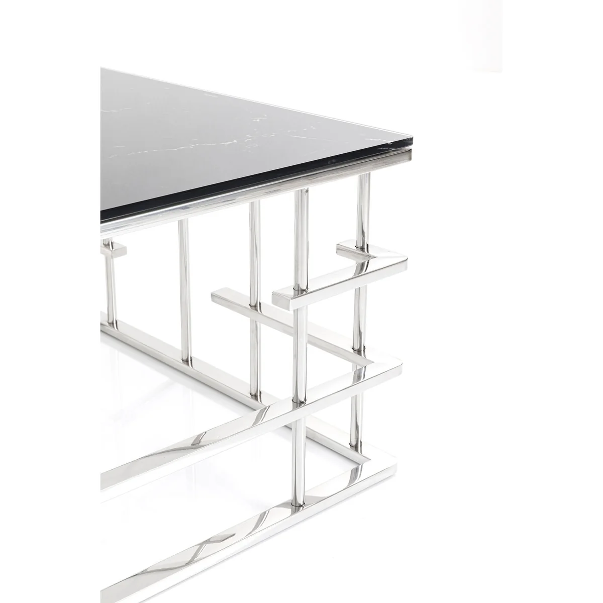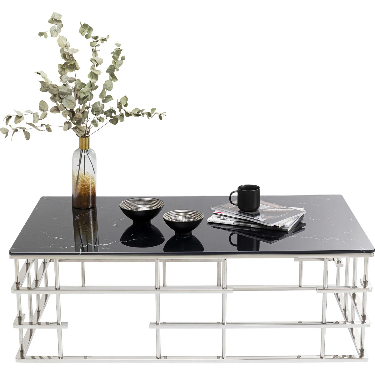 - An upgrade with luxury flair: a large coffee table with an exciting silver base - Table top in an elegant, fashionable marble look - With its dimensions of 130 x 70 centimetres it’s ideal for large interior landscapes and sofas - A side table with glamour which is also practical in that the glass top can simply be wiped clean with a damp cloth - High-quality materials that speak for themselves: ESG safety glass and polished stainless steel