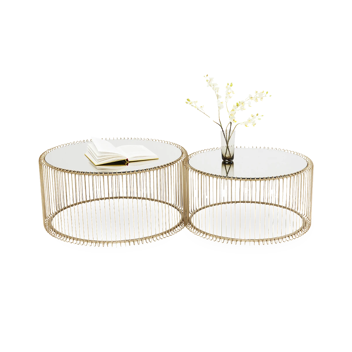 Coffee tables are just like handbags - they're the hallmark of your look. In this special case there are two hallmarks, because the Wire Brass model comes as a duo. Not only the circular shape of this table is impressive, but also the filigree, high-gloss frame and the mirrored top. Lots of similar models available.