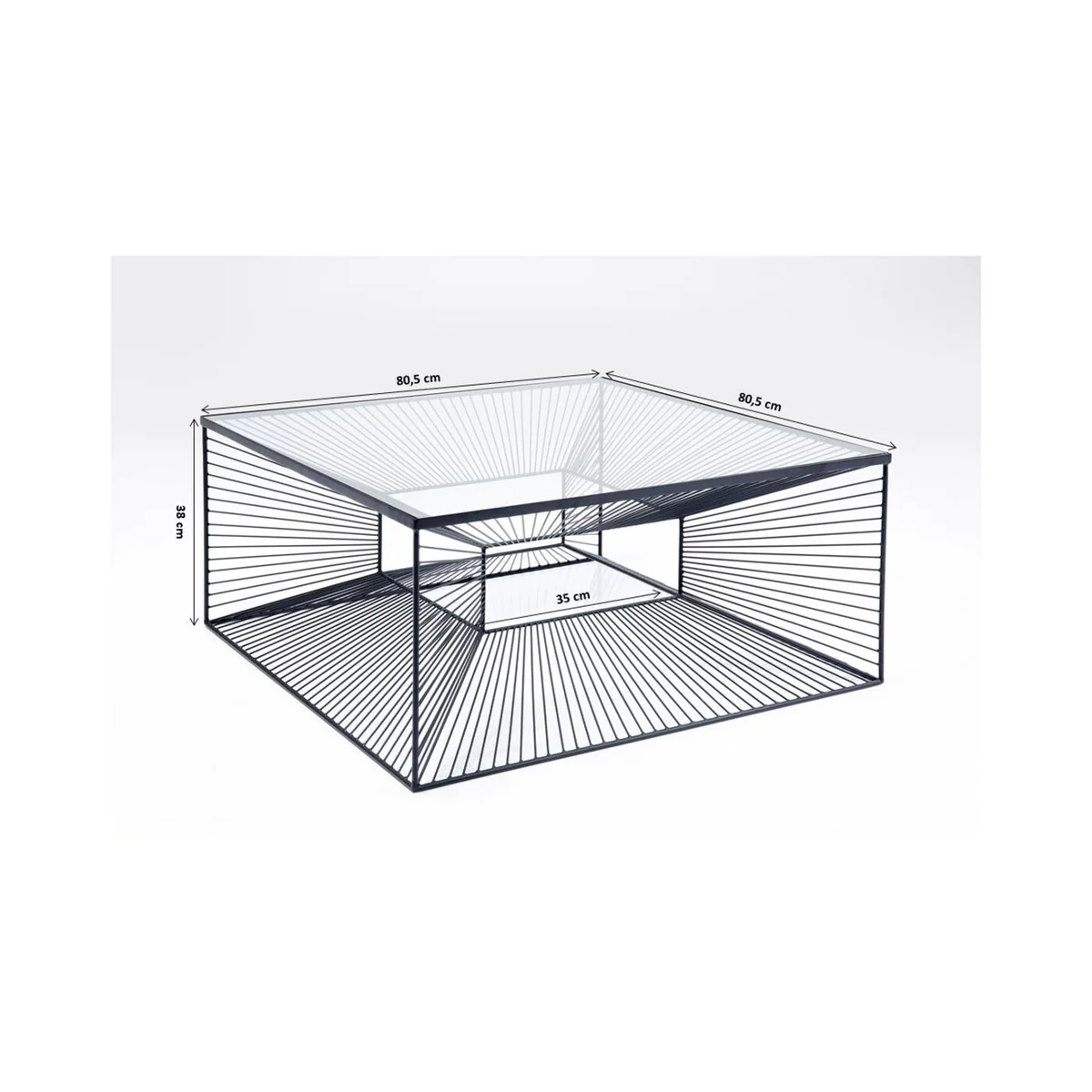 Key features of this coffee table include its robust steel frame, powder-coated for longevity, and a sleek glass top, measuring 80.5 cm in length and depth. Its compact size makes it suitable for small to medium-sized rooms, while its height of 38 cm ensures it's within easy reach.