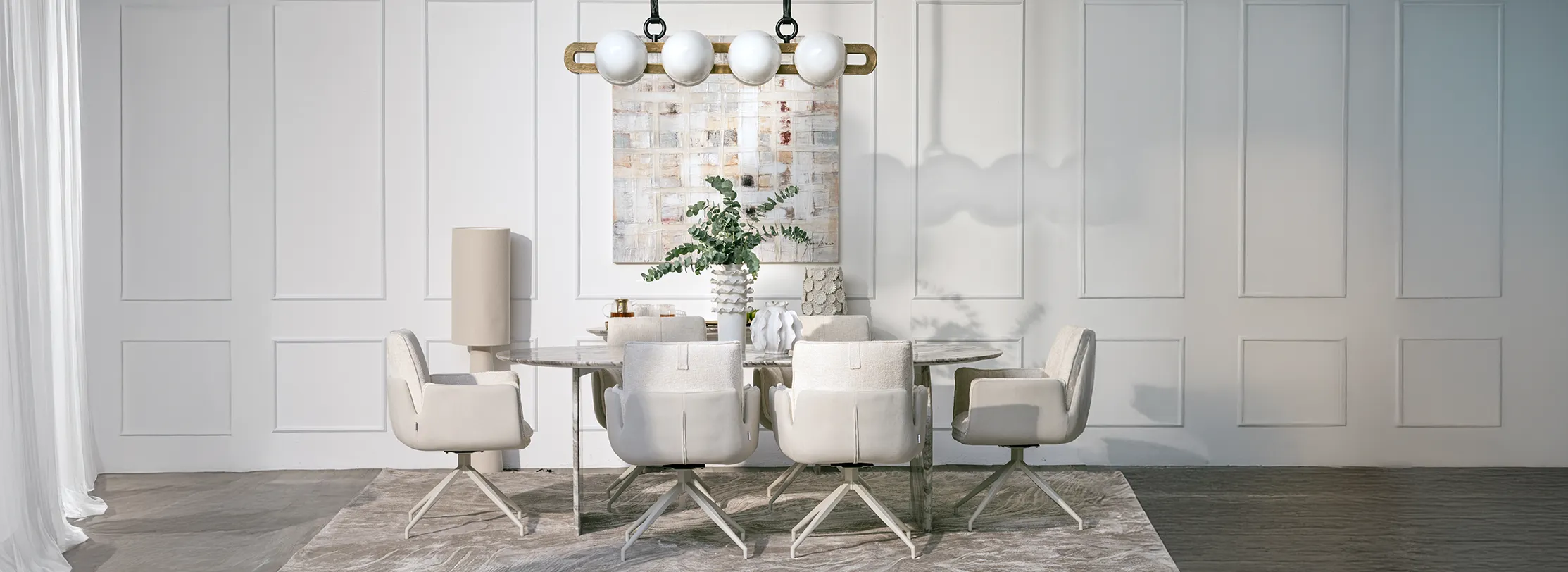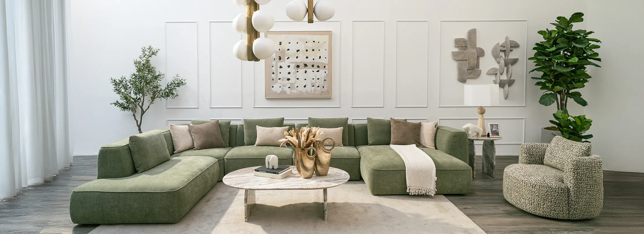 The Kyoto Collection captures the essence of timeless refinement - a living space where tranquility and sophistication coexist in perfect balance. Every element is intentional, the soft sage tones lend a soothing warmth, while the clean, sculpted lines of the sofa create a grounded sense of structure. The marble table, with its intricate veining, introduces a natural rhythm that contrasts beautifully with the muted palette surrounding it. Subtle golden accents add a quiet glow, catching light without demanding attention. Touches of greenery bring freshness and depth, softening the geometry of the room and reminding us that calm can be both elegant and alive. Together, these elements compose a space that feels effortlessly poised, a reflection of serenity shaped through design. The Kyoto Collection invites you to slow down, breathe, and reconnect with your surroundings where every piece is crafted not just to fill a room, but to define its harmony.