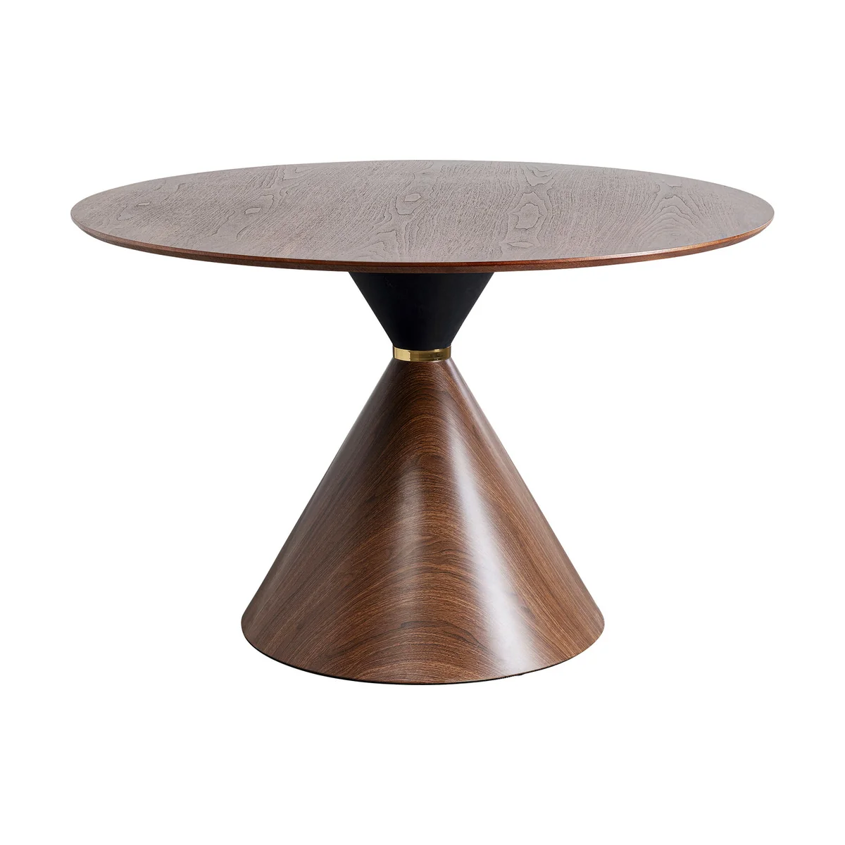 Enjoy convivial gatherings and experience stylish design - this round dining table combines timeless elegance with modern sophistication. The warm walnut look brings a natural coziness to the dining room, while the striking wooden structure creates a sophisticated look. The conically shaped central leg provides stability and ensures a stylish, harmonious overall look. Golden and black details create elegant accents that perfectly complement modern, classic or mid-century interiors. Combine with colored velvet chairs for a luxurious look or with simple seating furniture for timeless lightness - a real highlight for any interior!