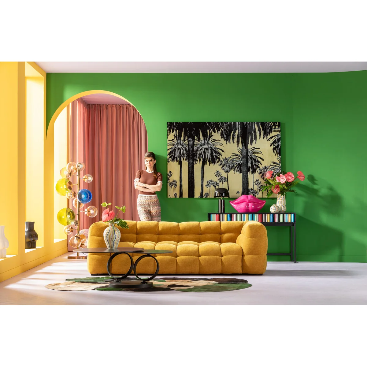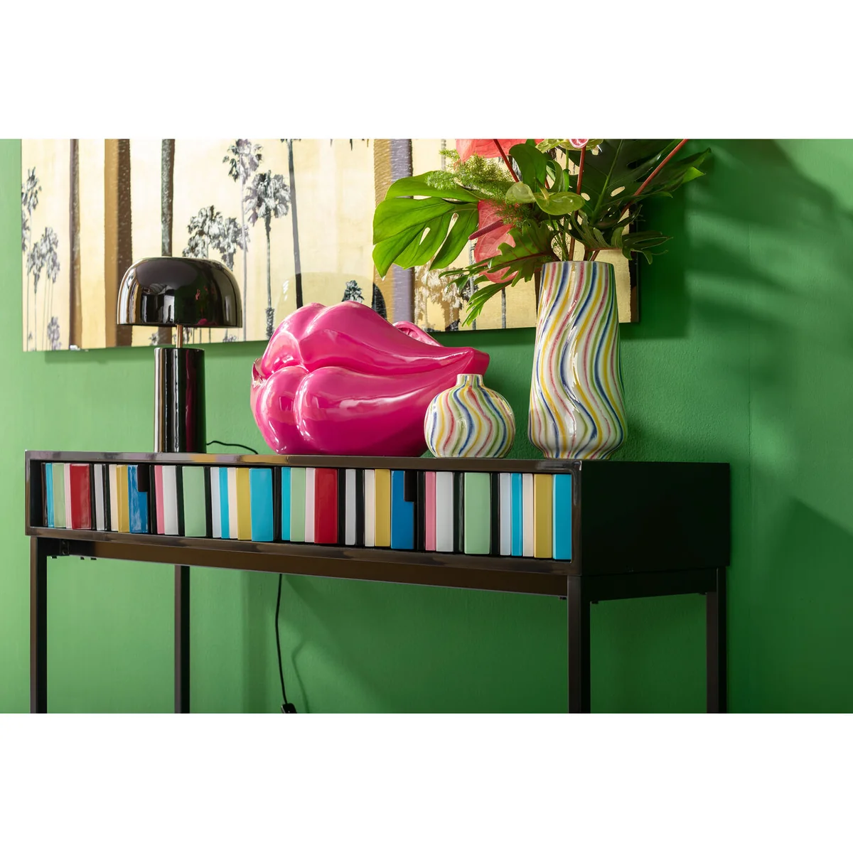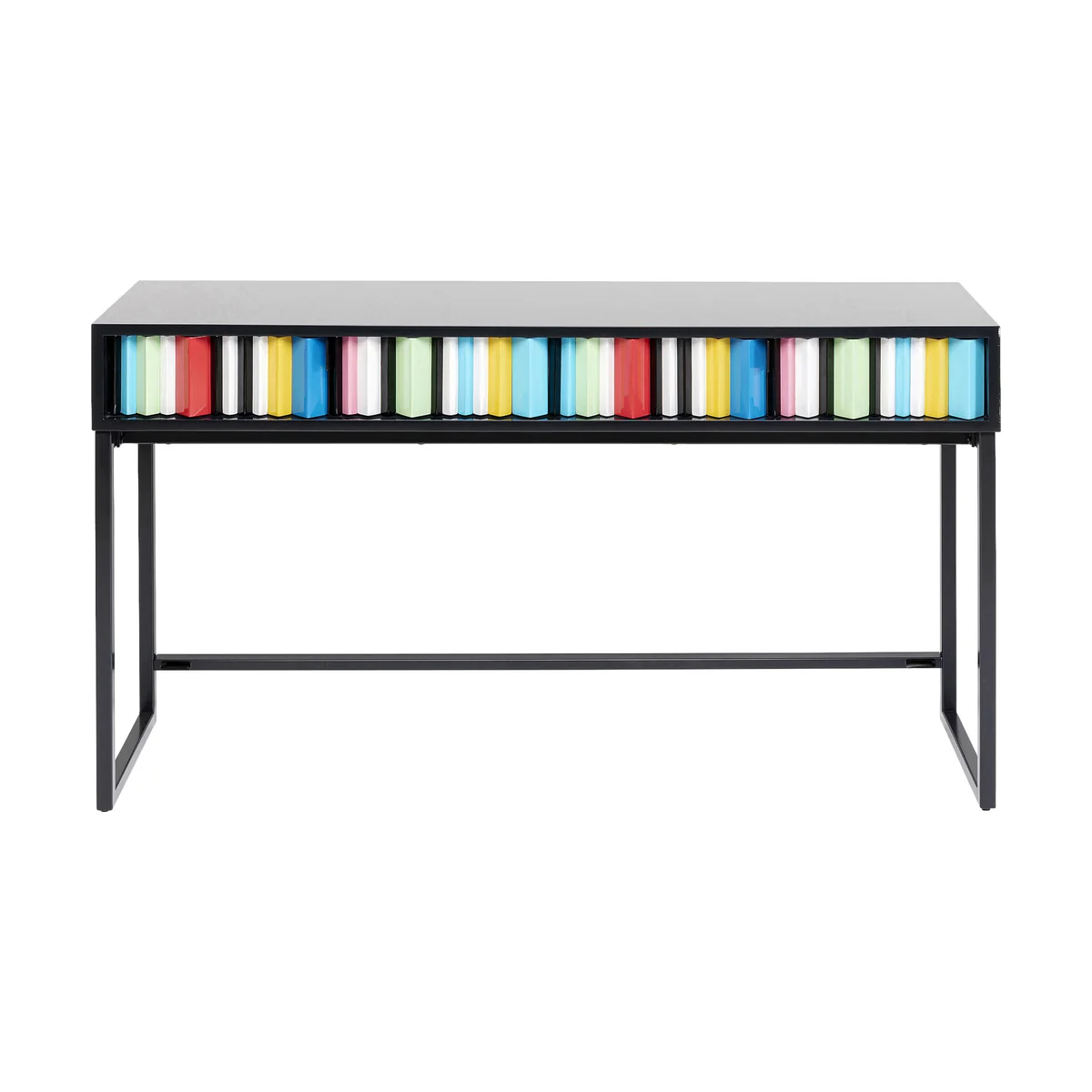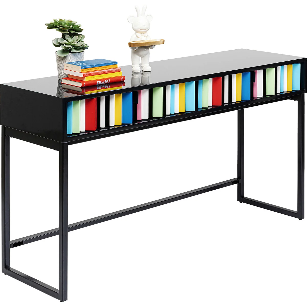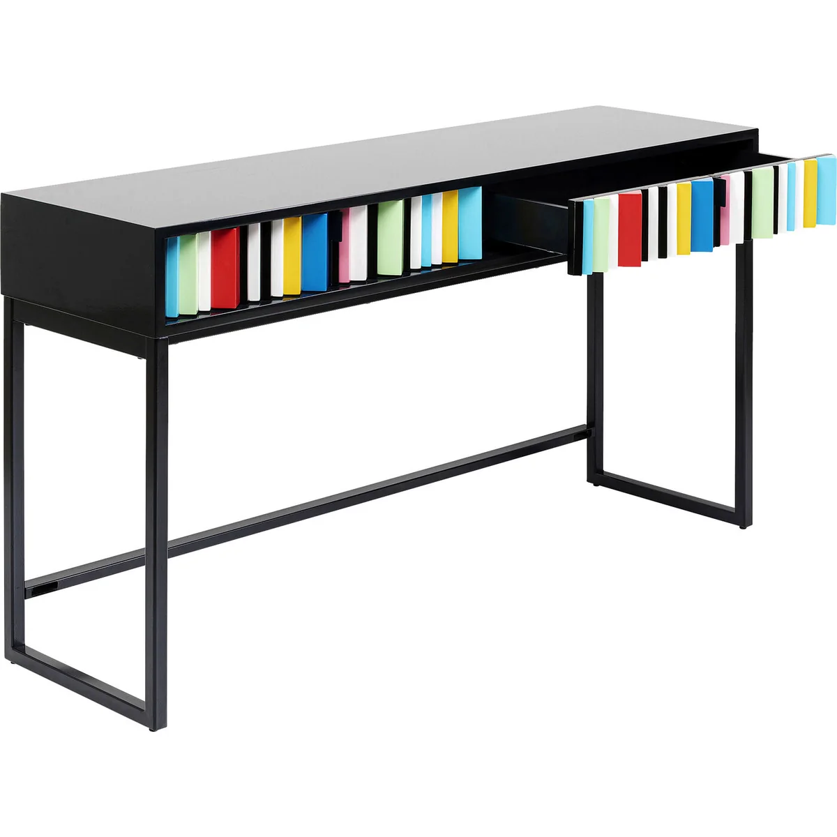 • Black console table with a colourful front measuring 78 x 135.5 x 40 cm (H/W/D) • A piece of designer furniture created exclusively for KARE by Morten Georgsen • Two drawers with sculptural fronts and narrow, black h