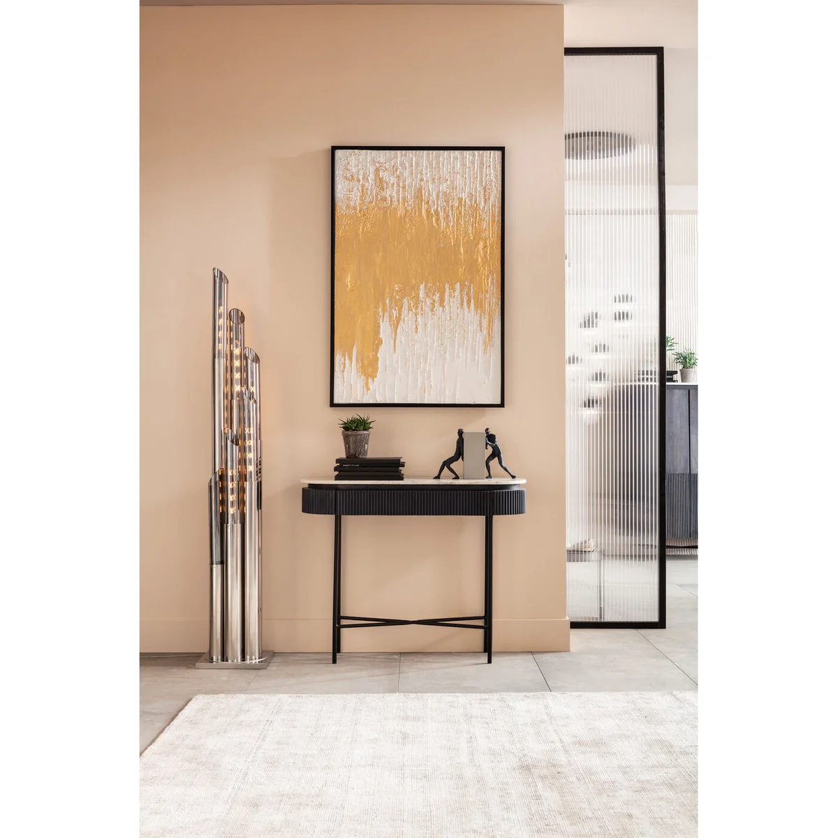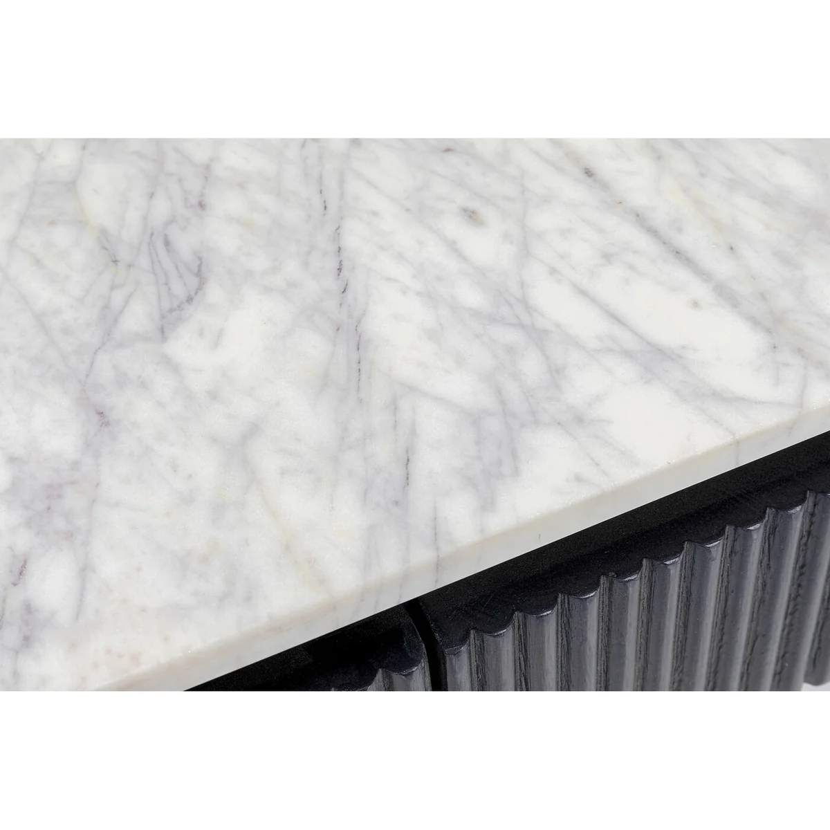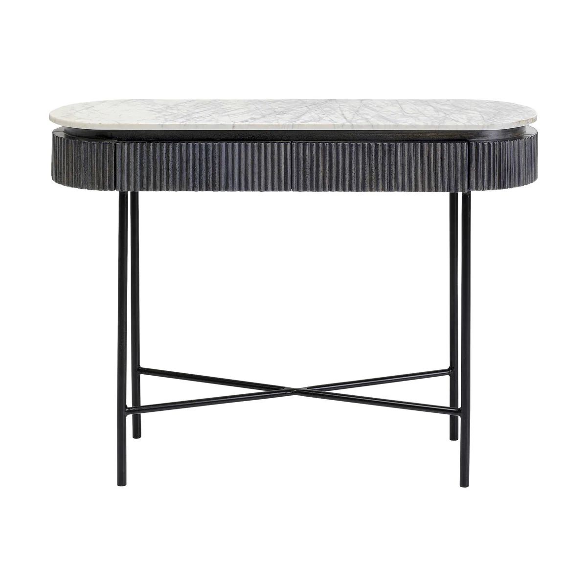 Noble and special - this hallway console wants more. The shape: a flat oval, the storage surface made of light, genuine marble and a body that stands out among the console tables with dark gray fronts and sides made of solid wood in a ribbed look. Glenn radiates discreet noblesse and timeless elegance and convinces with valuable materials. Material: (table top: marble, drawer body: medium density fiberboard lacquered, base: steel powder coated, drawer front: mango solid wood lacquered).