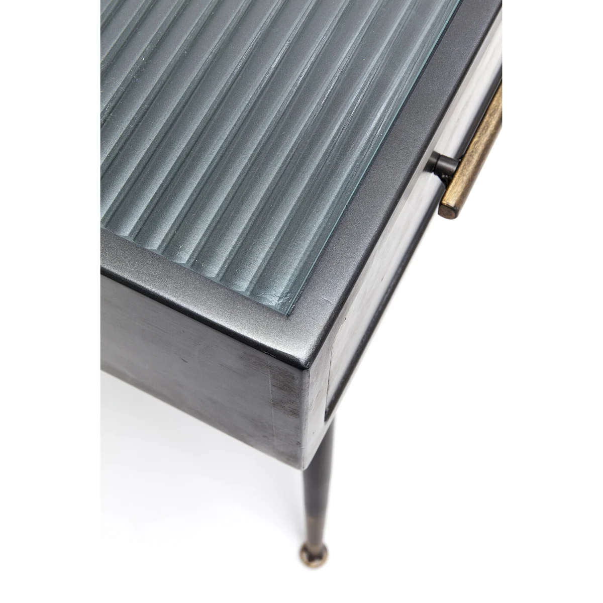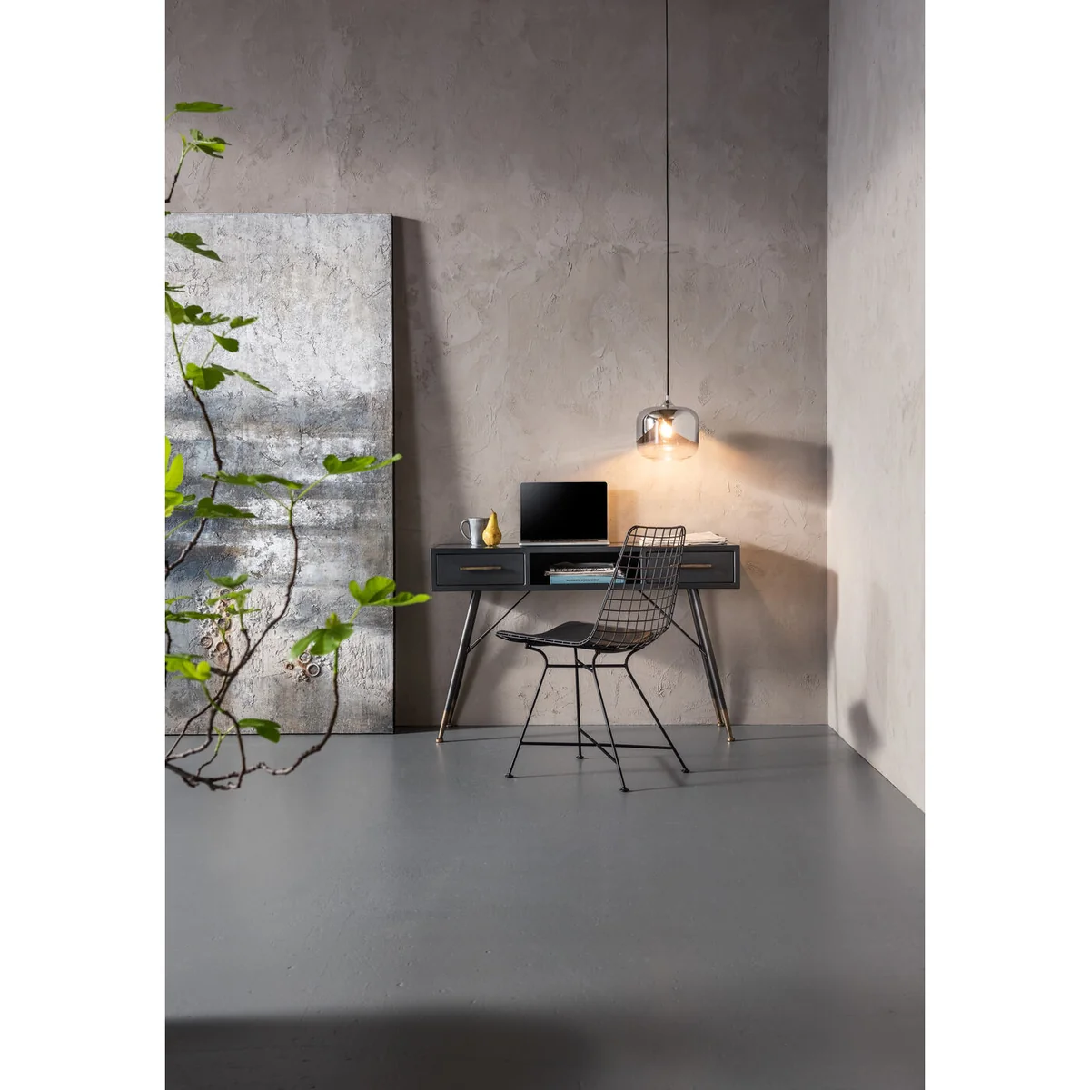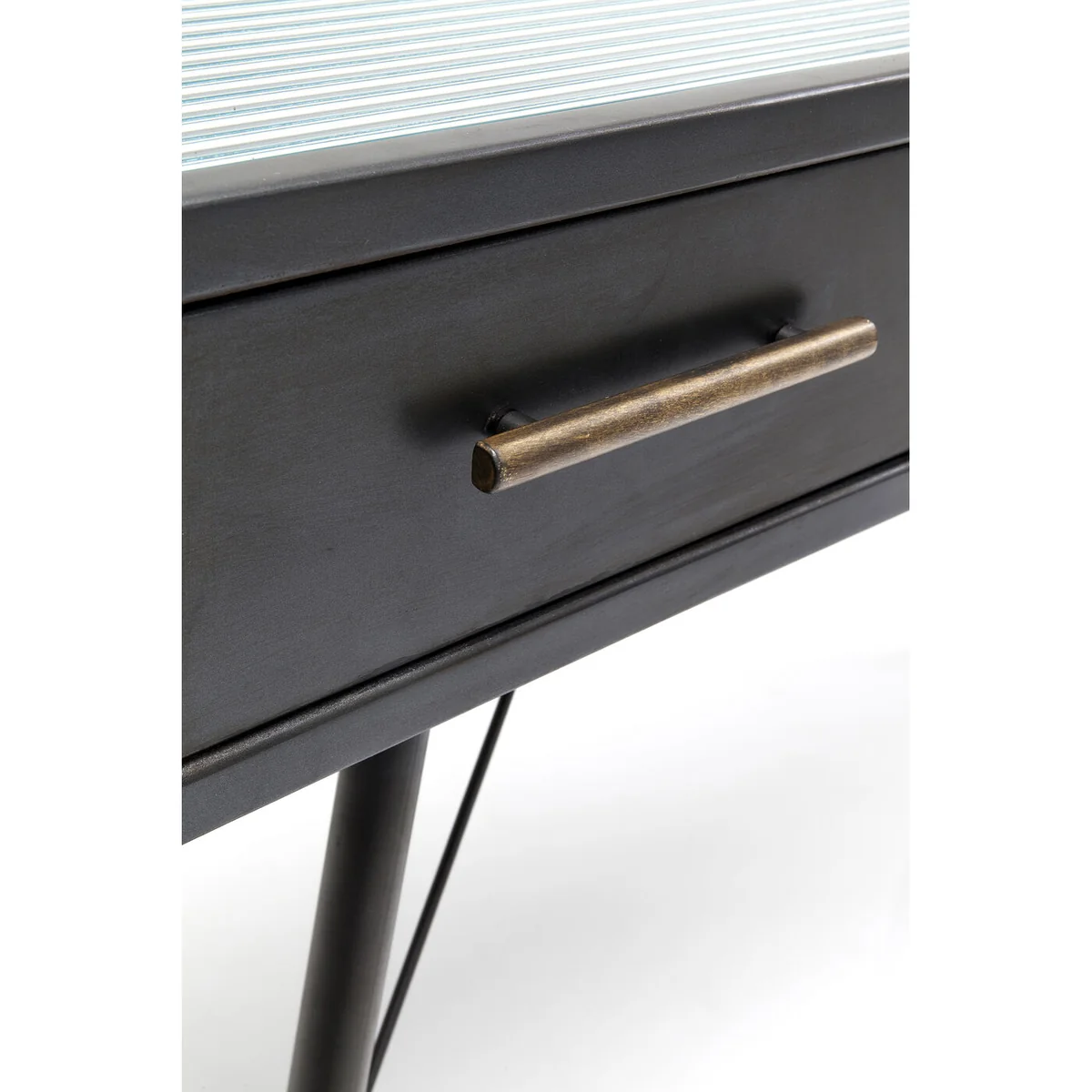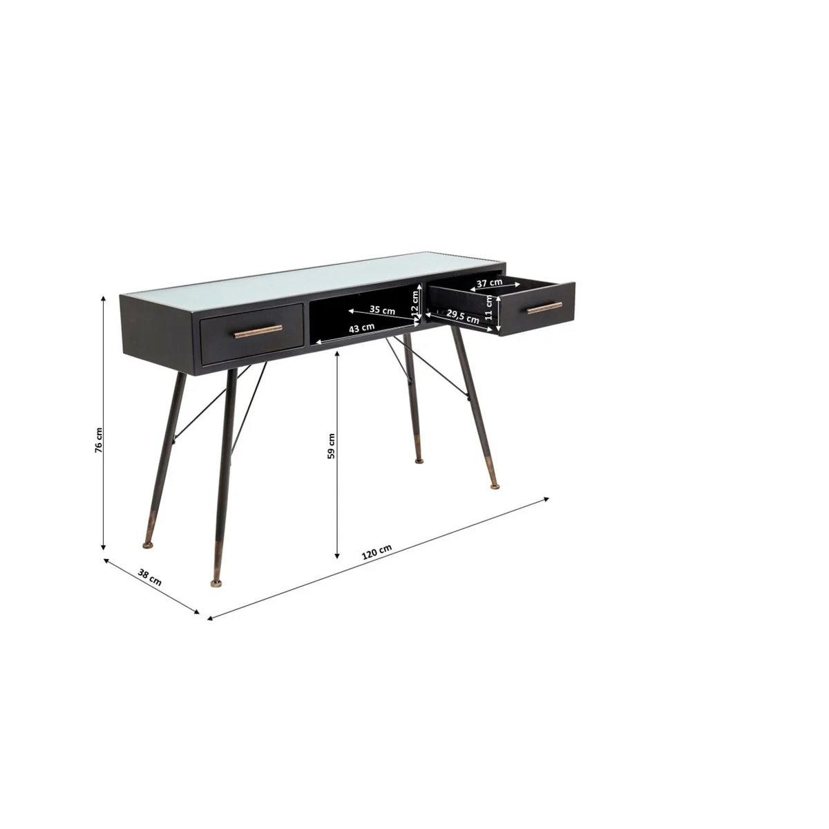 ● Light-footed, black console table in an understated look that can also be used as a laptop table ● A mix of steel and glass in discreet industrial chic ● Refined details: the filigree struts and the brass-coloured handles and feet ● Versatile use - whether classic as a console table, part-time desk or make-up table in the bedroom ● Also looks good in narrow corridors