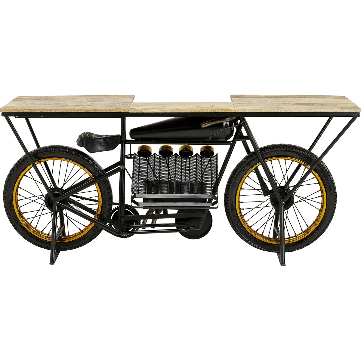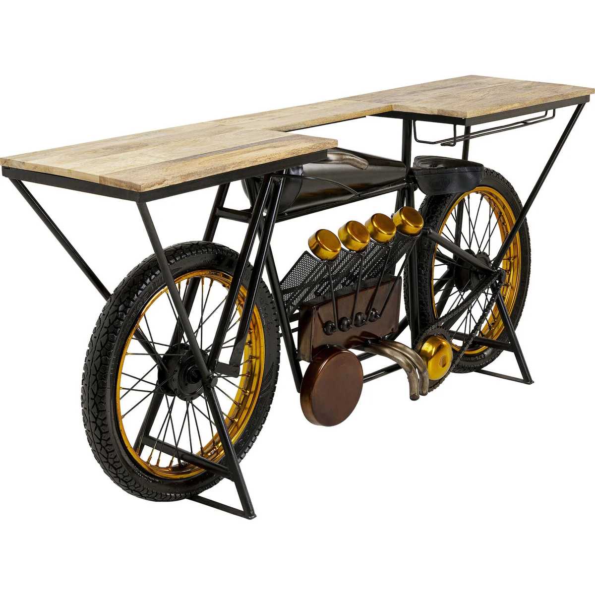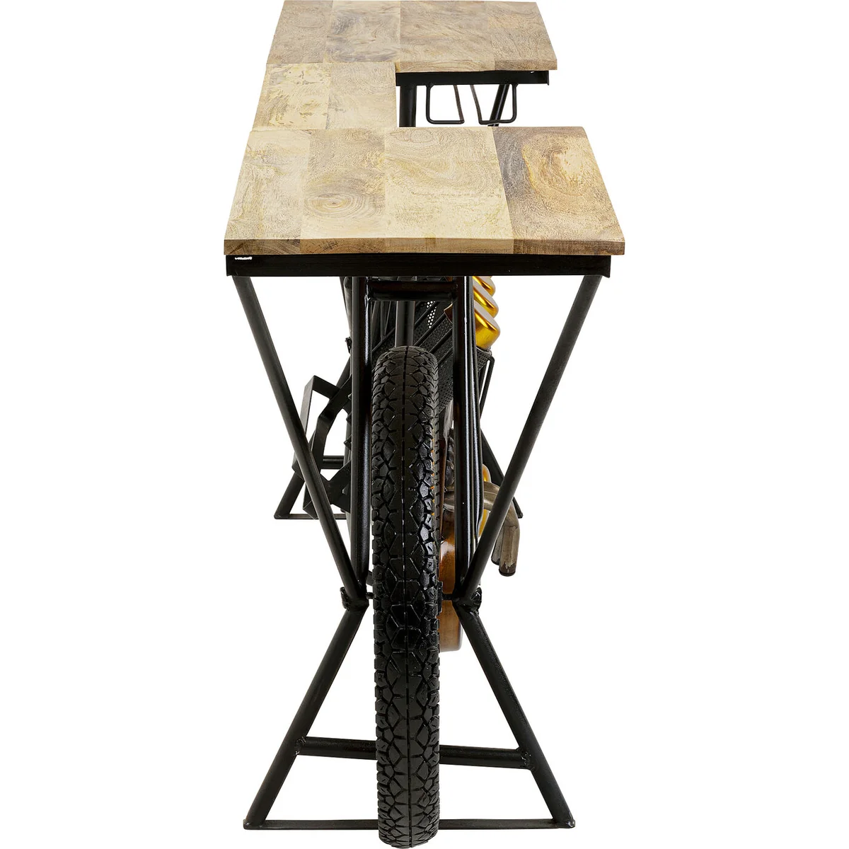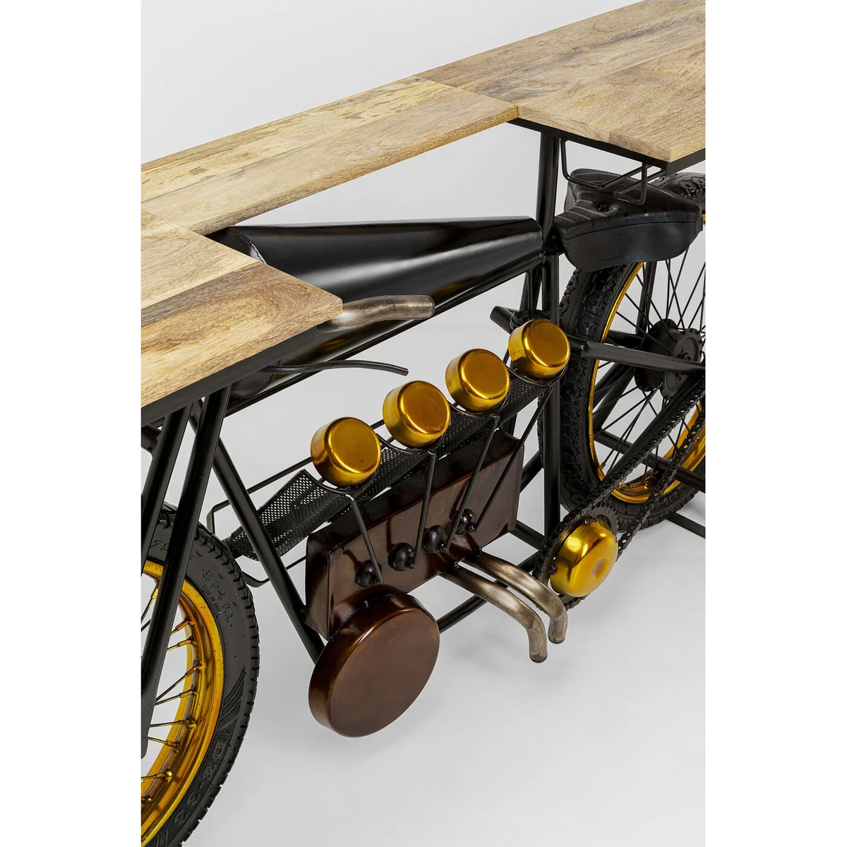 • Wide console table in the shape of a motorbike with a solid wood top and black steel frame. Handmade! • Perfect as a home bar. You don't have to be an Easy Rider to enjoy an after-work drink here • Retro charm: the inspiration for this two-wheeled piece of furniture came from the DKW, a classic dating back to the 1940s • The cylinders contain the good stuff: four bottles can be stored there and there are fixtures for glasses • The bike also generates good vibes as a DJ console, a casual enhancement for offices and co-working spaces