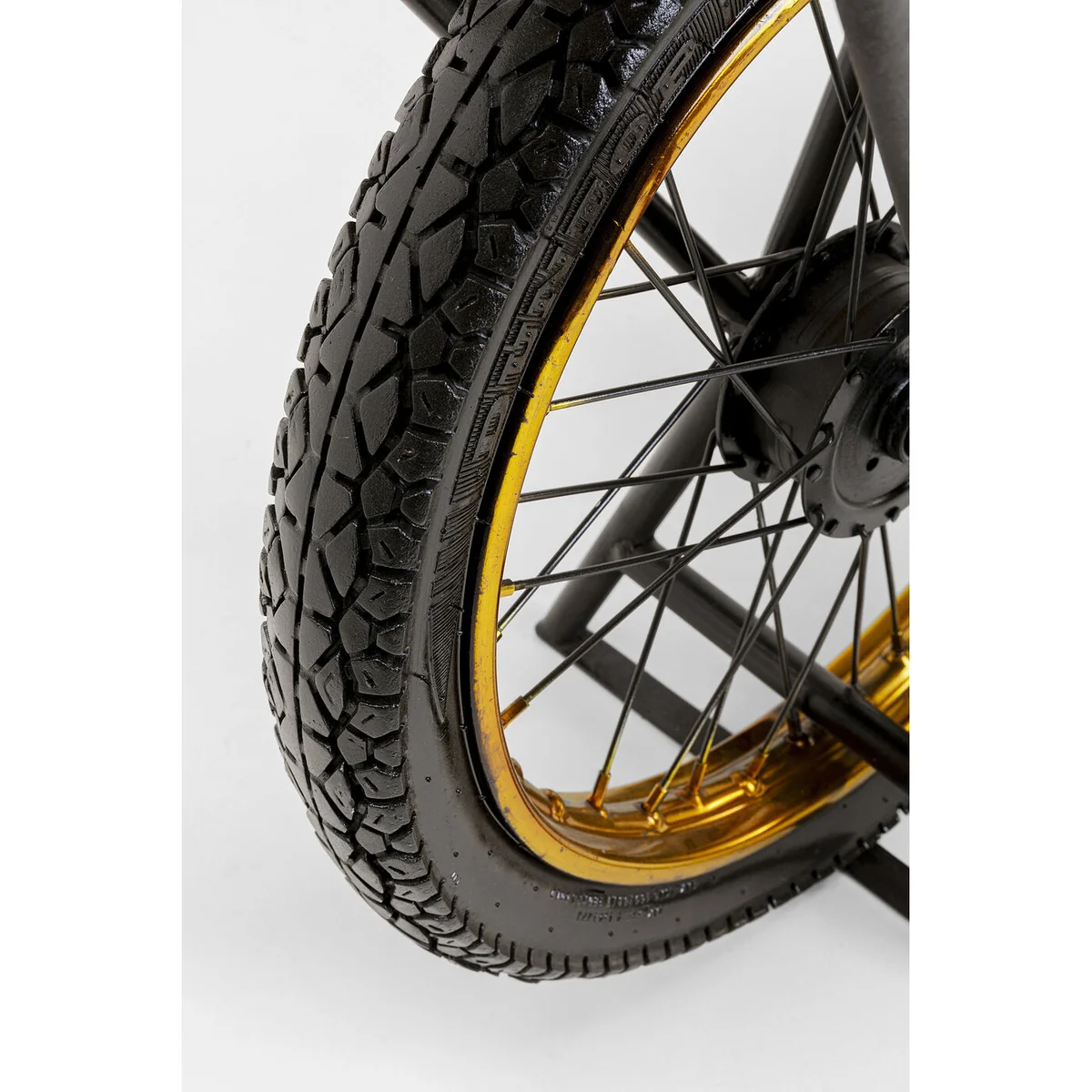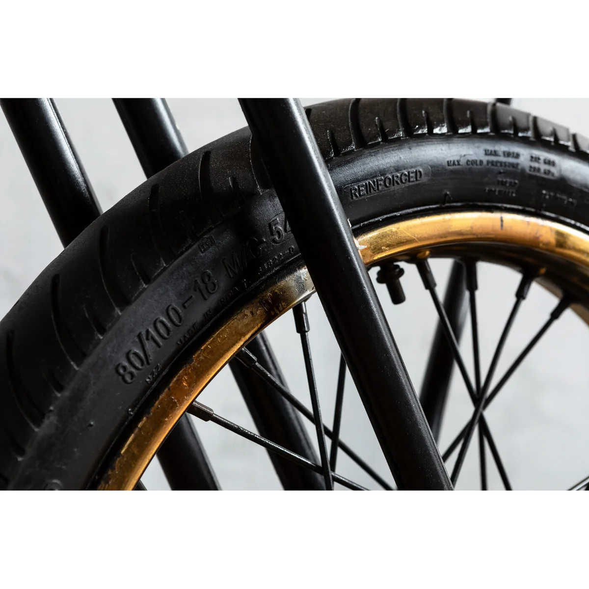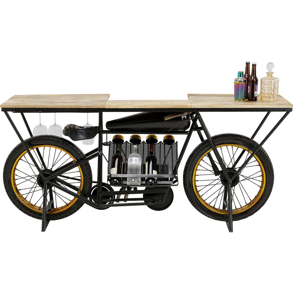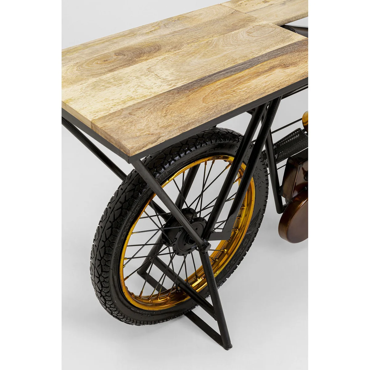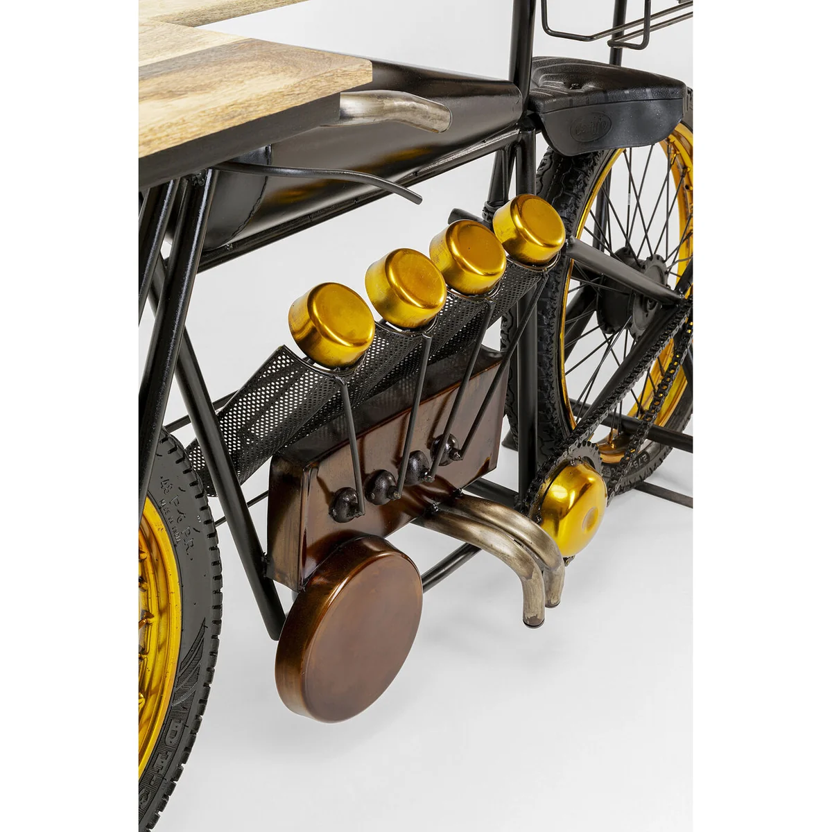 • Wide console table in the shape of a motorbike with a solid wood top and black steel frame. Handmade! • Perfect as a home bar. You don't have to be an Easy Rider to enjoy an after-work drink here • Retro charm: the inspiration for this two-wheeled piece of furniture came from the DKW, a classic dating back to the 1940s • The cylinders contain the good stuff: four bottles can be stored there and there are fixtures for glasses • The bike also generates good vibes as a DJ console, a casual enhancement for offices and co-working spaces