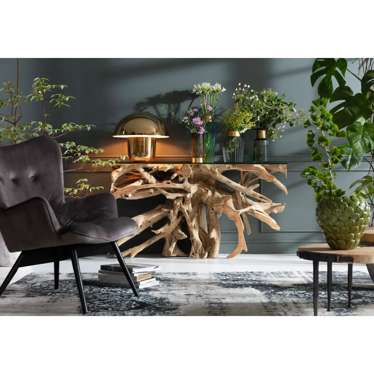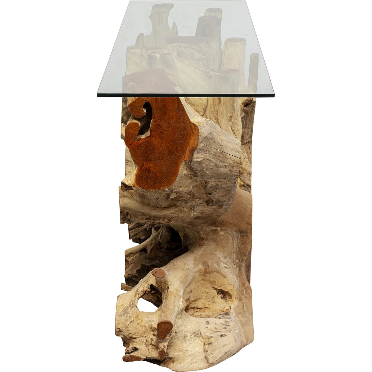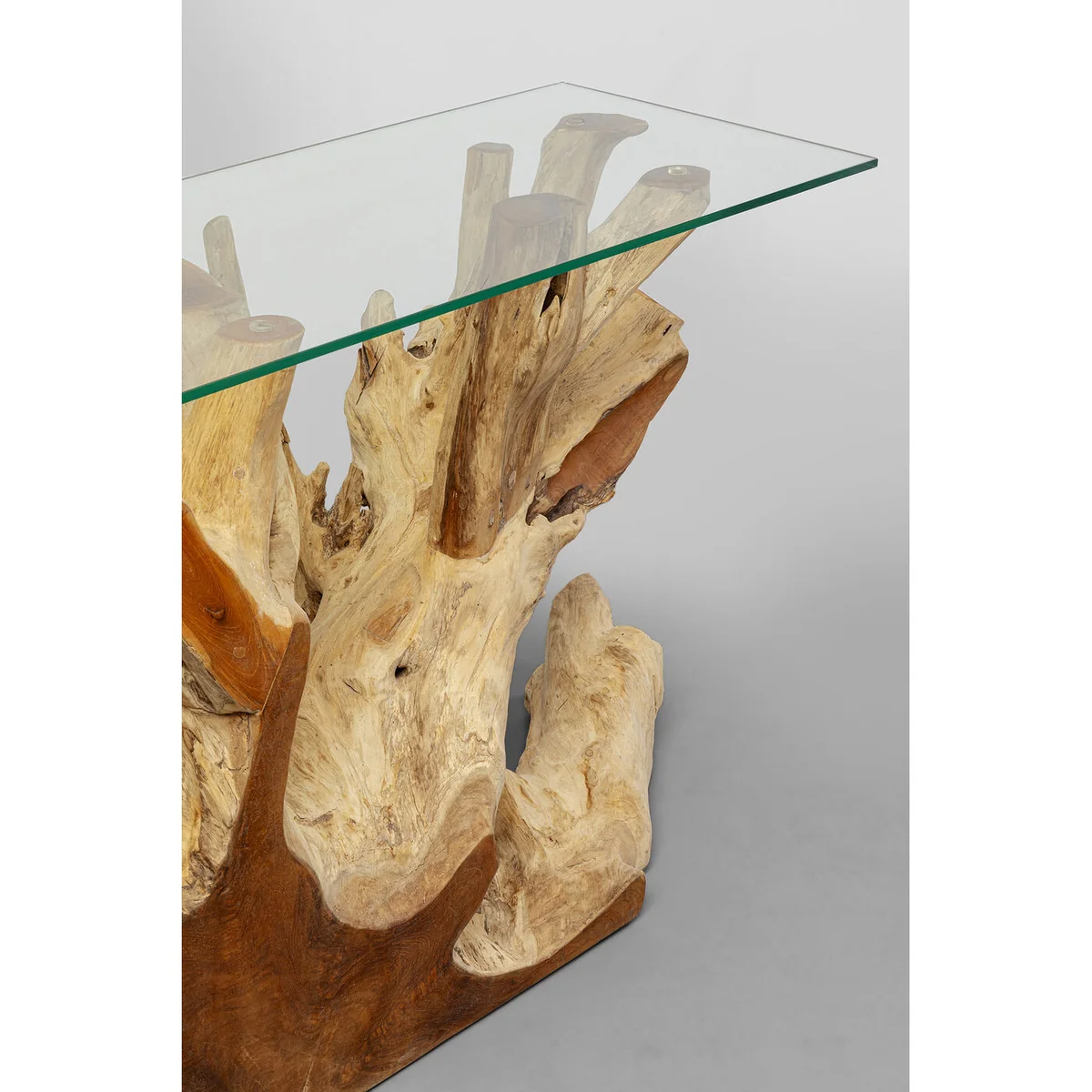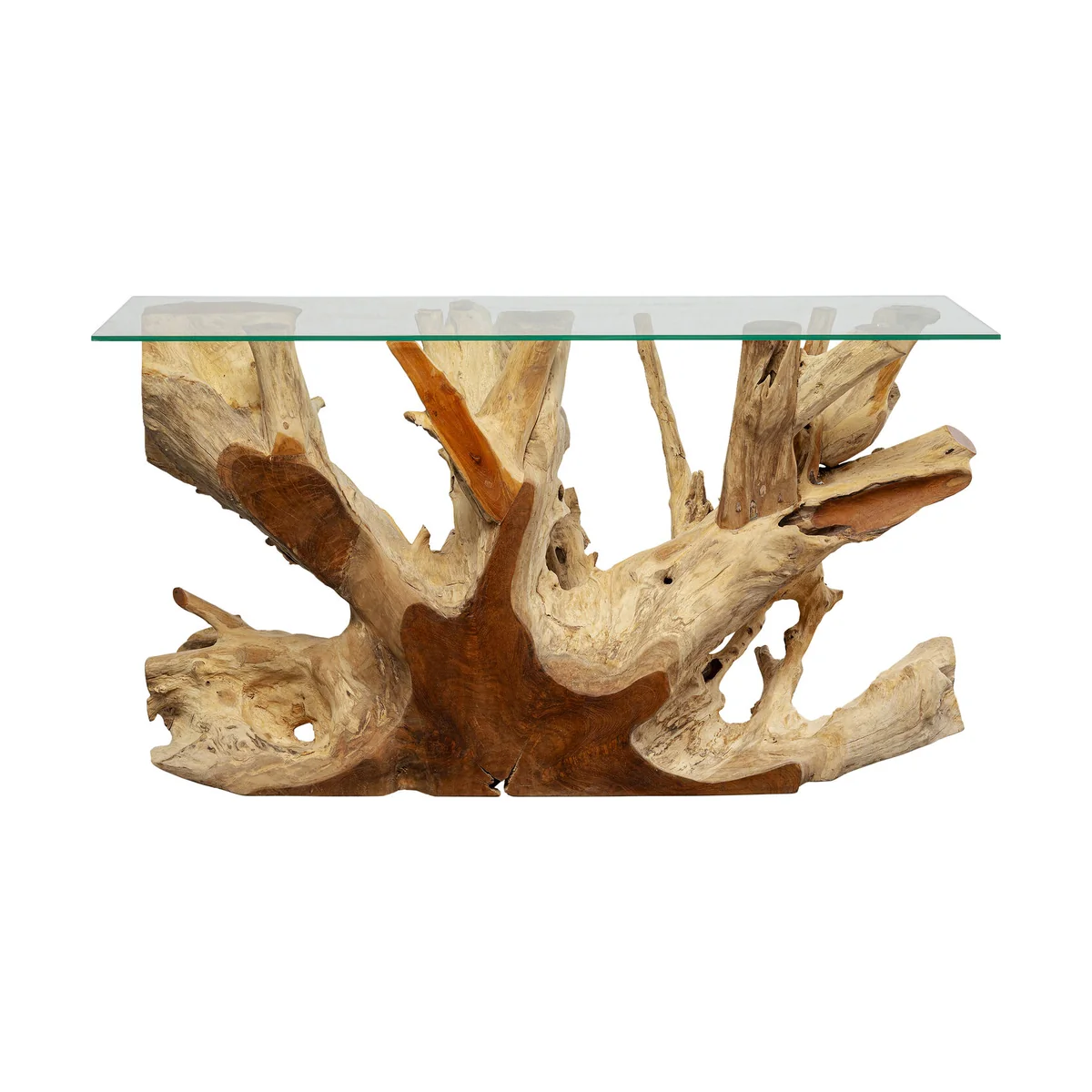 An attractive console table that combines elegance with natural charm. The root-shaped frame is made of natural teak and supports a top of 10mm thick glass. Each piece is unique. Root series.