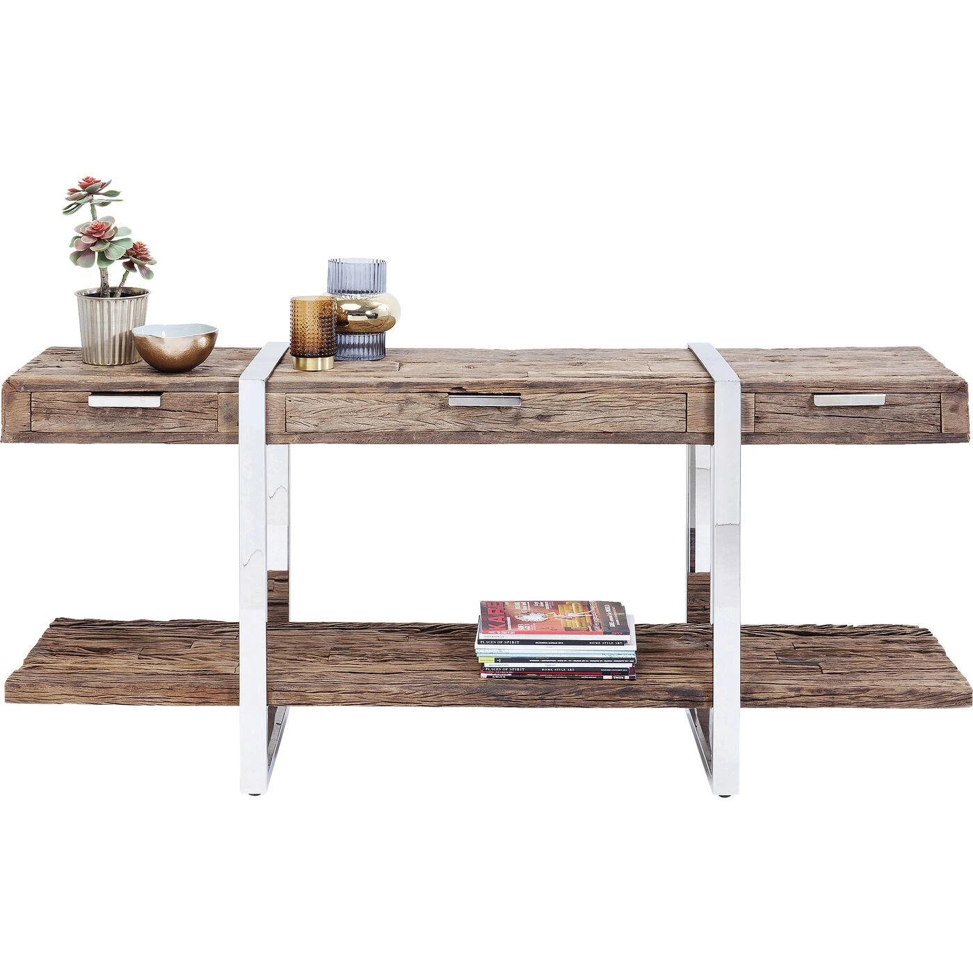 • Wide console table made of recycled solid wood with stainless steel frame and three practical drawers