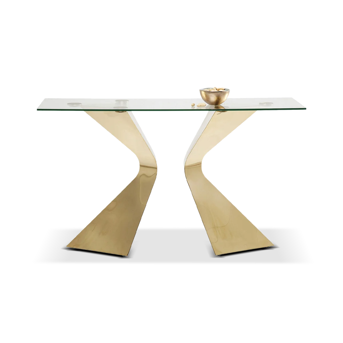 Luxury appeal and sophistication. A little glamour never hurt anyone. This console table could also be a modern piece of furniture sculpture in a museum. It makes an impact with its creative refinement and elegant, slightly eccentric touch. The safety-glass table top is supported by two artistically shaped, gold-coloured legs. The table is perfectly suited for a glamorous and eclectic interior, and provides a touch of Hollywood appeal. This enhances the star quality of your furnishing. Other versions available.