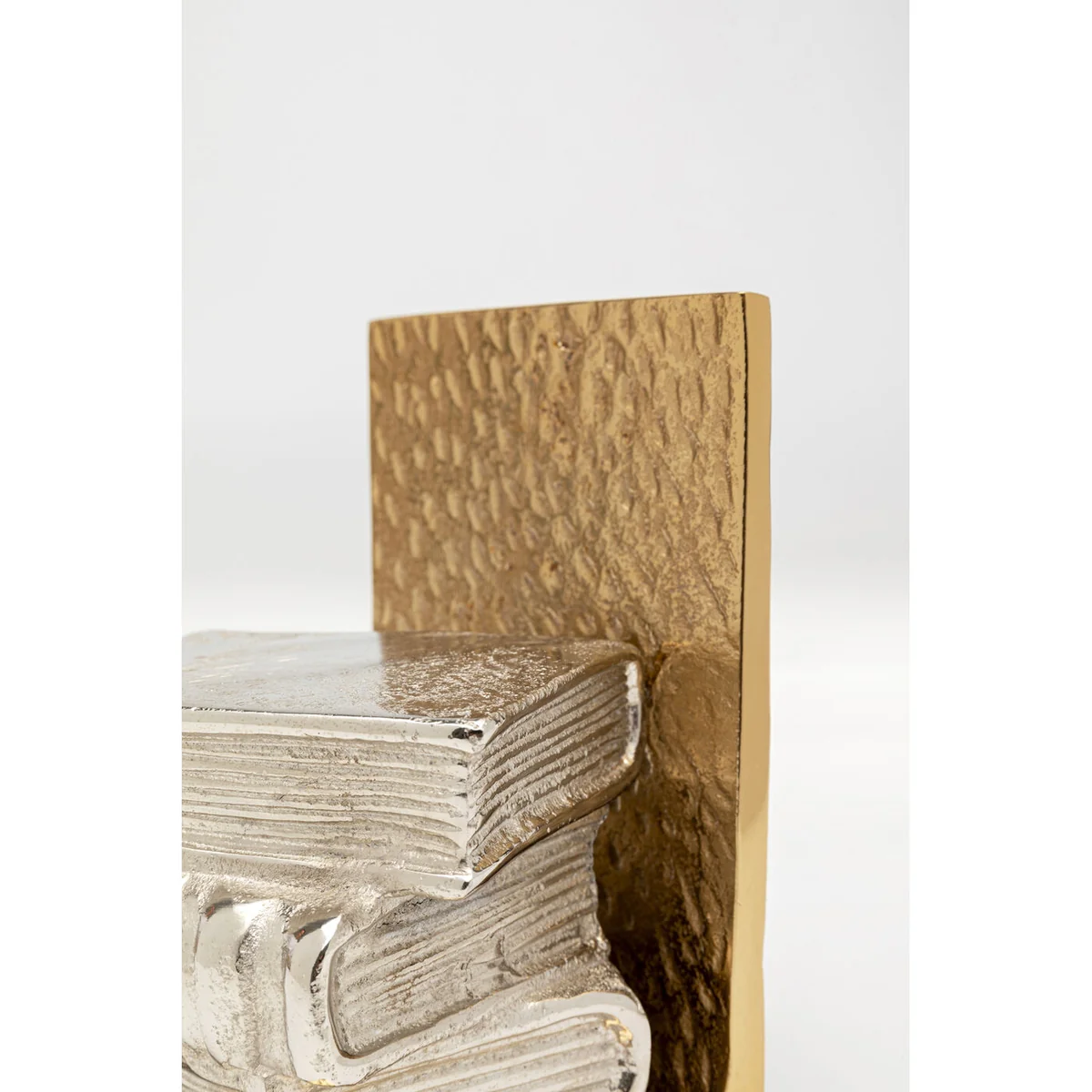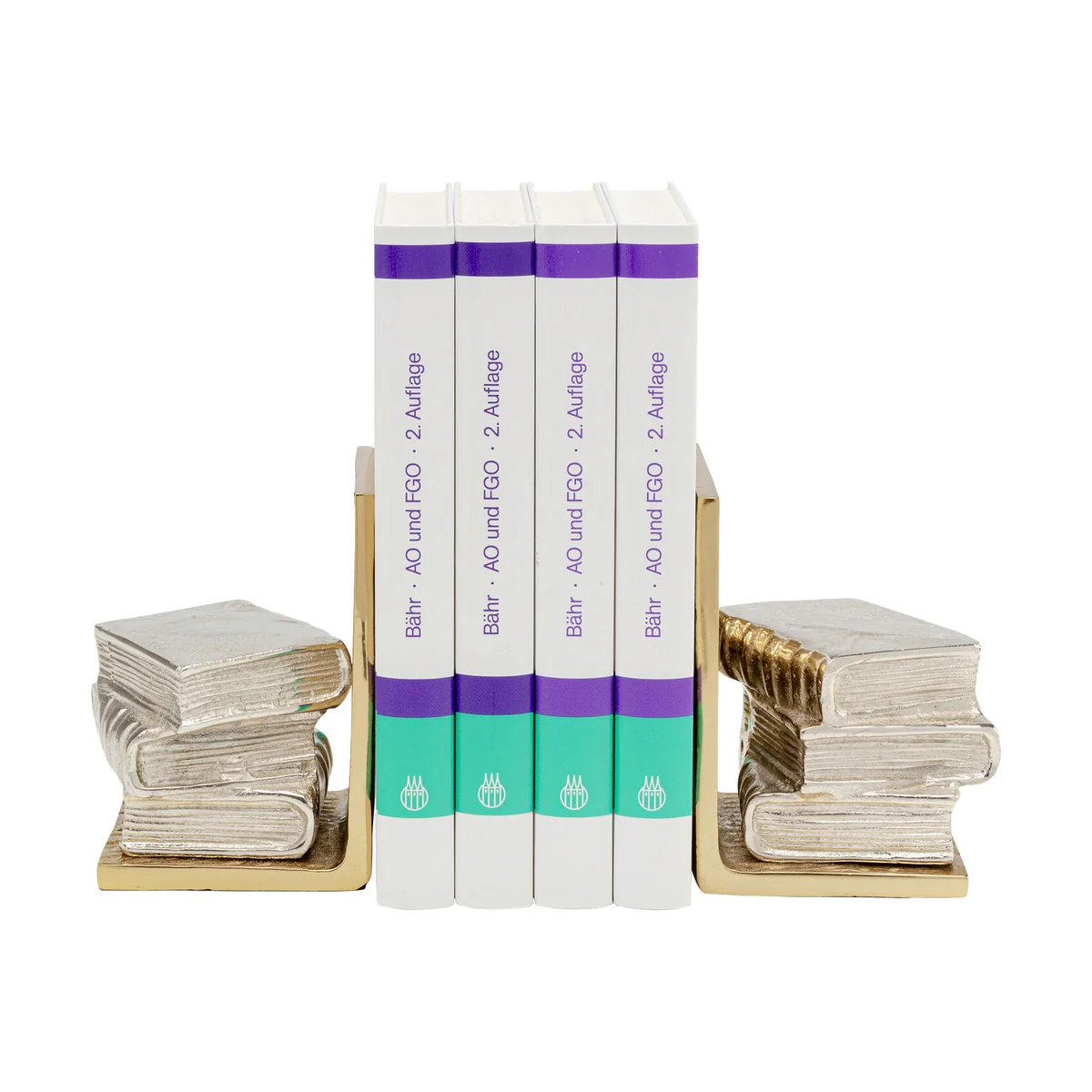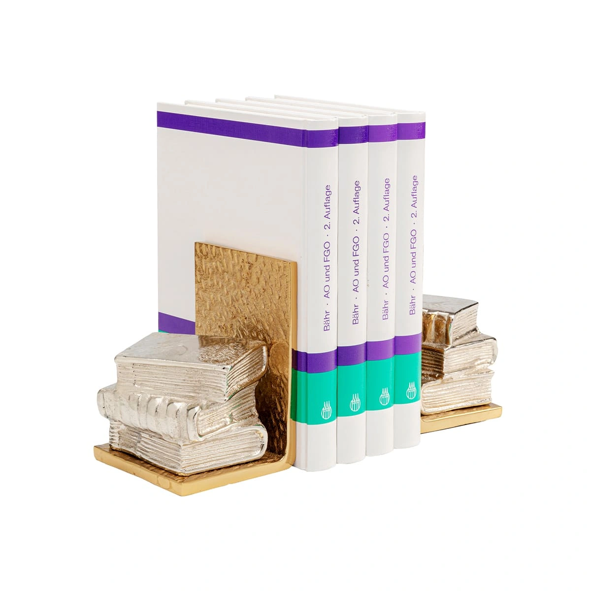 The set features a sturdy aluminum frame, coated in brass for a dignified glow. Each piece measures 23 x 15 x 12 cm, providing stable support for your books. Their golden hue combined with a silver 3D book design makes them an intriguing decorative element.