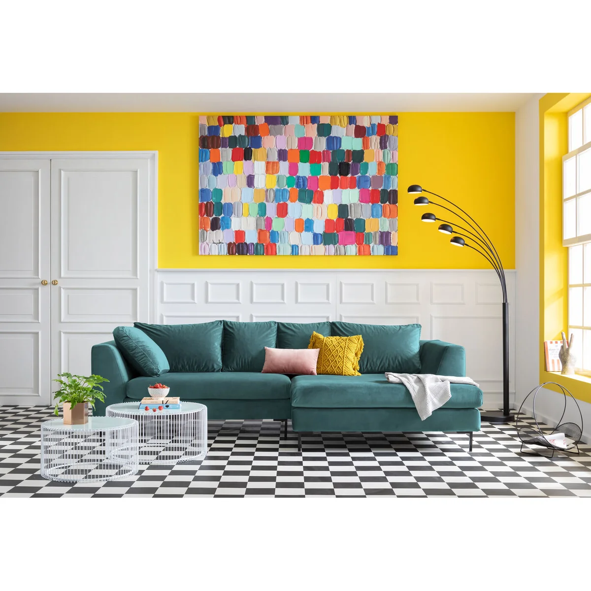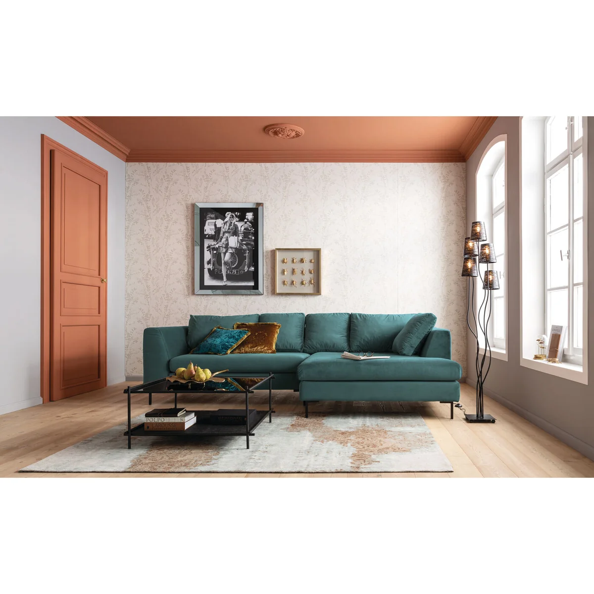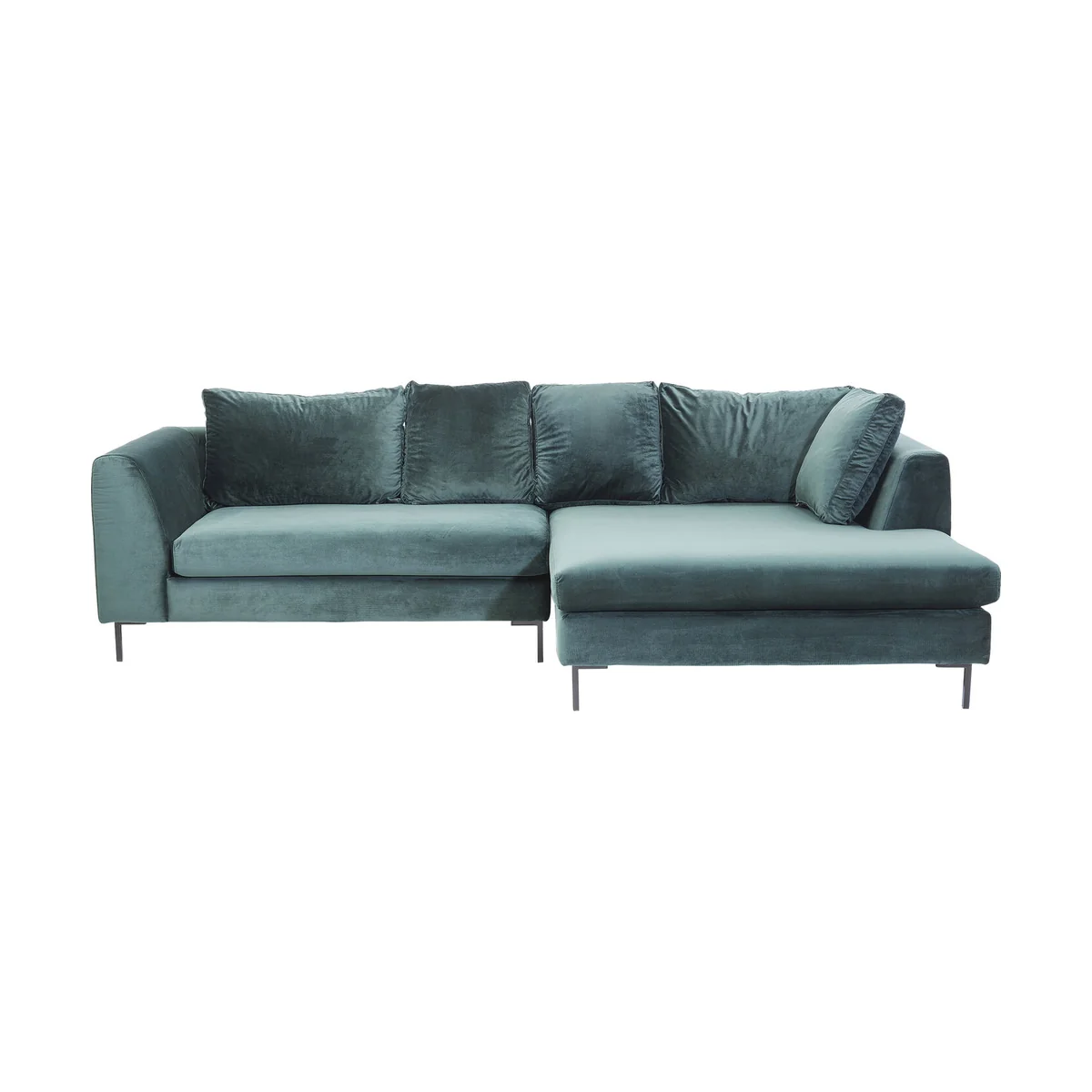 - Cosy corner sofa with recamiere in an elegant velvet look - Looks elegant rather than heavy, due to the clear design idiom - Timeless, unobtrusive design that matches many furnishing styles - The green velvet upholstery goes wonderfully with home accessories in the brass and copper look - Inviting chill zone for stylish relaxation