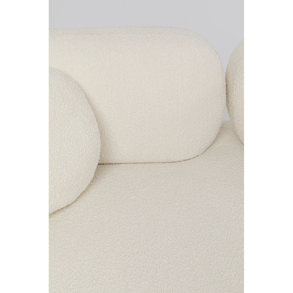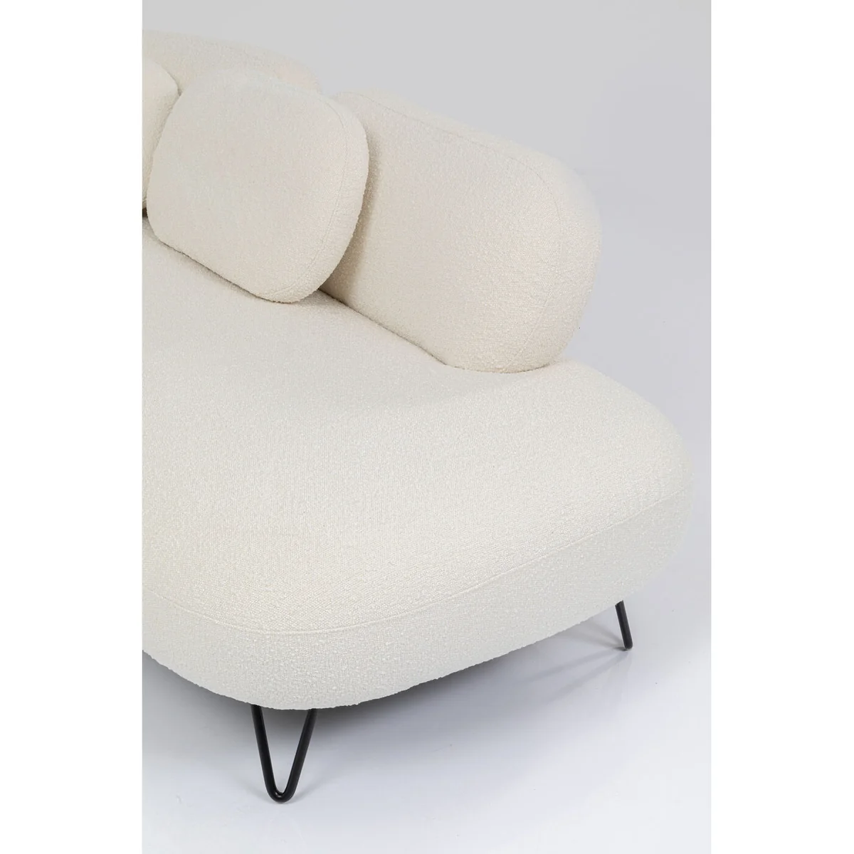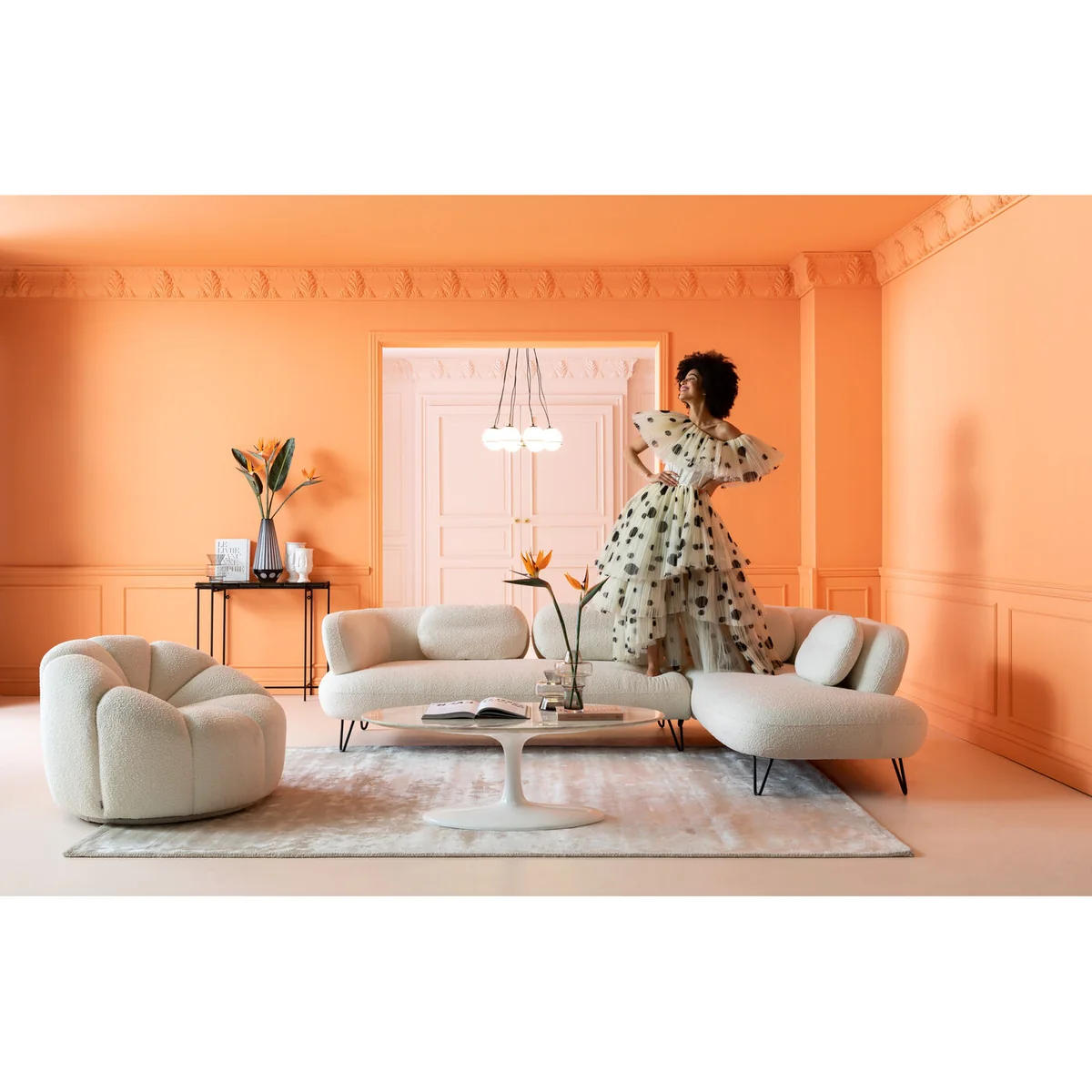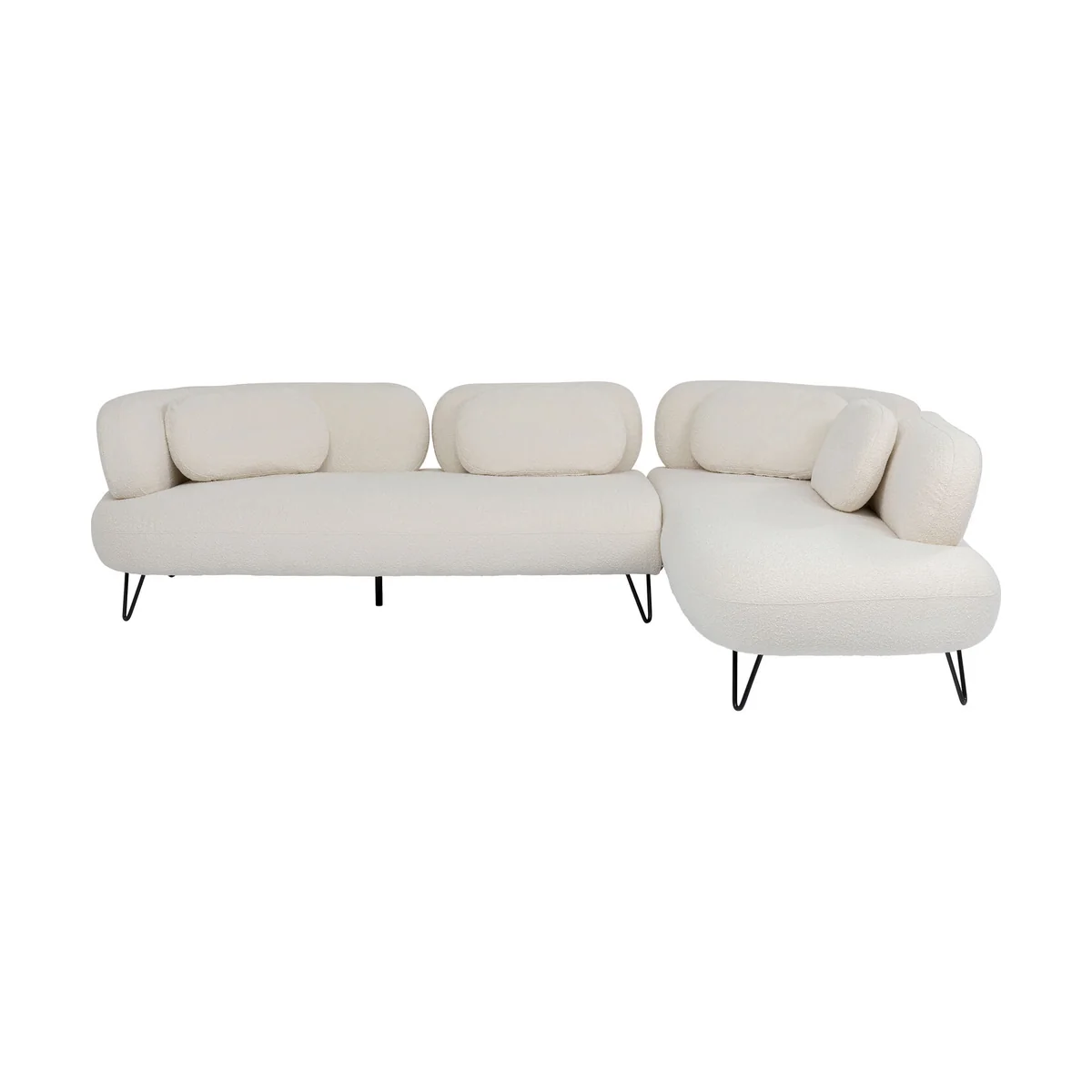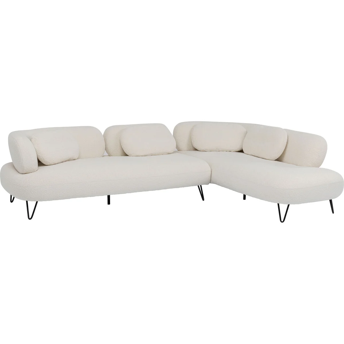 This white corner sofa comes with lots of style: from the backrests to the cushions, everything is organically and softly shaped. The powder-coated steel legs in hairpin form make the L-shaped couch look light and graceful. The cover in white, which is woven in bouclé style, is also modern. With its small loops and knots it displays a lively surface structure and enhances the look, just like the famous designer jackets made of the same fabric. No-sag springing and foam padding ensure pleasant seating comfort with a seat height of 43cm.