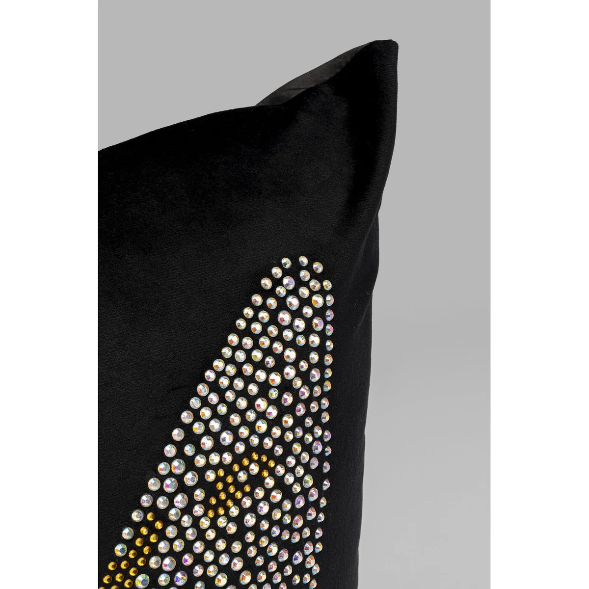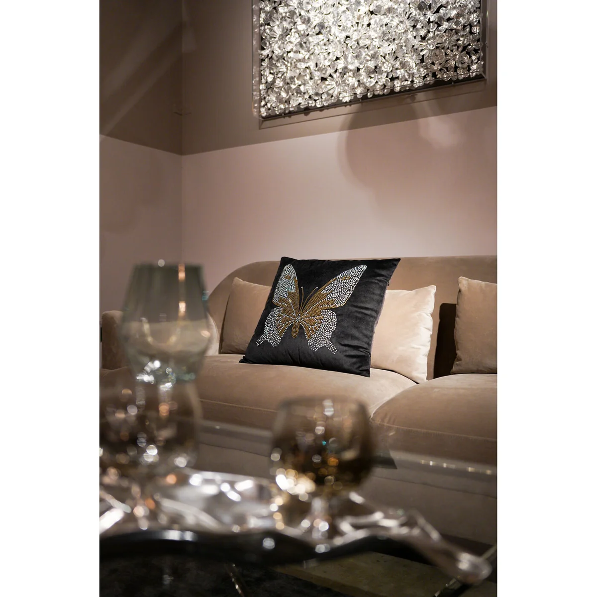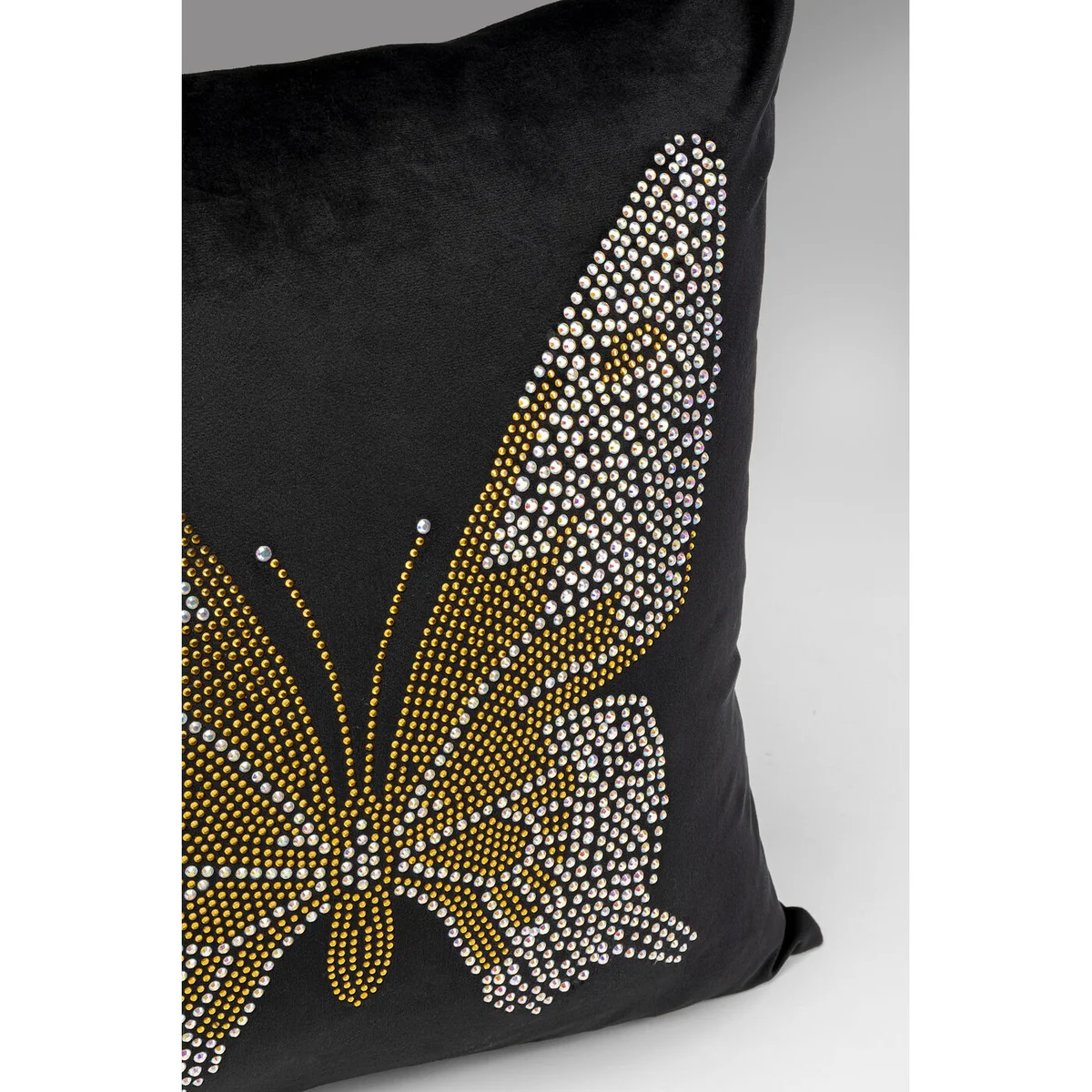 - A glittering ornamental cushion with show talent and a shimmering butterfly made of glass appliqués - The partly clear, partly coloured glass stones shimmer in silver, gold and all the colours of the rainbow - The velvety black throw pillow is a power upgrade for the sofa, bed and favourite armchair - And if there is a mishap, the square cover is removable and can be dry cleaned - The cushion filling made of cotton flock is included. The back of the sofa cushion comes in plain black
