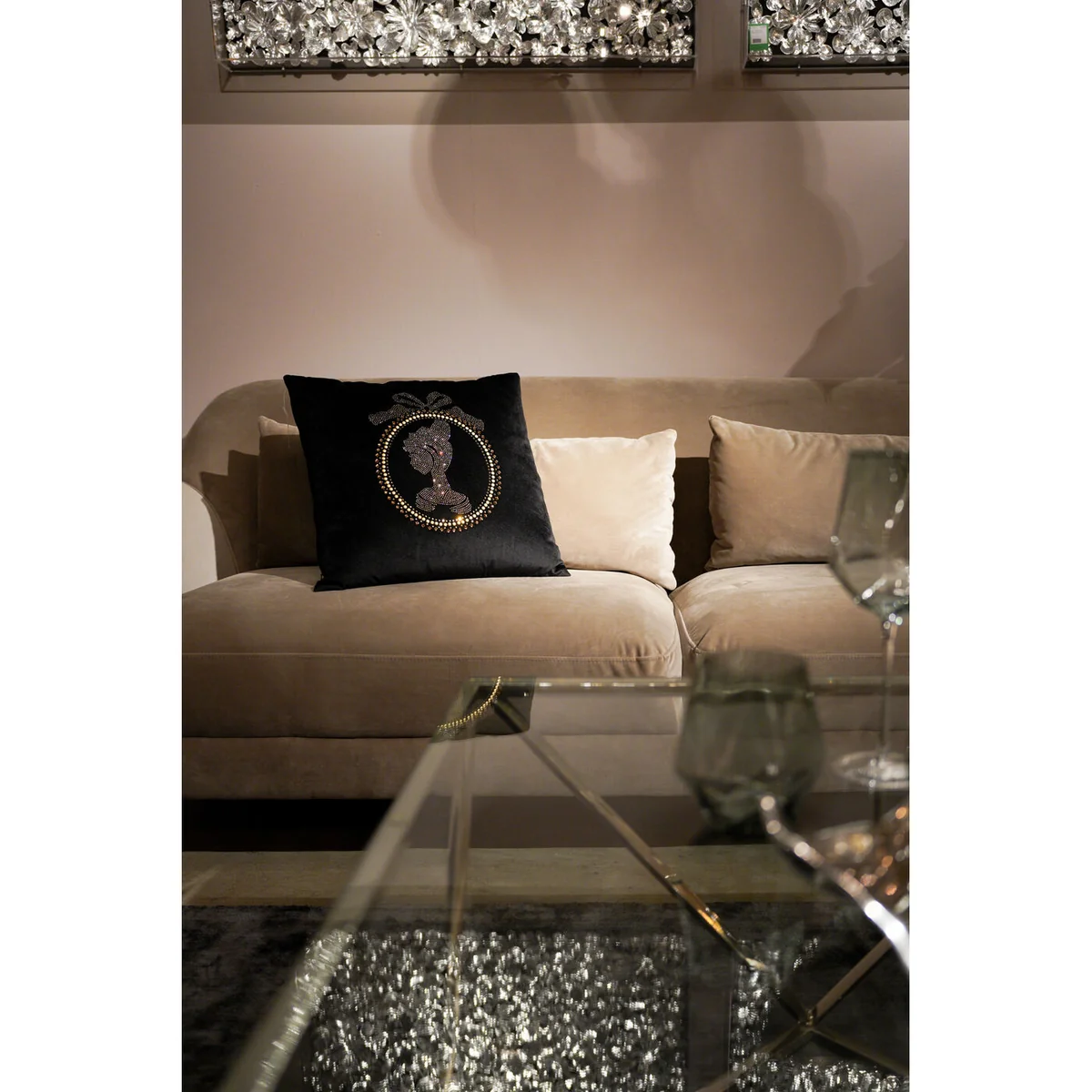 The cushion features a distinctive diamond medallion pattern that is meticulously crafted using 50% Glass Clear appliqué. The golden hue adds a rich warmth to any room, while the 45cm size makes it an ideal accent piece for sofas, chairs, and beds.