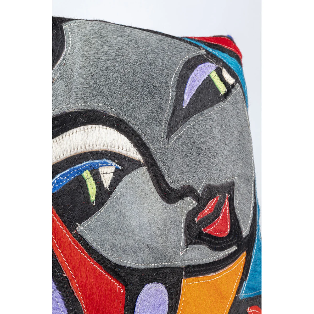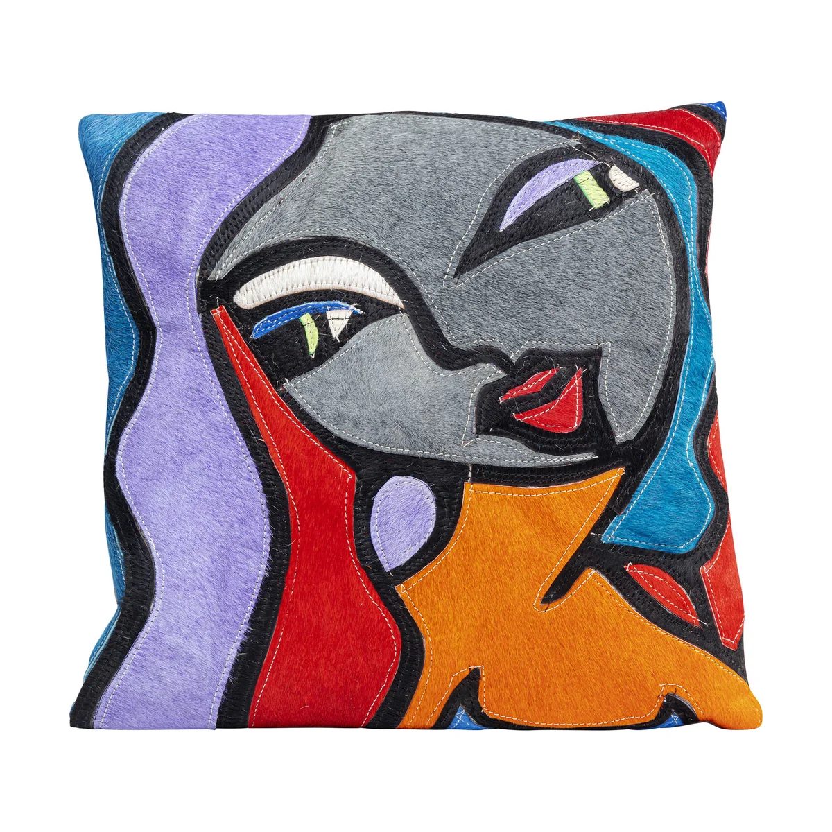 - A colourful, handmade decorative cushion measuring 40x40cm in grey, red, orange, lilac and blue - Made from dyed real hide pieces with a face art theme - Adorable unique patchwork as an eye-catcher on the sofa, armchair or bed - For all stylists who are not satisfied with any old thing when they buy cushions - Filling included