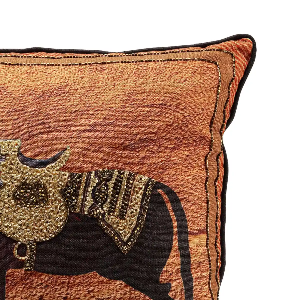 The cushion features a detailed brown horse motif set against a textured orange background, accentuated by sparkling rhinestone details that bring the design to life. It measures 45 x 45 cm, making it an ideal size for a sofa, armchair, or bed. The velvet cover, filled with 100% polyester, is removable and easy to clean.